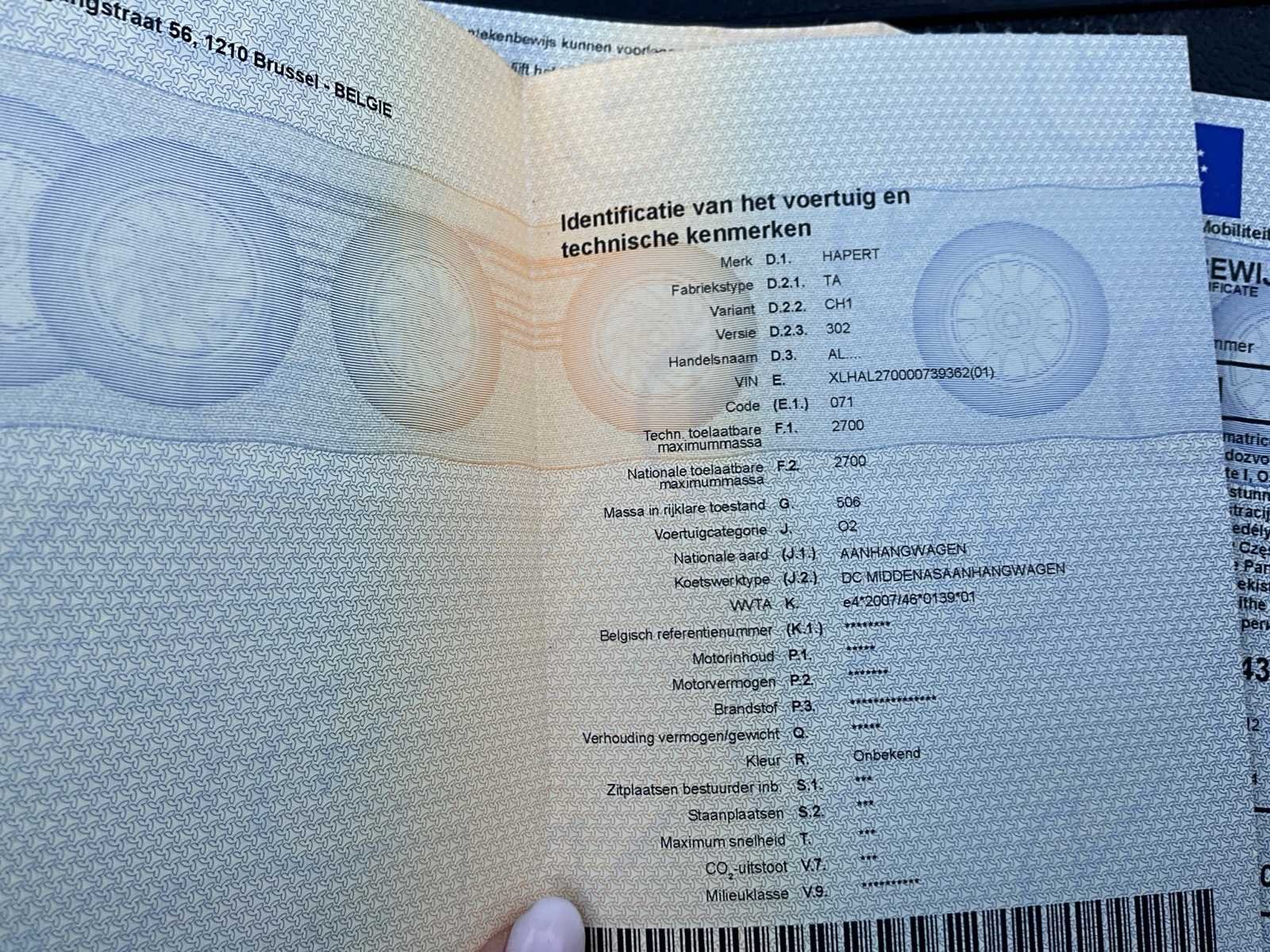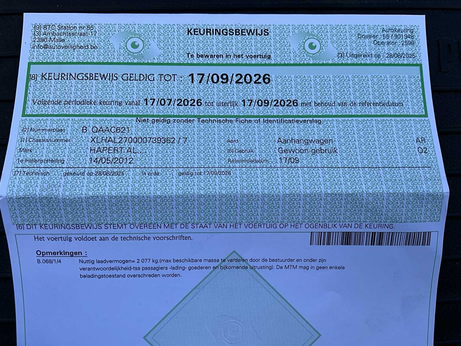 Geldige technische keuring tot 17/9/2026 zonder opmerkingen - MTM 2700kg No Merk: Hapert TA / AL Bouwjaar: 2012 Chassisnummer: XLHAL270000739362 Aantal assen: 2 Laadbak afmeting l: 3350cm Ledig gewicht: 623kg Datum eerste toelating: 14/5/2012 Kentekenpapieren compleet?: true Lengte: 4660cm Breedte: 1860cm Nationaliteit documenten: B