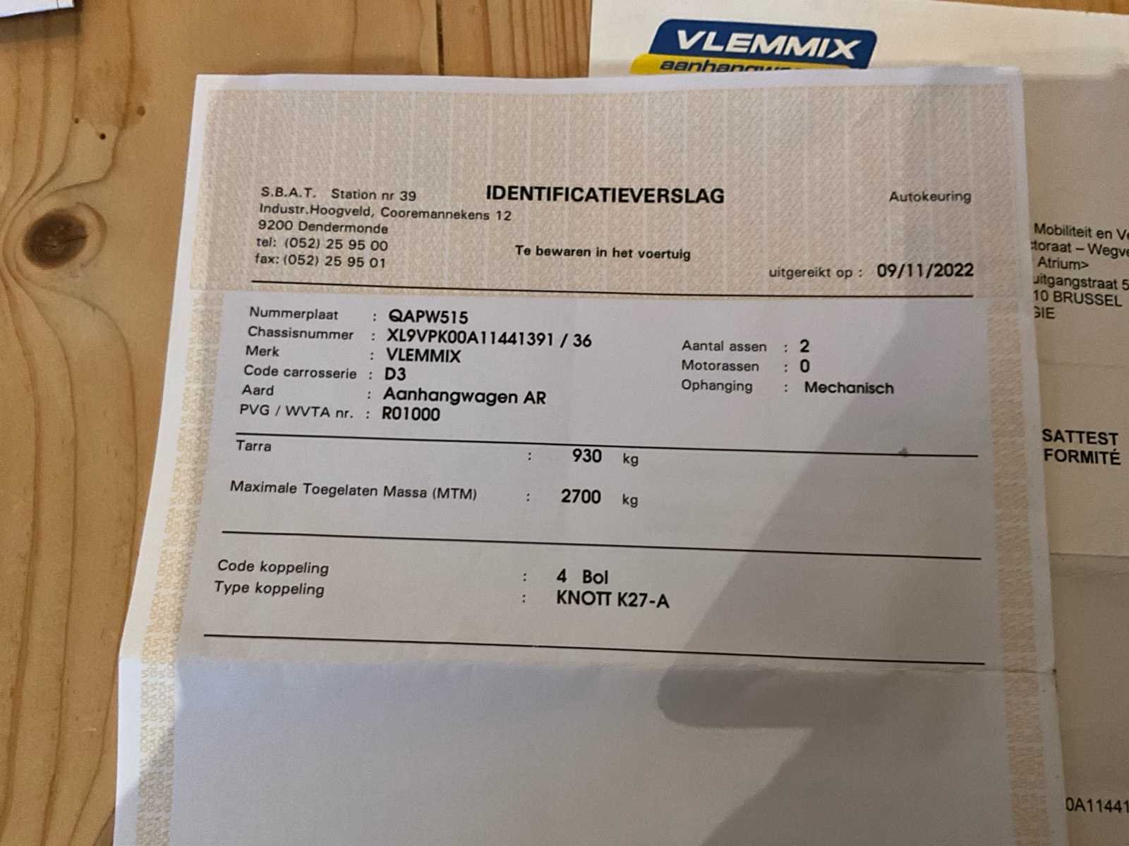 Bash scheurvrij Gekeurd tot 09112026 4000x10800x2000 Geremd 2 rijplaten Achteraansteunen Achterbash is zelf oprollend Vooraan deur Winch aanwezig 2 reserve wielen aanwezig No Merk: Vlemmix Model: VP2700 Bouwjaar: 2012 Chassisnummer: XL9VPK00A11441391 Aantal assen: 2 Gesloten opbouw: true Datum eerste toelating: 23032012 Nationaliteit documenten: Belg