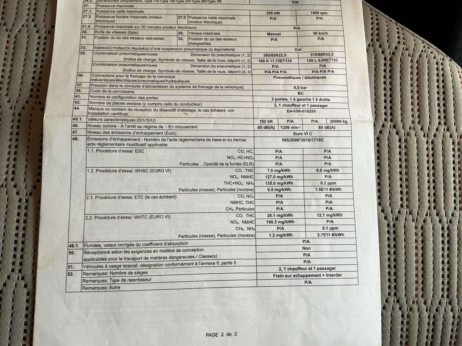 Deze DAF XF 480 FT trekker van eerste inschrijving 13 april 2018 is uitgerust met de krachtige en betrouwbare MX-13 motor (12.9 liter) met een vermogen van 480 pk (355 kW) en voldoet aan de Euro VI emissienorm. Het voertuig heeft een kilometerstand van 591.492km en is voorzien van een manuele versnellingsbak en luchtgeveerde ophanging, wat zorgt voor optimaal rijcomfort en stabiliteit. Het betreft een 4x2 trekker met een wielbasis van 3.800 mm en een JOST JSK50-X koppelschotel met een maximale koppellast van 10.640 kg. De technisch toegelaten maximummassa bedraagt 20.500 kg, met een maximaal treingewicht van 44.000 kg. Het ledig gewicht bedraagt 8.006 kg. De trekker is uitgerust met bandenmaat 385/65R22.5 en 315/80R22.5. De cabine biedt plaats aan 2 personen en het voertuig is begrensd op 90 km/u. De laatste keuring is geldig tot 27 juli 2024. Deze DAF XF staat bekend om zijn degelijkheid, efficiënt brandstofverbruik en comfortabele rijervaring, en is geschikt voor nationaal en internationaal transport. Ideaal voor transportbedrijven of zelfstandige chauffeurs die op zoek zijn naar een betrouwbare en krachtige trekker. No Merk: DAF Type: XF 480 FT Bouwjaar: 2018 Chassisnummer VIN: XLRTEH4300G201846 Cilinderinhoud: 12902cc Kilometerstand bij opname: 591492km Datum eerste toelating: 13/04/2018 Type transmissie: Handmatig Fuel Type: Diesel Emissieklasse: Euro 6 Slaapcabine: true Startinformatie: Start, rijdt en remt Afgelezen kilometerstand: 591492km Nationaliteit documenten: België Aantal zitplaatsen: 2 Handgeschakelde versnellingsbak: true Diesel: true