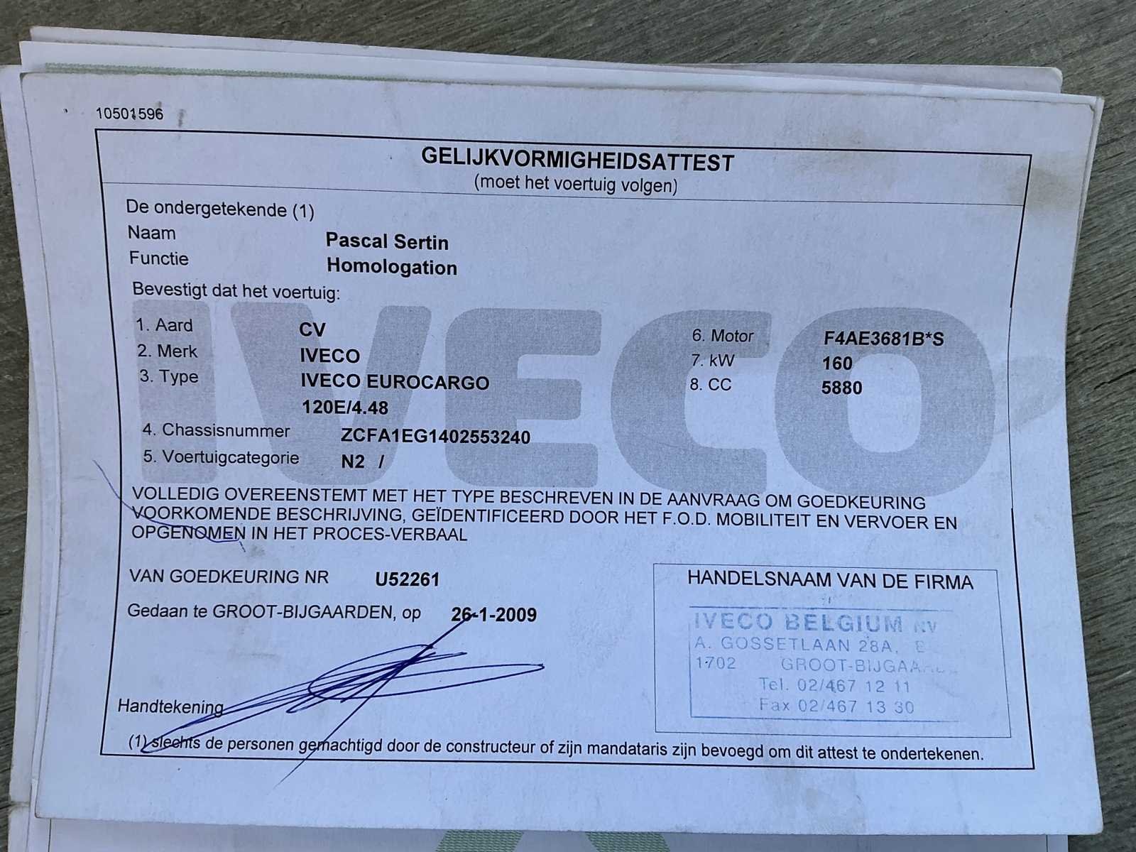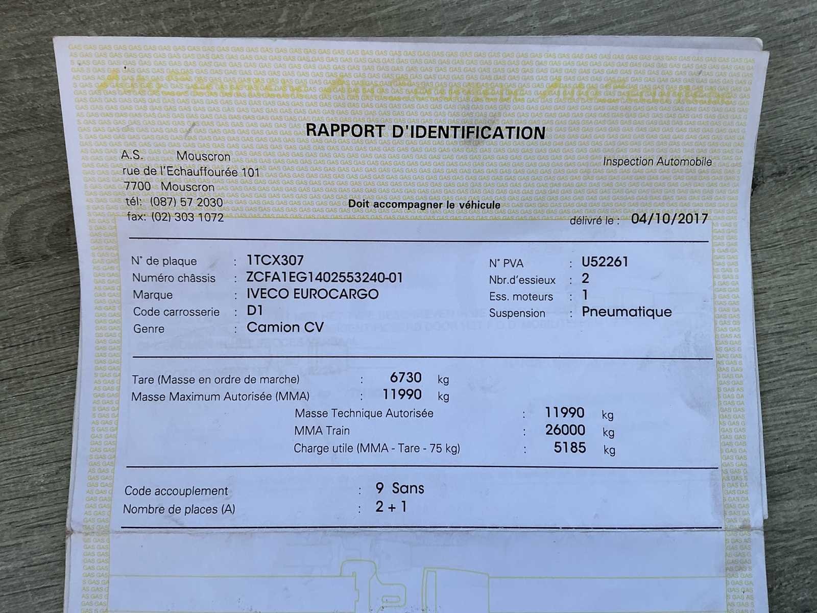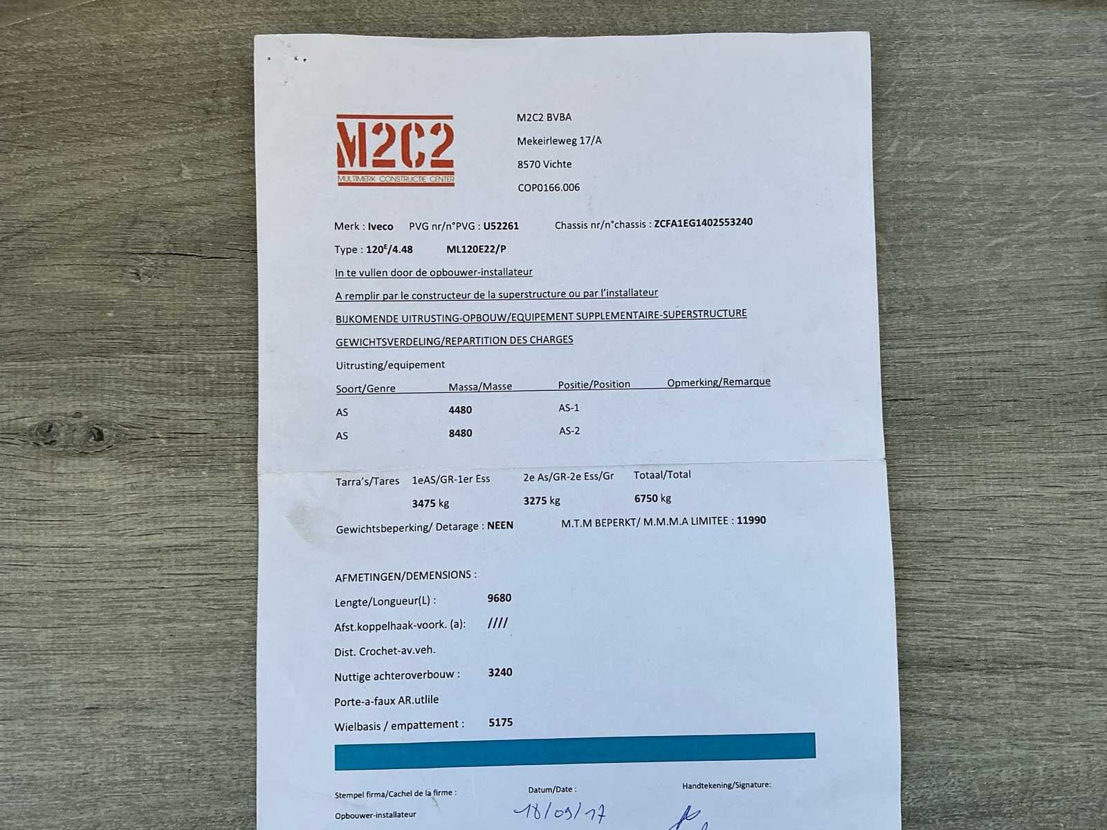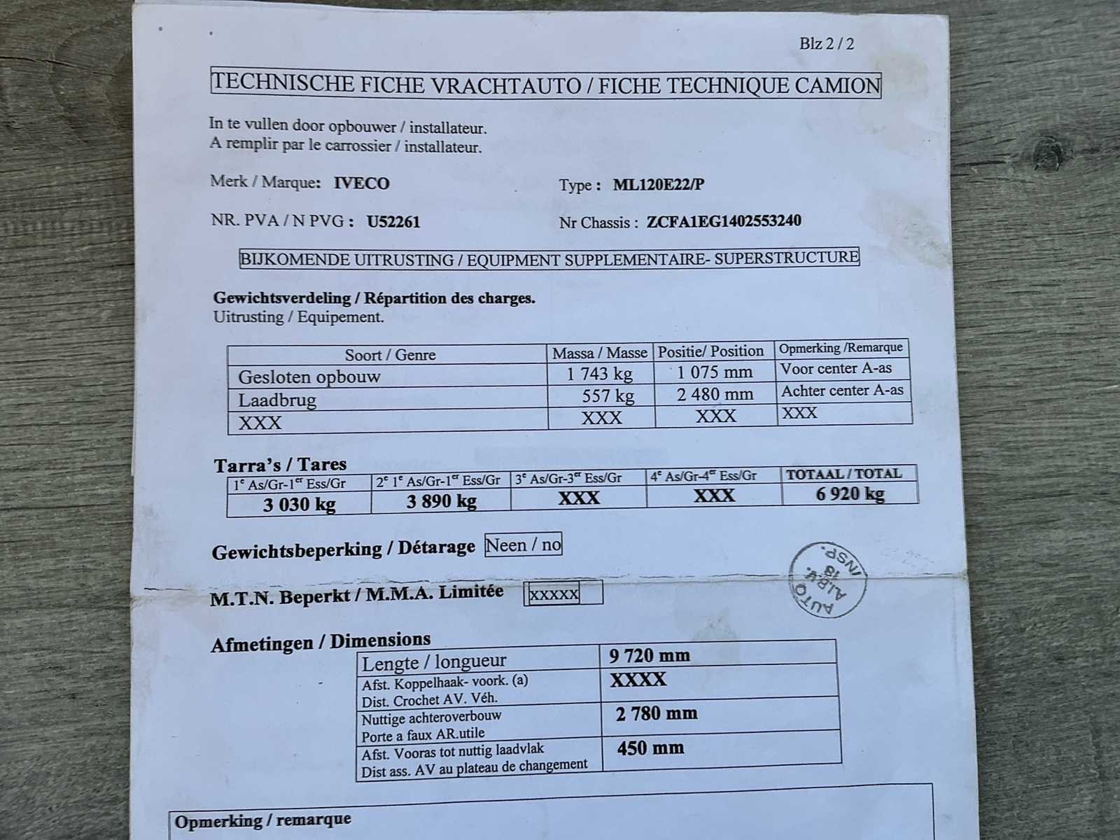 Deze Iveco Eurocargo vrachtwagen met gesloten kastopbouw en laadbrug vormt een uiterst praktische en veelzijdige oplossing voor transport- en servicegerichte activiteiten. Dankzij de combinatie van een ruime laadbak, geïntegreerde opbergmodule en oprijrampen is dit voertuig bijzonder geschikt voor het vervoeren van materialen, machines of werkmaterieel. De vrachtwagen is uitgerust met een betrouwbare dieselmotor van 160 kW en een manuele transmissie, wat garant staat voor duurzame prestaties en gebruiksvriendelijkheid. Met een maximaal toegelaten massa van 11.990 kg en een nuttig laadvermogen van circa 5 ton biedt dit voertuig een uitstekende balans tussen capaciteit en flexibiliteit. De opbouw omvat een gesloten kast met interne rekken en opbergmogelijkheden, ideaal voor servicevoertuigen of mobiele werkplaatsen. Achteraan zijn aluminium oprijrampen voorzien, waardoor ook rollend materieel eenvoudig geladen kan worden. De combinatie van laadruimte en plateau maakt deze vrachtwagen inzetbaar voor uiteenlopende toepassingen binnen bouw, techniek en logistiek. Het voertuig beschikt over een geldige technische keuring tot oktober 2026 en vertoont normale gebruikssporen conform leeftijd en kilometerstand. Enkele lichte opmerkingen werden vastgesteld, waaronder beginnende corrosie aan het chassis, zonder directe impact op de inzetbaarheid. Kortom, een functionele en direct inzetbare Iveco Eurocargo die zich onderscheidt door zijn praktische opbouw en brede inzetmogelijkheden, ideaal voor professionals die op zoek zijn naar een veelzijdige transportoplossing. No Merk: Iveco Type: Eurocargo Bouwjaar: 2009 Chassisnummer VIN: ZCFA1EG1402553240 Cilinderinhoud: 5880cc Kilometerstand bij opname: 284075km Datum eerste toelating: 15/05/2009 Type transmissie: Handmatig Aantal assen: 2 Fuel Type: Diesel Emissieklasse: Euro 5 Startinformatie: Start, rijdt en remt Afgelezen kilometerstand: 284075km Nationaliteit documenten: België Kentekenpapieren compleet?: true Aantal zitplaatsen: 3 Handgeschakelde versnellingsbak: true Diesel: true