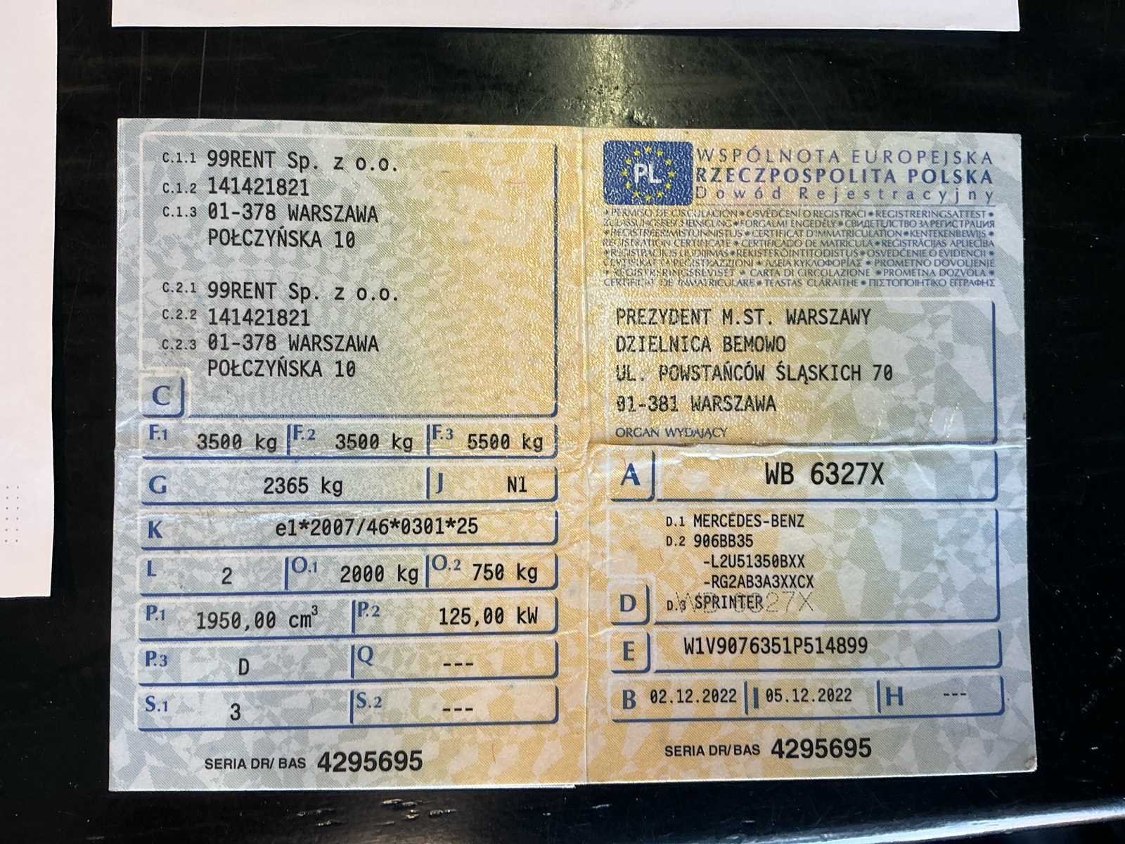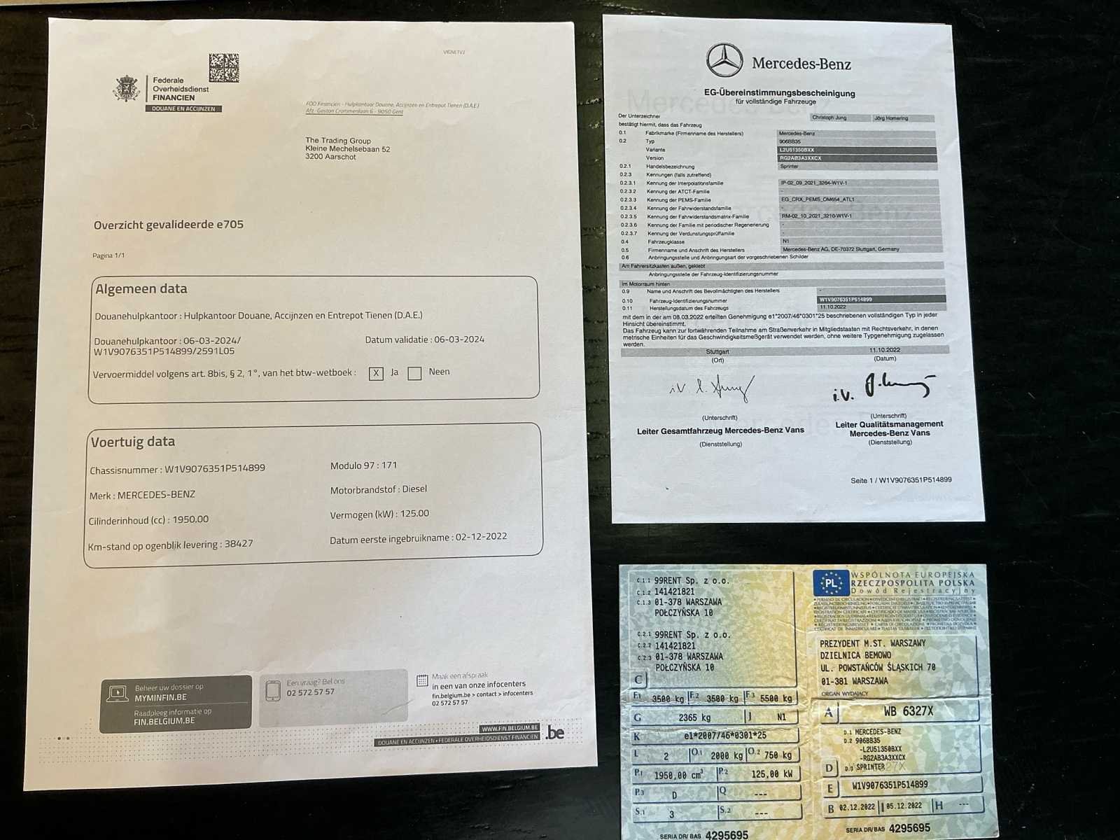 Zwarte Mercedes-Benz Sprinter L3H2 bedrijfswagen in nette staat, voorzien van automatische transmissie en krachtige 170 pk dieselmotor. Bouwjaar 2022 met circa 38.500 km, uitgerust met vier deuren en volledig inzetbaar voor professioneel gebruik. Ideaal voor transport en logistieke toepassingen, inclusief complete documentatie en exportmogelijkheid. Met normale gebruik sporen volgens leeftijd en kilometerstand. Zie foto's. Nee Merk: Mercedes-Benz Type: L3H2 Model: Sprinter Chassisnummer: W1V9076351P514899 Afgelezen kilometerstand: 38537km Cilinderinhoud: 1950cc Vermogen (kW): 125kW Brandstof: Diesel Datum eerste inschrijving: 02/12/2022 Transmissie: Automatisch Aantal zitplaatsen: 3 Kleur: Zwart Nationaliteit documenten: Pools Stuurwiel: LHD Aantal deuren: 4 Aantal sleutels: 2 Vermogen (pk): 170 Aantal cilinders: 4 Velgmaat: 16" Kentekenpapieren compleet?: true Boorddocumenten aanwezig?: true Self drive export possible : true