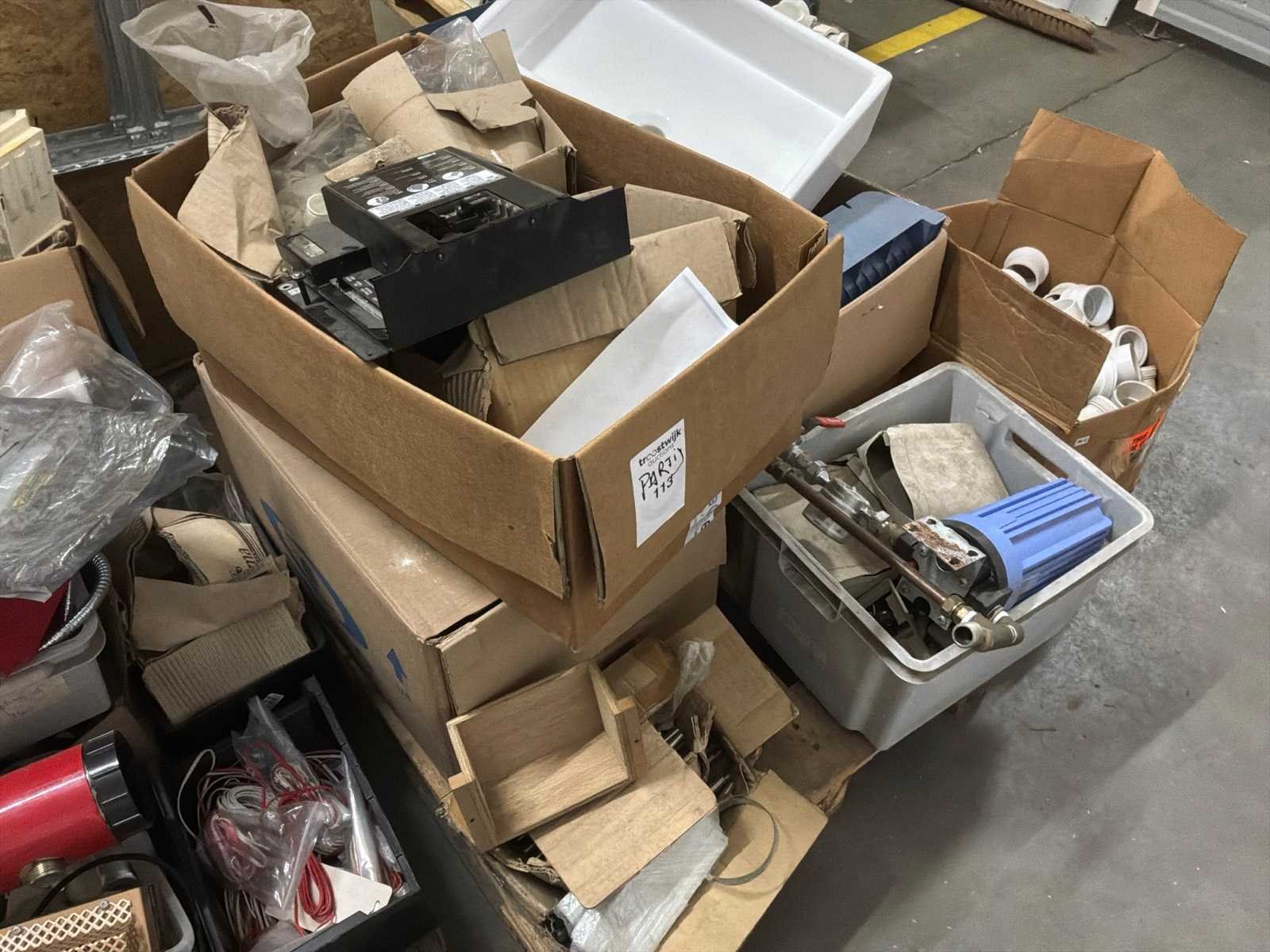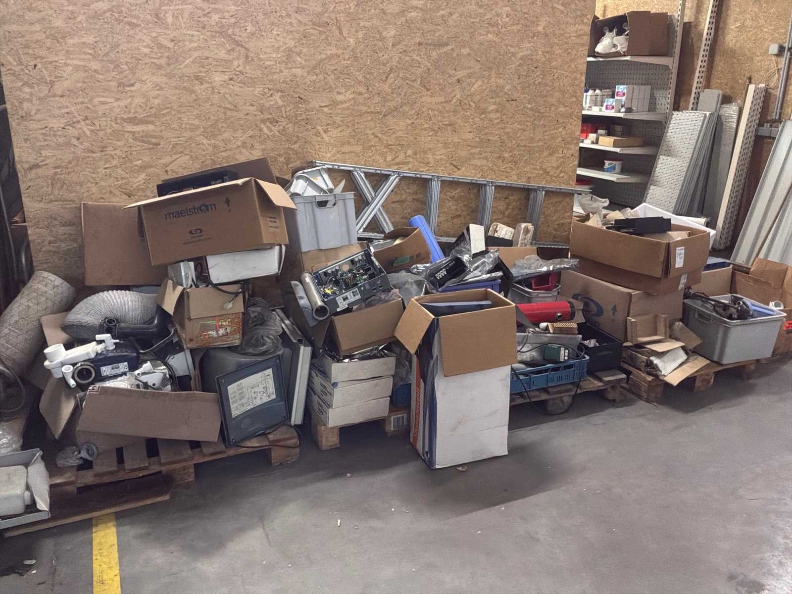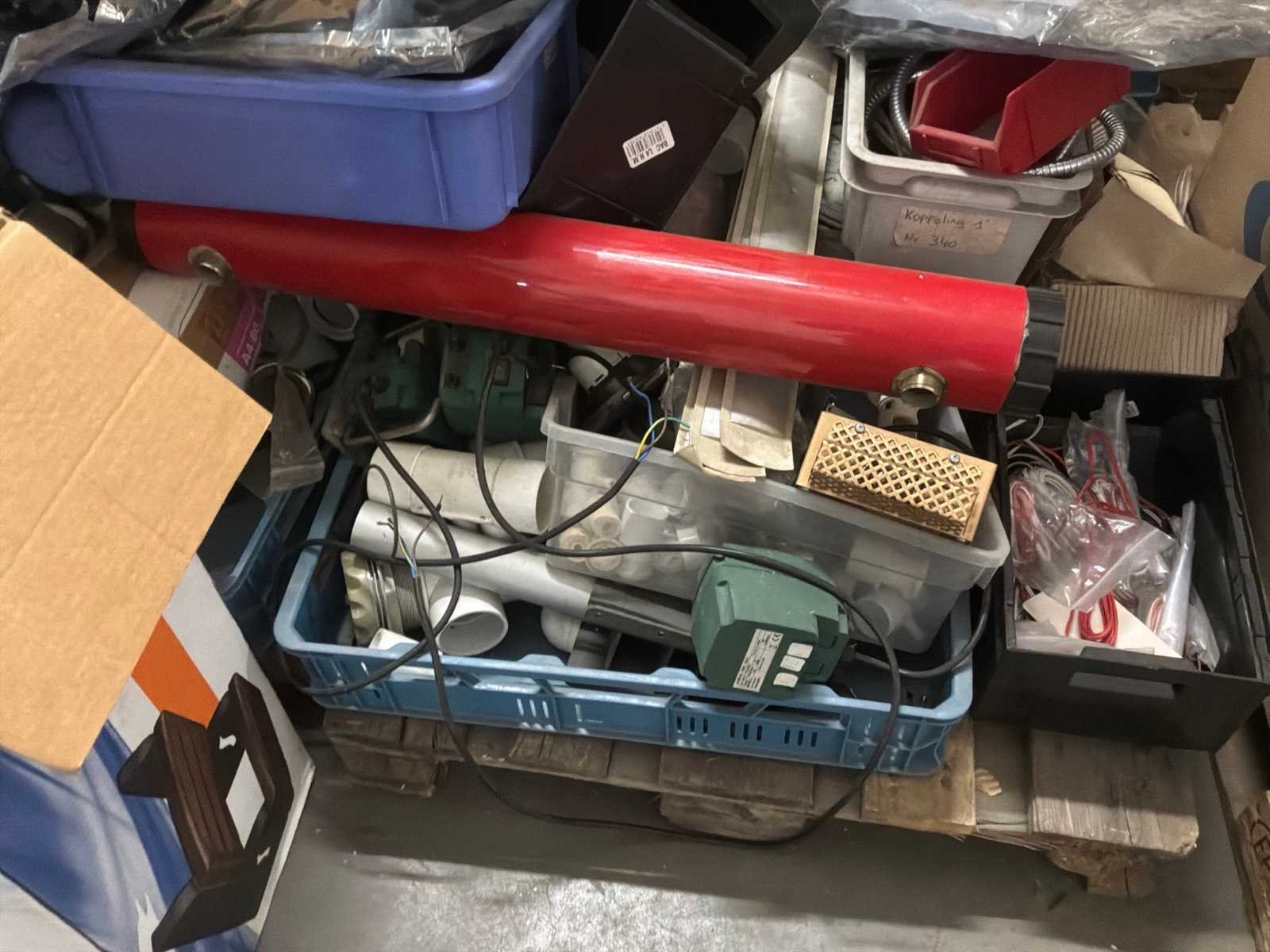 Lot verdeeld over 4 paletten bestaand uit een mix van pvc-buizen, plastic opbergbakken, verlengsnoeren, wasbak, stelling, … Nee