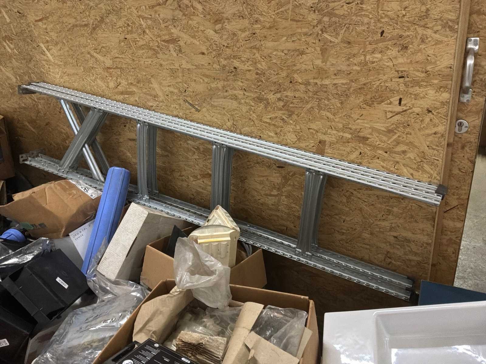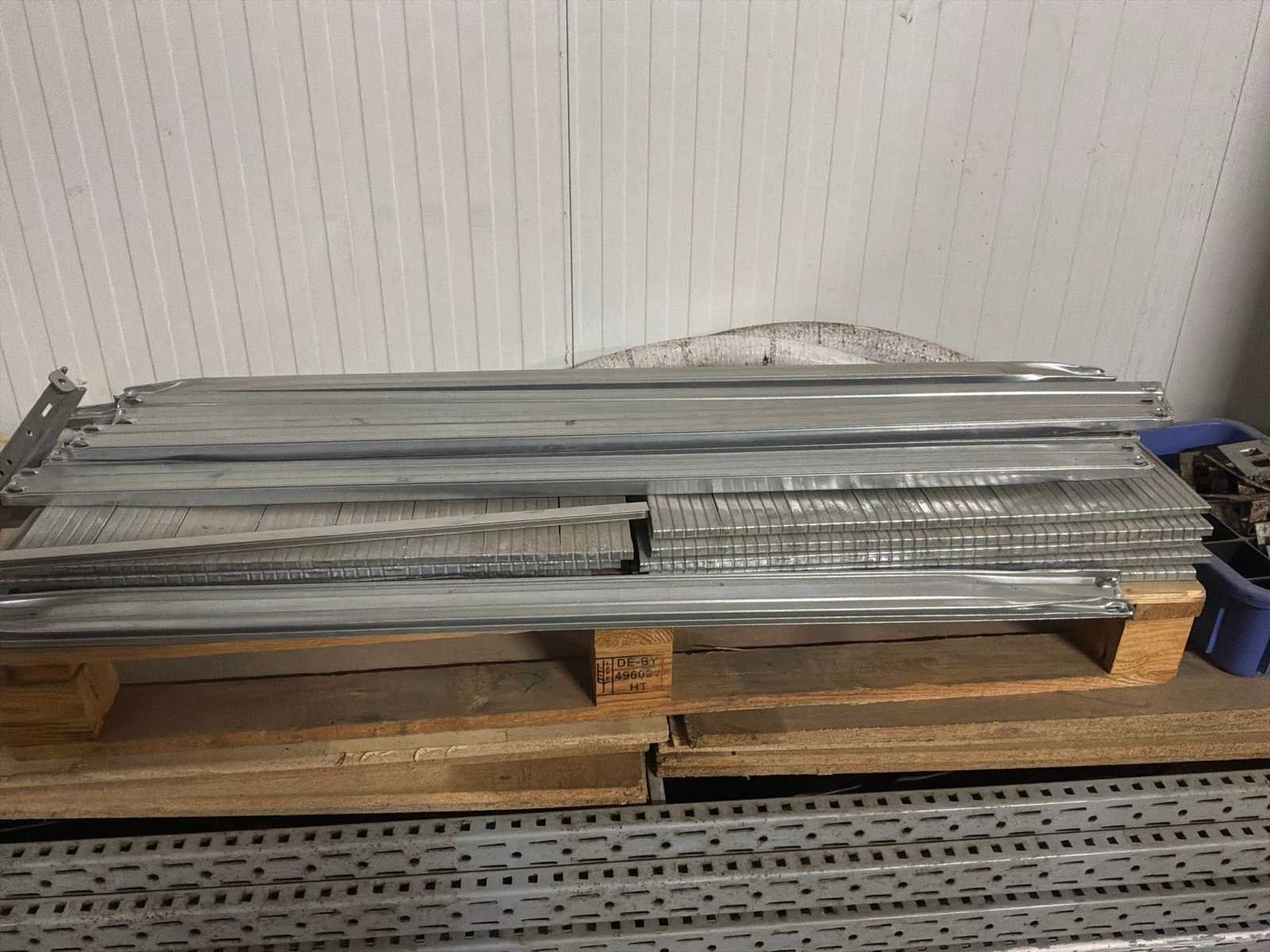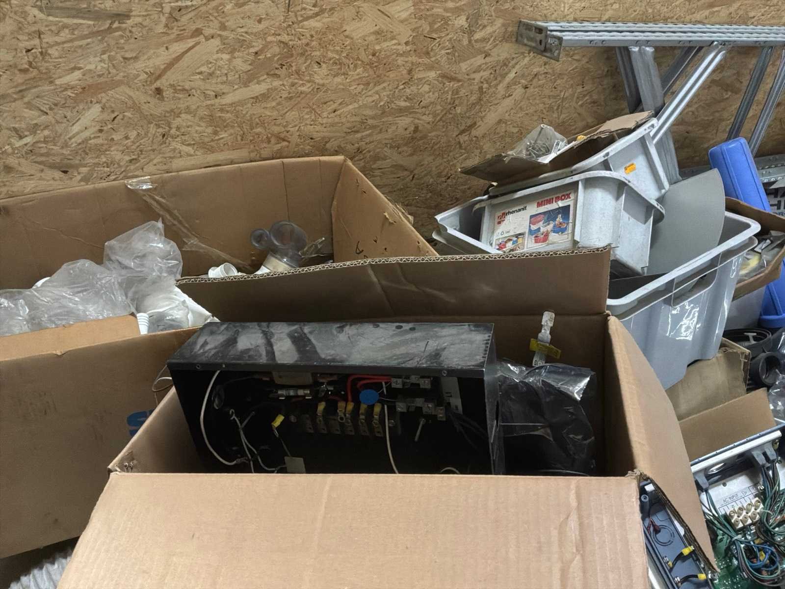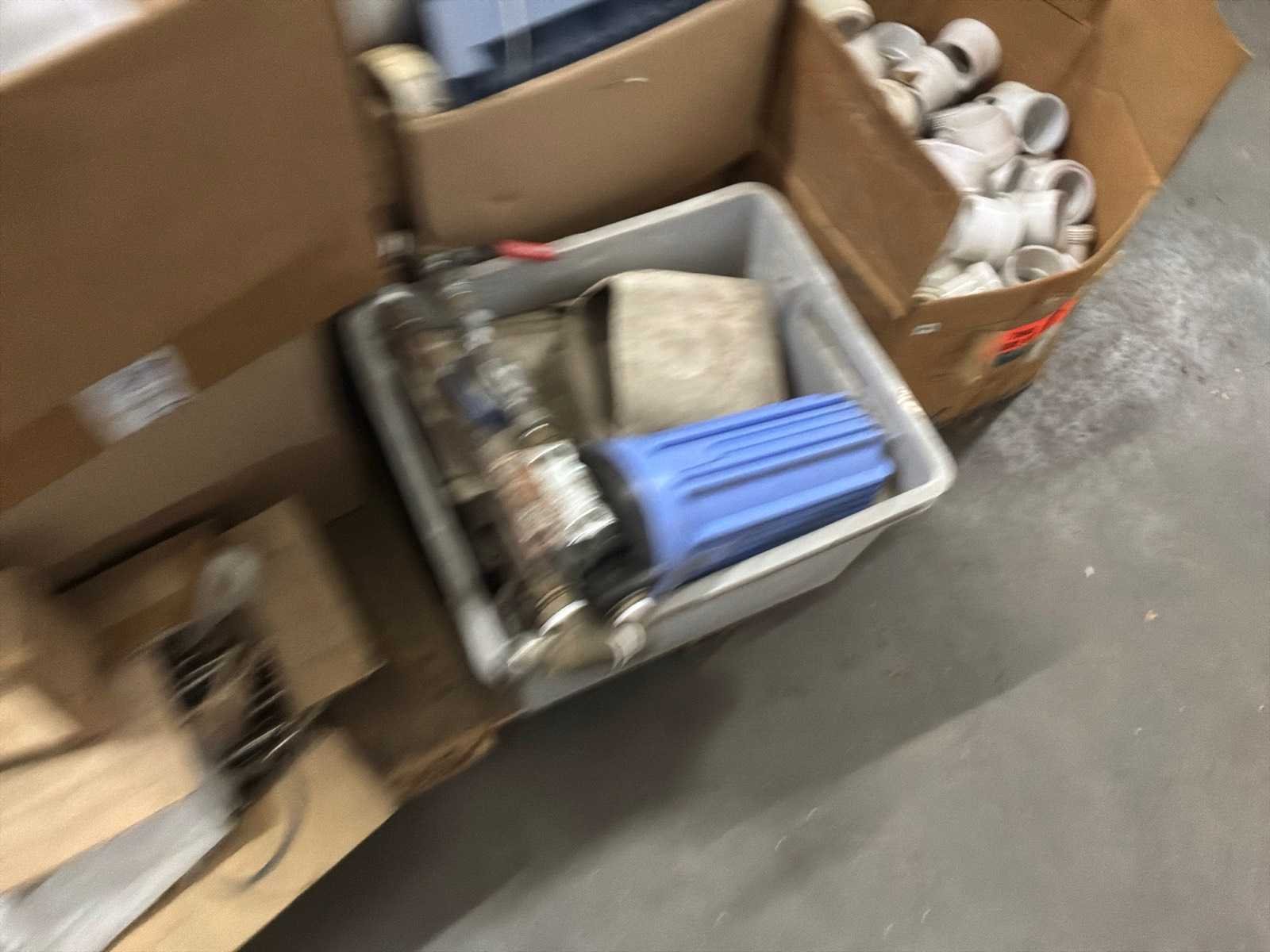 Lot verdeeld over 4 paletten bestaand uit een mix van pvc-buizen, plastic opbergbakken, verlengsnoeren, wasbak, stelling, … Nee