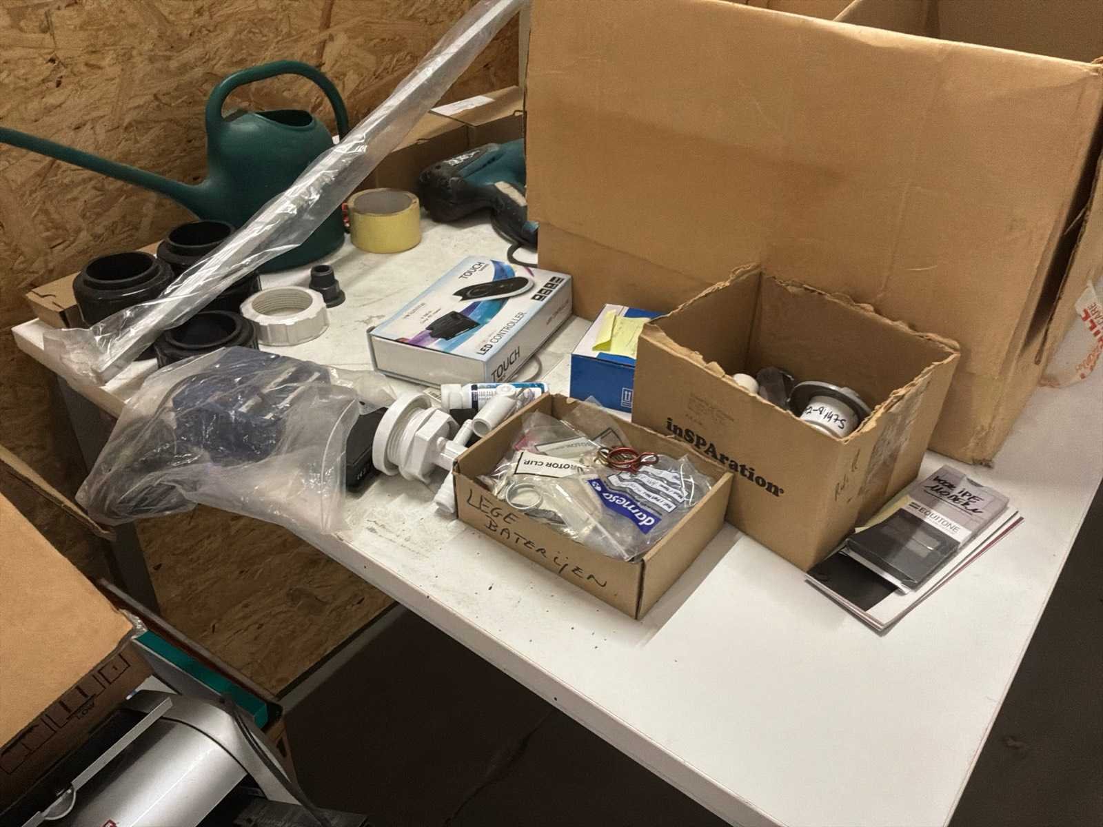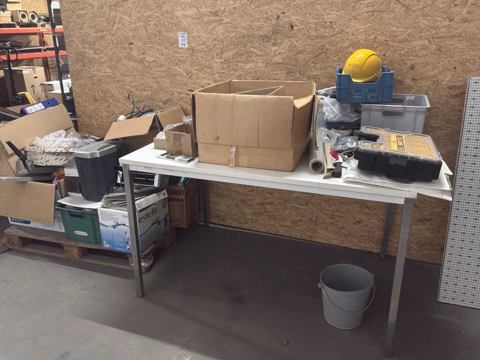 1 tafel, 1 pallet met diverse bureau artikelen, werkkoffer, diverse gereedschappen, … Nee