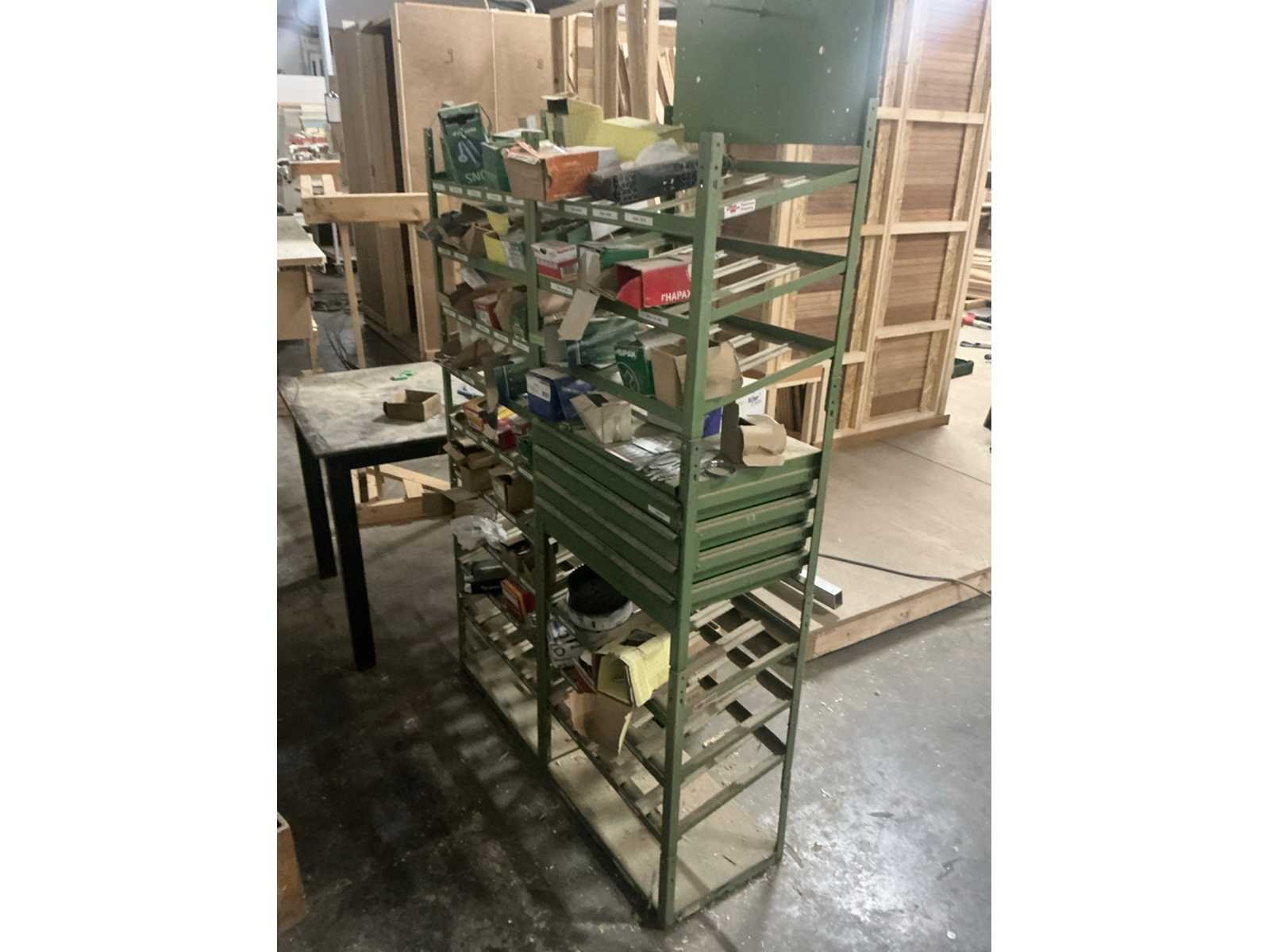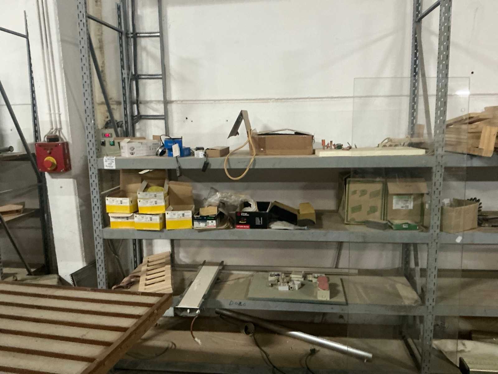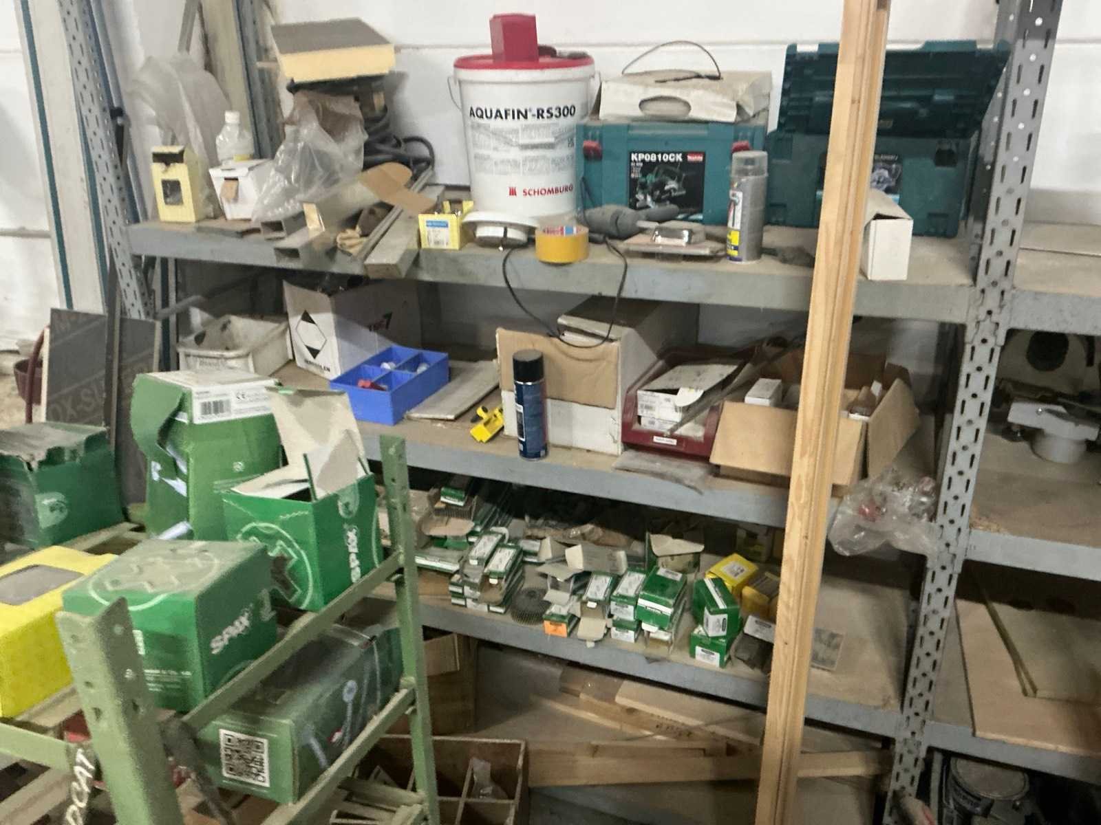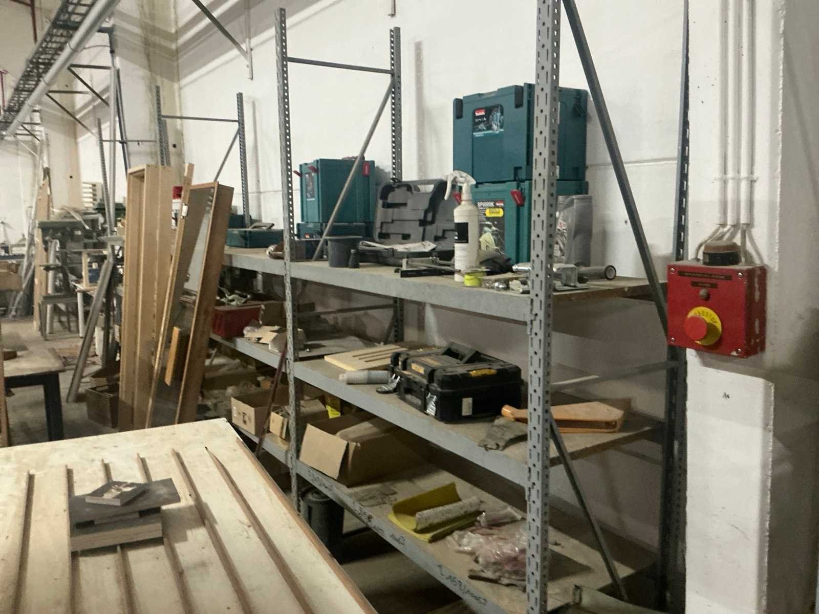 Met inhoud waaronder. Diverse lege machine koffers Makita. Schuurschijfjes. Kleine handgereedschappen enz. Sectie breedte 150-200cm. Circa 10 meter. Nee Aantal staanders: 8 Aantal legborden: 24 Demontabel: true Geconstrueerd: true Totale afmeting Breedte: 600cm Totale afmeting Hoogte: 250cm
