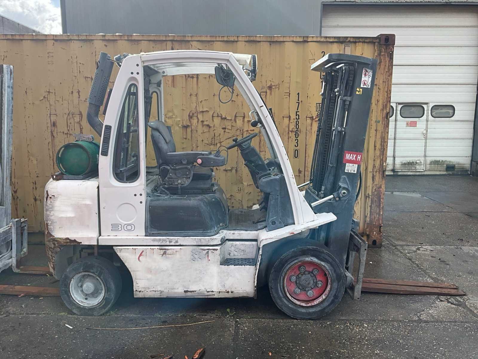 Voorzien van semi gesloten cabine, LPG fles niet inbegrepen, automaat, Motor draait maar is niet werkend door foutmelding, opstartcode 3345, zonder verdere gegevens Nee Merk: Nissan Type: UG1D2A30LQ Bouwjaar: 2017 Serienummer: UG1D2E701915 Brandstof: LPG Mast: Triple Soort band: Volrubber banden Aantal wielen: 4 Free-lift: true Side-shift: true Triple mast: true Eigen gewicht: 4606kg Hefvermogen: 3000kg Lepellengte: 1150mm Hefhoogte: 4750mm Vol rubber banden: true Minimale doorrijhoogte: 2100mm Totale afmeting L: 3000mm Totale afmeting Breedte: 1250mm Totale afmeting Hoogte: 2100mm LPG: true