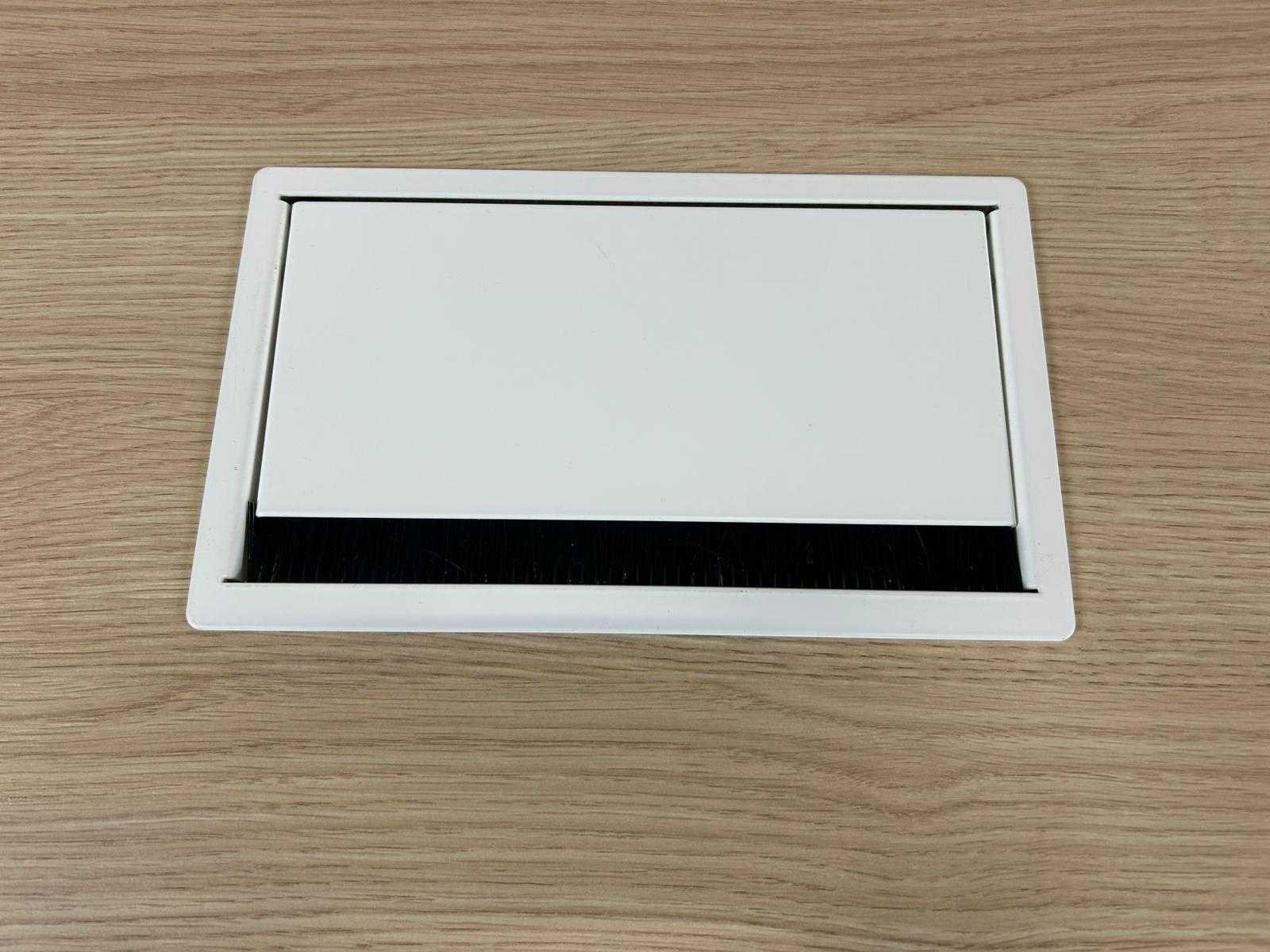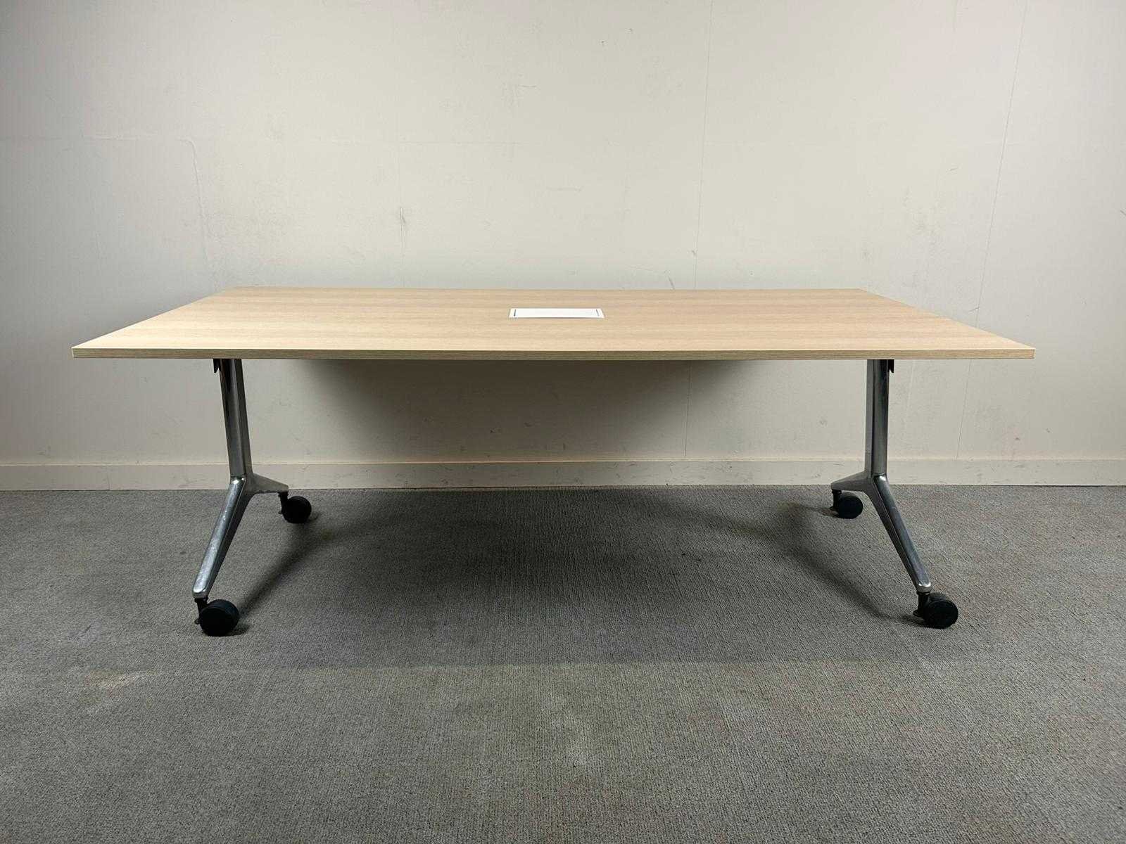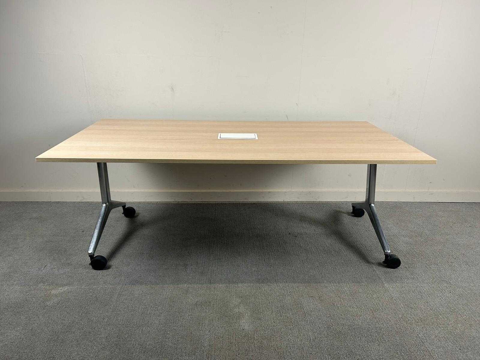 Met Y-poot frame op wielen voor mobiliteit, komt met kabeldoorvoer. Met gebruikssporen. Nee Kleur: Hout Lengte: 100cm Breedte: 200cm Hoogte: 75cm Materiaal: Melamine