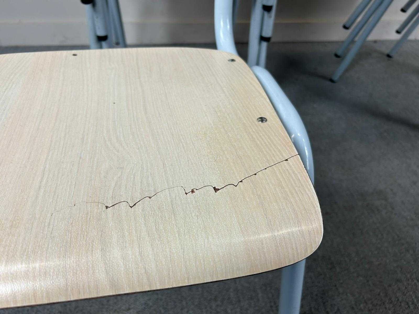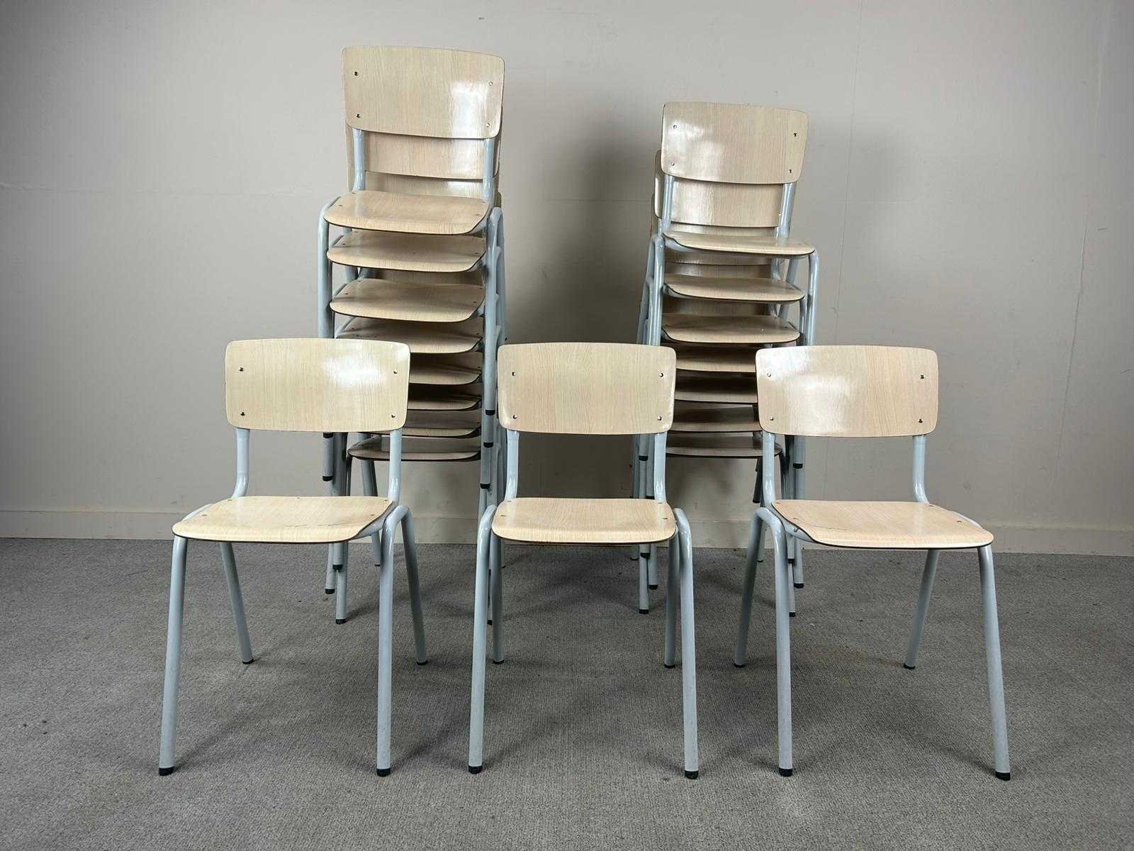 Kavel van 19 stapelbare kantinestoelen / Schoolstoelen in licht hout. Nee Product type: Schoolstoel Stapelbaar: true Kleur: Licht hout Gewicht: 150kg