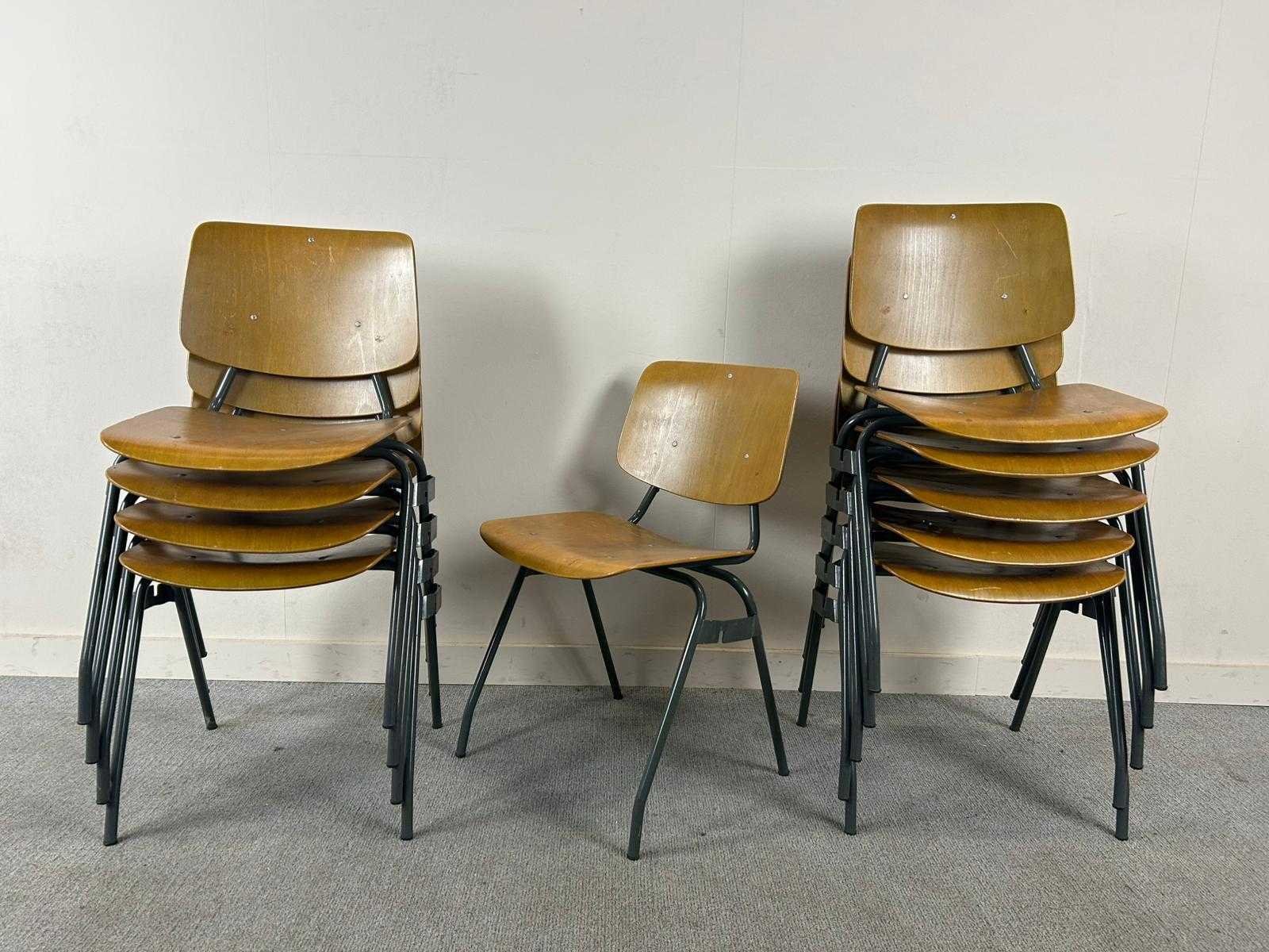 Set van 10 stapelbare kantinestoelen / Schoolstoelen in hout met metalen onderstel. Staat kan variëren per set en item Nee Product type: Kantine-Schoolstoel Stapelbaar: true Kleur: Hout Gewicht: 75kg Materiaal: Hout