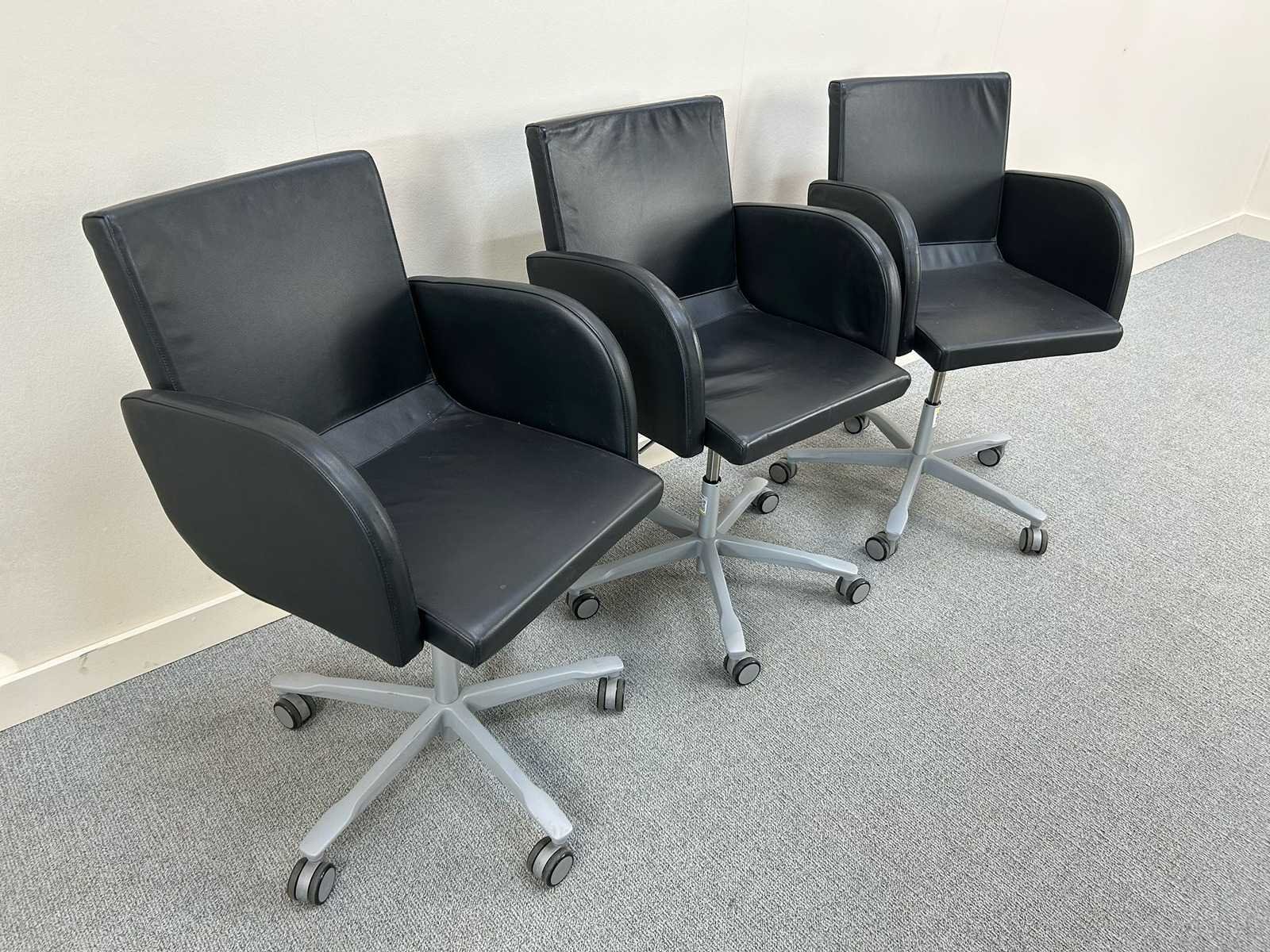 Set van 3x Bureaustoelen – Zwart (Kunstleer) Set van drie bureaustoelen in zwart kunstleer met metalen voetkruis en wielen. Comfortabele en praktische stoelen, geschikt voor kantoor- of projectomgevingen. Met gebruikssporen en lichte verzadiging op bepaalde oppervlakken, exacte staat kan variëren bij afhaling. Nee Kleur: Zwart Gewicht: 45kg Materiaal: leder