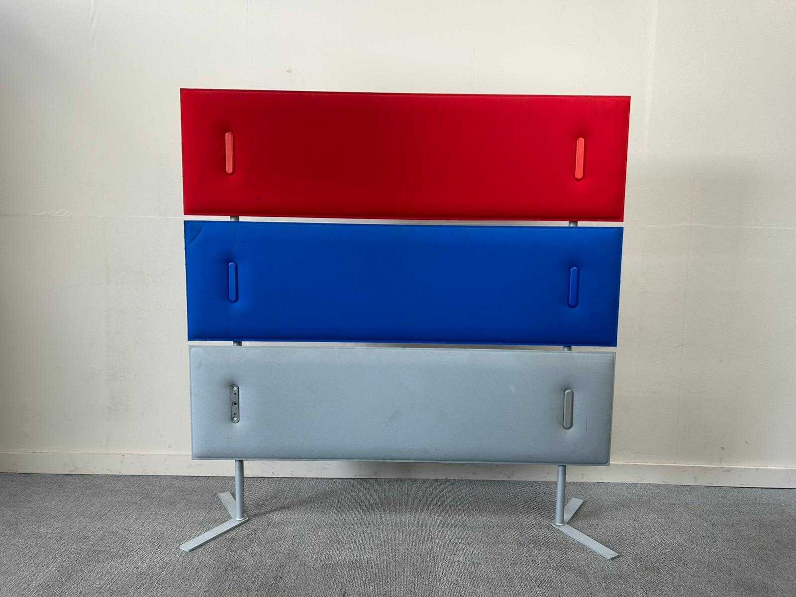 Vrijstaande akoestische panelen / scheidingswanden in drie kleuren (rood, blauw en lichtgrijs), gemonteerd op een stabiel metalen voetstel. De panelen zijn voorzien van geïntegreerde handgrepen, waardoor ze eenvoudig te verplaatsen zijn. Geschikt voor het creëren van visuele en akoestische afscheiding in kantoren, vergaderruimtes of flexwerkplekken. In gebruikte staat met lichte gebruikssporen. Nee Kleur: roog/blauw/grijs Gewicht: 15kg Lengte: 160cm Hoogte: 163cm Materiaal: vilt