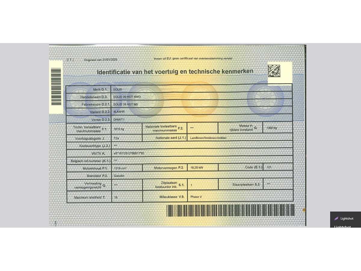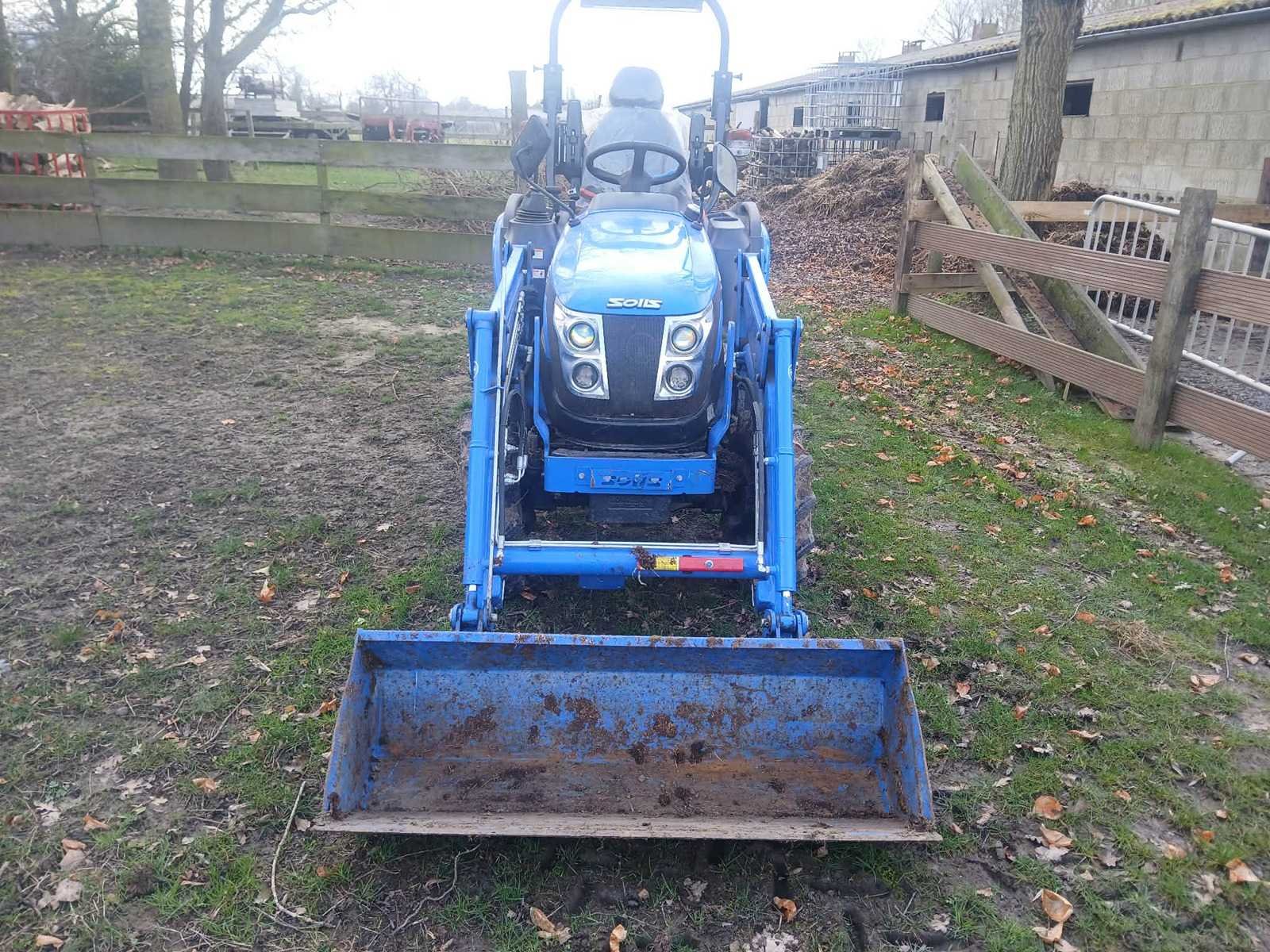 SOLIS HST26 Compacte tractor / bouwjaar 2025 / Motor : Mitsubishi 3-cyl S3L2 / 1318cc - 24pk – 310werkuren / hydrostatische transmissie / 4wd / brandstof diesel / tankinhoud 30L / Lage versnelling max 8km/h / hoge versnelling max 17km/h / servo stuur / aftakas toerental 540 /1000 tr/min / bandenmaat achteraan 8.3x20, 6PR / bandenmaat vooraan 6x12, 6PR / draaicirkel 2m69cm / gewicht 1055kg / hefvermogen 600kg / dubbelwerkende olieventiel met 14L/min opbrengst / voorlader met gesloten bak / alle documenten Nee Merk: SOLIS Type: HST26 Compacte tractor Afgelezen urenstand: 310