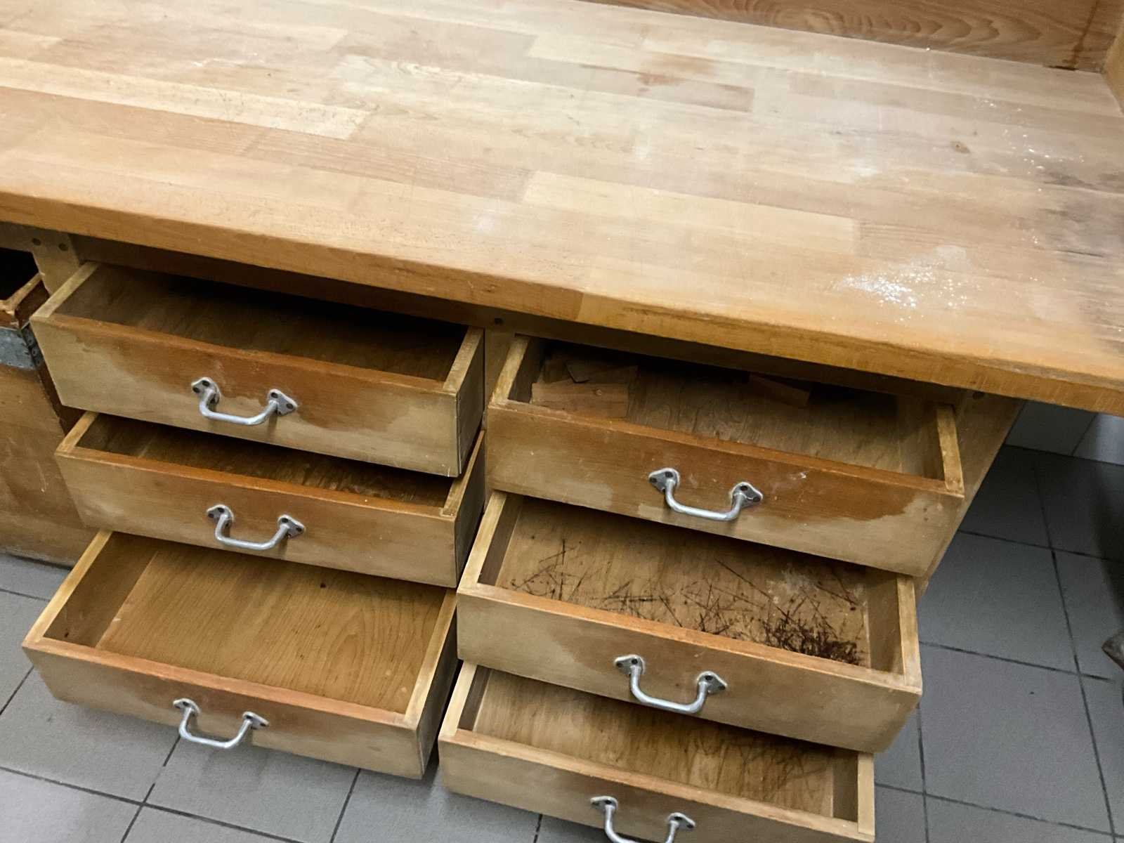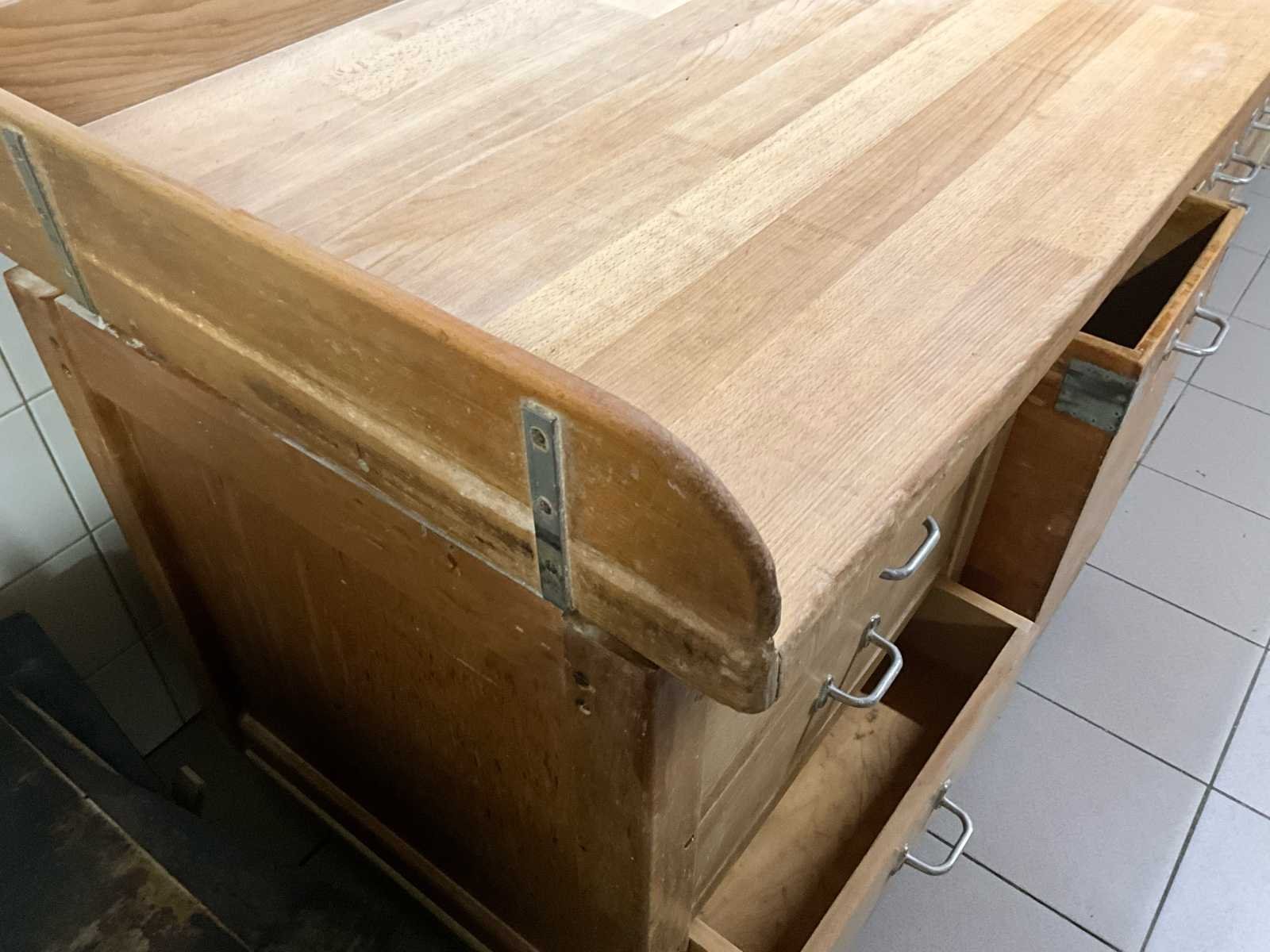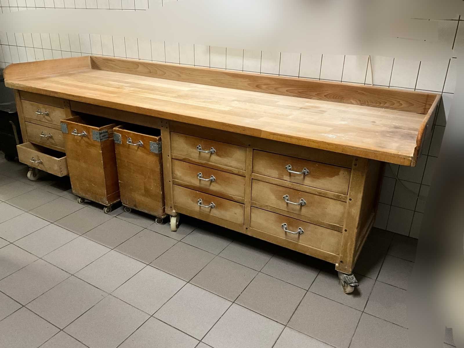 Zeer robuuste en authentieke bakkerij werkbank volledig uit massief hout. Dit type tafel werd traditioneel gebruikt voor deegverwerking en staat bekend om zijn duurzaamheid en stabiliteit. 👉 Uniek door: volledig houten constructie (geen RVS) warme, ambachtelijke uitstraling extreem stevig en zwaar uitgevoerd veel opbergruimte en praktische indeling Perfect voor zowel professioneel gebruik als horeca/interieur met karakter. 📏 Afmetingen Lengte: 303 cm Diepte: 90 cm Werkhoogte: 90 cm ⚙️ Specificaties Materiaal: volledig massief hout Werkblad: dik, zwaar slagers-/deegblad Achteropstand (opstaande rand) Indeling: meerdere ruime lades extra grote uittrekbakken/opslagkisten onderbouw met veel opslagcapaciteit Verrijdbaar: stevige industriële wielen Constructie: ambachtelijk gebouwd, zeer solide geschikt voor zwaar dagelijks gebruik 🧑🍳 Ideaal voor Bakkerijen & patisserie Horeca (open keuken / showkeuken) Food styling / atelier Industriële of landelijke inrichting Werkbank voor ambachtelijke productie No