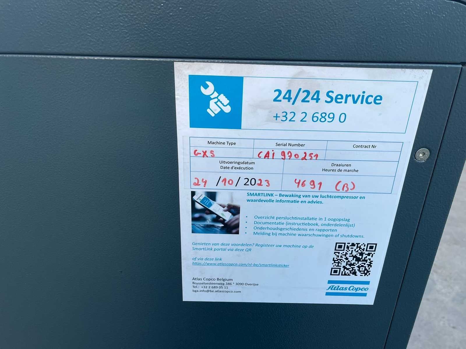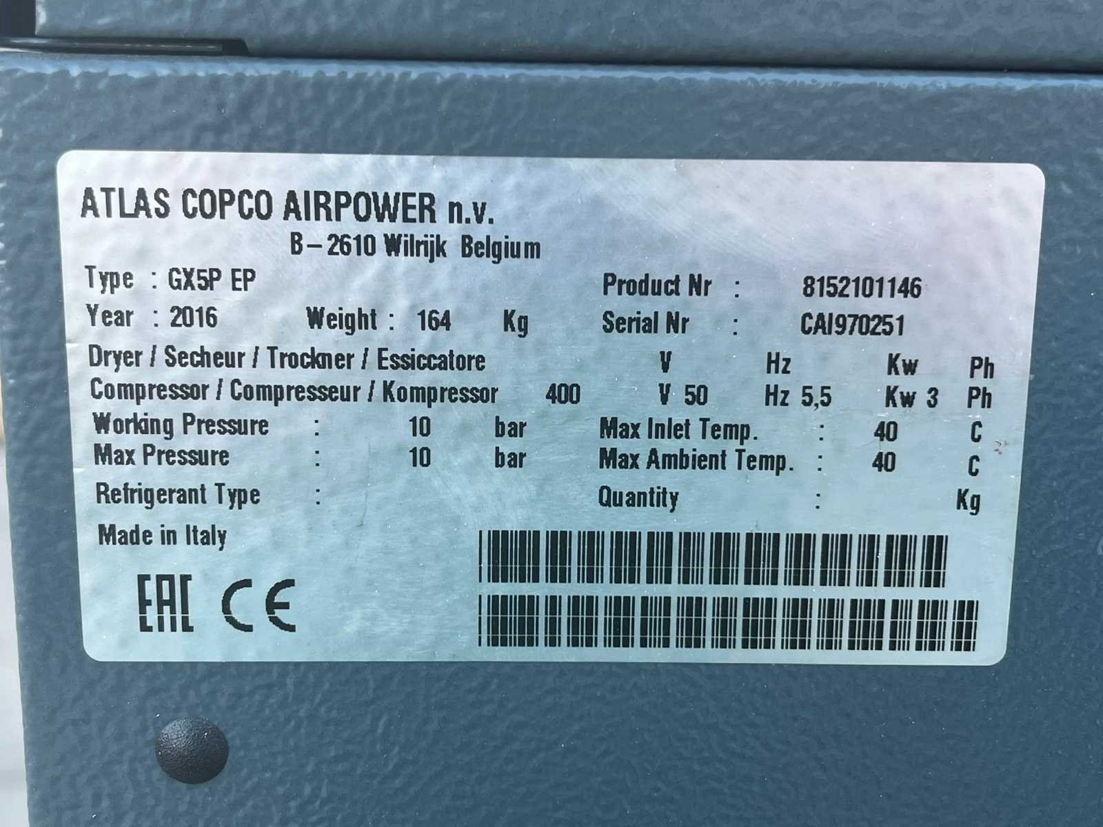 Atlas Copco GX5 EP schroefcompressor met tank – 400V – 10 bar Atlas Copco GX5 EP tankgemonteerde schroefcompressor met geïntegreerde droger, geschikt voor professioneel gebruik. ✔️ Merk: Atlas Copco ✔️ Model: GX5 EP ✔️ Jaar: 2016 ✔️ Voeding: 400V (driefasig) ✔️ Vermogen: 5,5 kW ✔️ Druk: 10 bar ✔️ Geïntegreerde tank ✔️ Geïntegreerde koeldroger ✔️ Openingstijden: ± 5.062 uur ✔️ Serienummer: CAI970251 ⚙️ Status Machine, in goede algemene staat. Schone uitstraling, consistent met de leeftijd en het gebruik. No Merk: Atlas Coco Type: GX5 EP Bouwjaar: 2016 Serienummer: CAI970251 Capaciteit.: 10bar Vermogen: 5kW Afgelezen urenstand: 5062 Aansluiting: 400V