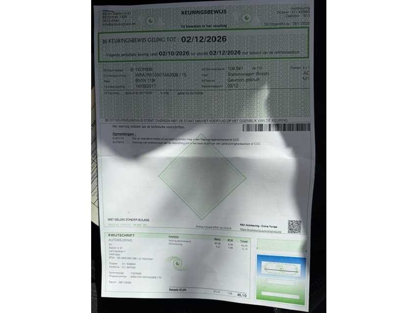 No Merk: BMW Model: 118I Type: F20 Bouwjaar: 2017 Afgelezen kilometerstand: 112859km Cilinderinhoud: 1499cc Vermogen (kW): 100kW Brandstof: benzine Chassisnummer: WBA1R510307A442806 Datum eerste toelating: 14/09/2017 Aantal zitplaatsen: 5 Kleur: GRIJS Transmissie: AUTOMAAT Drive type: Achterwiel Stuurwiel: LINKS Aantal sleutels: 2 Aantal cilinders: 3 Carrosserie: BERLINE Onderhoudshistorie: AANWEZIG Gelijkvormigheidsattest aanwezig: true Start en rijdt: JA Keuringsrapport geldig tot: 02/12/2026 Zichtbare schade: STEENSLAG BUMPER ACHTER Airconditioning: true Navigatie: true LED-koplampen: true Inschrijvingsbewijs - deel 1 : JA Inschrijvingsbewijs - deel 2: JA
