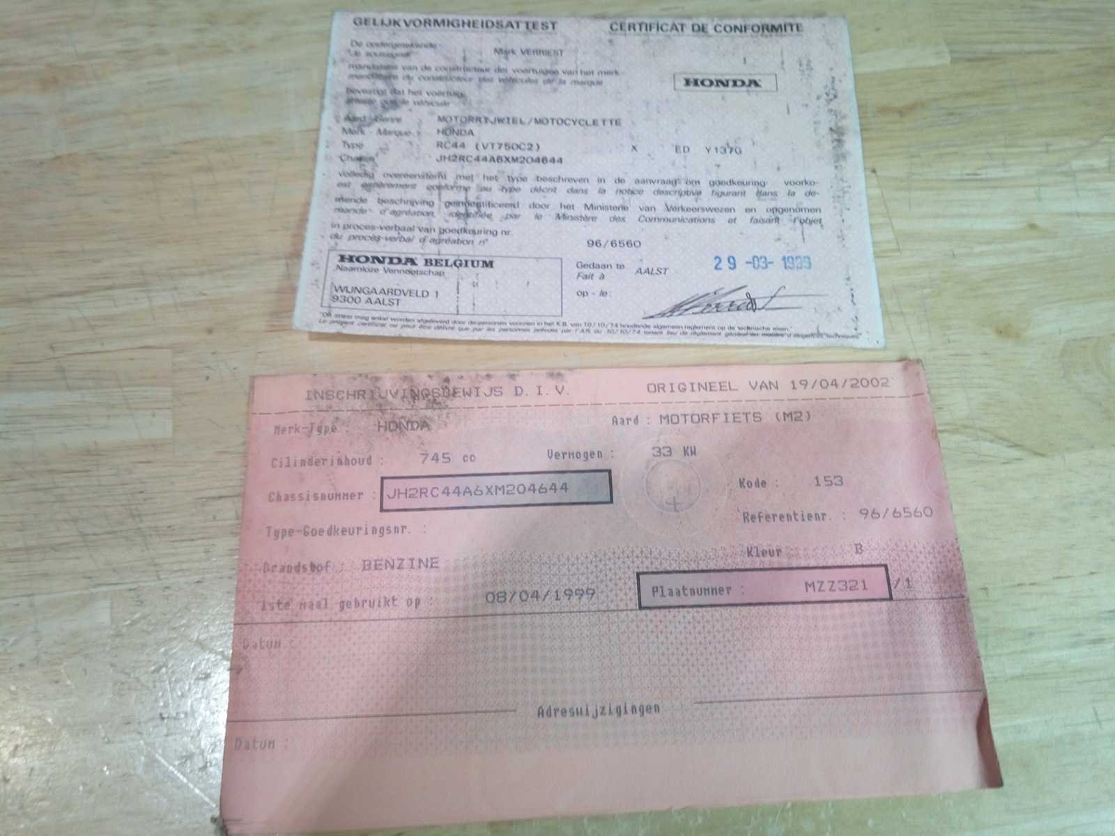 Inschrijvingsbewijs aanwezig, gelijkvormigheidsattest aanwezig . Nee Merk: Honda Model: VT750 Brandstof: benzine Chassisnummer: JH2RC44A6XM204644 Cilinderinhoud: 750cc Datum eerste toelating: 08/04/1999 Vermogen (kW): 33kW Afgelezen kilometerstand: 25600km Boorddocumenten aanwezig?: true Aantal sleutels: 1 Startinformatie: JA Bouwjaar: 1999
