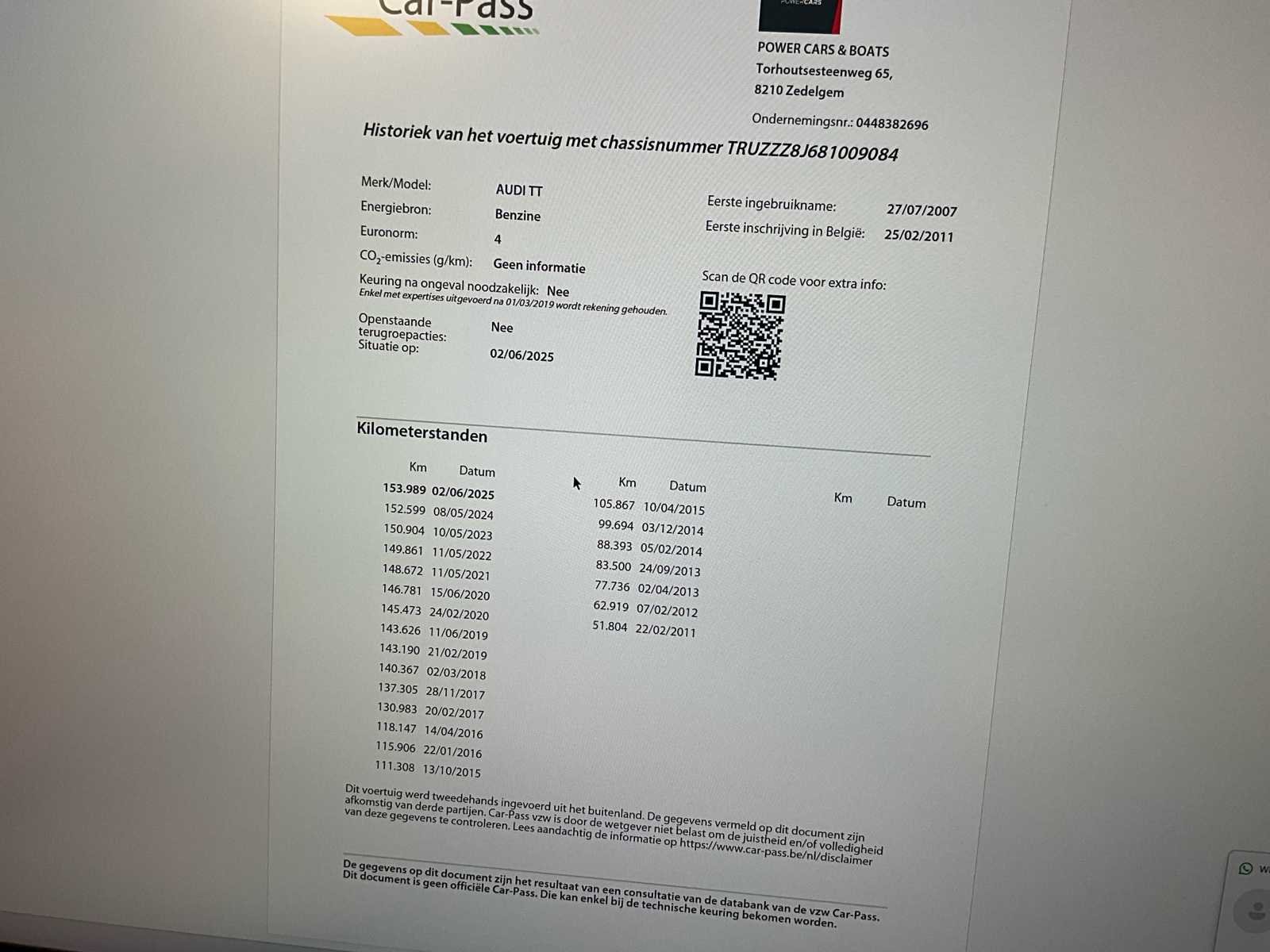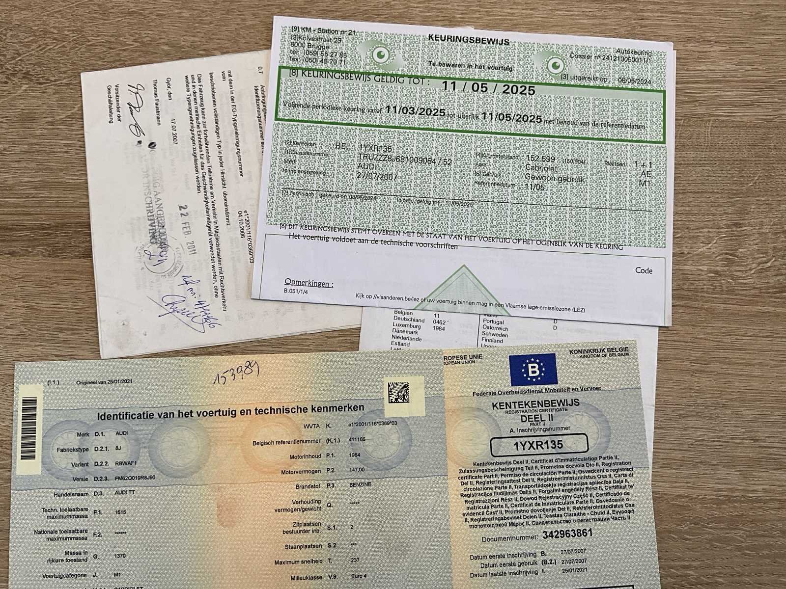 No Merk: Audi Model: TT cabriolet Type: 8J Bouwjaar: 2007 Afgelezen kilometerstand: 153989km Cilinderinhoud: 1984cc Vermogen (kW): 147kW Brandstof: Benzine Chassisnummer: TRUZZZ8J681009084 Datum eerste toelating: 27/07/2007 Vermogen (pk): 147hp Energielabel: Euro4 Aandrijving: Voorwiel Aantal zitplaatsen: 2 Kleur: Zwart Transmissie: Manueel Drive type: Front wheel Stuurwiel: Links Emissieklasse: Euro4 Aantal deuren: 2 Aantal sleutels: 2 Nationaliteit documenten: Belgie Onderhoudshistorie: Ja Gelijkvormigheidsattest aanwezig: true Carpass: true Start en rijdt: Ja Keuringsrapport geldig tot: 11/05/2025 Technische fiche: true Zichtbare schade: Ja Airconditioning: true Leder bekleed: true Inschrijvingsbewijs - deel 1 : Ja Inschrijvingsbewijs - deel 2: Ja