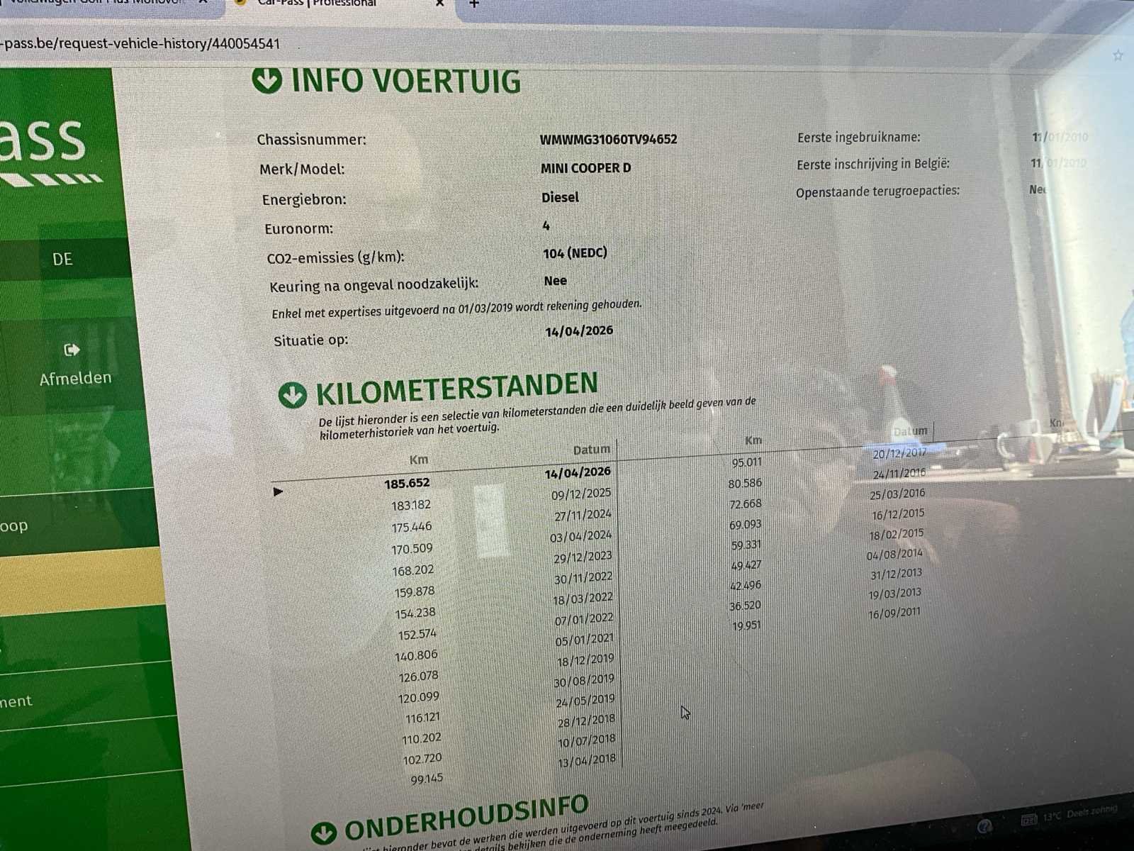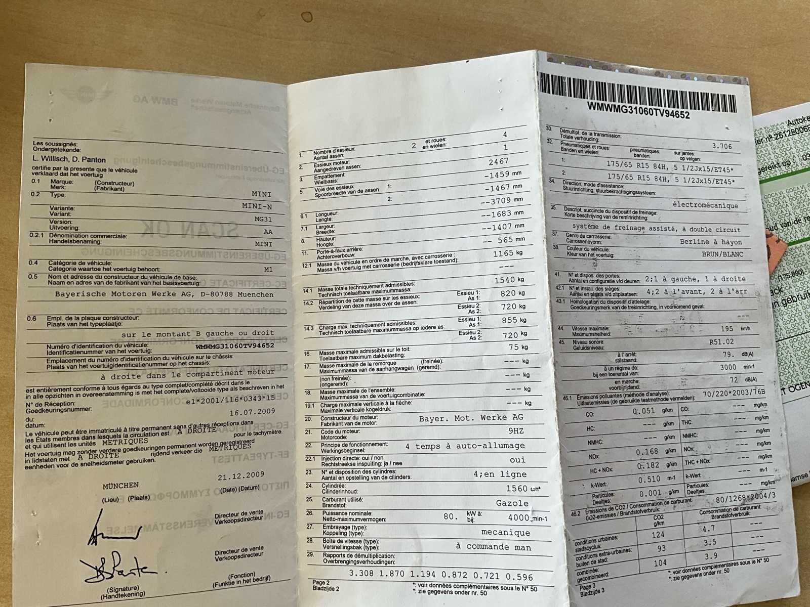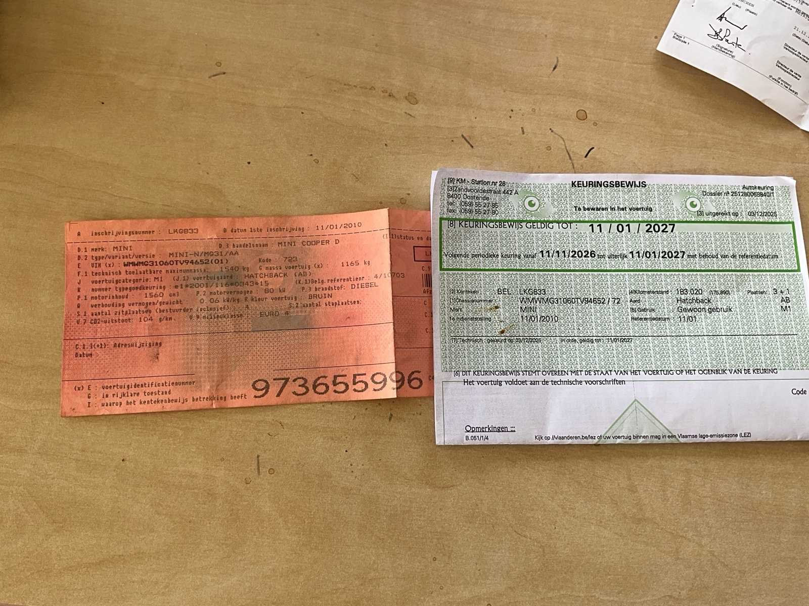 Er zijn er maar 50 van gemaakt No Merk: COOPER D Model: Mini N/MG31/AA Type: Mini N Bouwjaar: 2010 Afgelezen kilometerstand: 185652km Cilinderinhoud: 1560cc Vermogen (kW): 80kW Brandstof: Diesel Chassisnummer: WMWMG31060TV94652 Laadvermogen: 1540kg Datum eerste toelating: 11/01/2010 Vermogen (pk): 80hp Energielabel: Euro4 Aandrijving: Vooraan Aantal zitplaatsen: 4 Kleur: Chocolade bruin Transmissie: Manueel Drive type: Front wheel Stuurwiel: Links Emissieklasse: Euro 4 Aantal deuren: 2 Aantal sleutels: 2 Aantal cilinders: 4 Nationaliteit documenten: België Gelijkvormigheidsattest aanwezig: true Carpass: true Start en rijdt: Ja Keuringsrapport geldig tot: 11/01/2027 Zichtbare schade: Ja Airconditioning: true Leder bekleed: true Inschrijvingsbewijs - deel 1 : Ja Inschrijvingsbewijs - deel 2: Ja