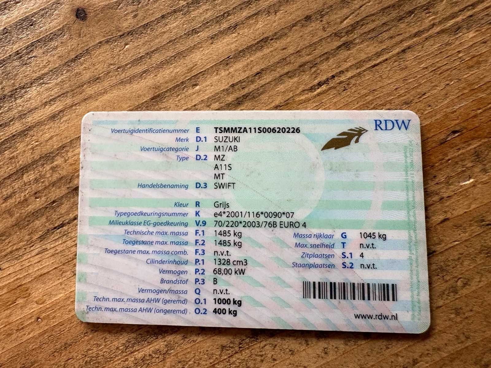 Nederlands kenteken dient overgeschreven te worden kosten koper Of export met verzekering en kentekenplaten kost 250 euro of alleen papieren op naam zetten 100 euro No Kenteken: 93hlp6 Merk: Suzuki Model: Swift Type: 1.3 Exclusive Bouwjaar: 2009 Cilinderinhoud: 1328cc Vermogen (kW): 68kW Brandstof: Benzine Datum eerste toelating: 2009-01-08 APK vervaldatum: 2025-11-10 Vermogen (pk): 91hp Aantal zitplaatsen: 4 Maximaal trekgewicht ongeremd: 1000kg Maximaal trekgewicht geremd: 400kg Kleur: grijs Transmissie: Handgeschakeld (5) Emissieklasse: 4 Aantal deuren: 2 Ledig gewicht: 945kg Bruto BPM (NL): 2690€ Rest BPM: 36€ Aantal cilinders: 4 Carrosserie: Hatchback Carfax Link: https://was.carfax.eu/v0/api/ccdid/5100016408/svc/201/vinreg/93HLP6/checksum/eyJhbGciOiJIUzI1NiIsInR5cCI6IkpXVCJ9.eyJleHAiOjE3NzgyNjA1MTF9.BbDna3YFpOYgkK5hOIEGn8EWq48jP8YTlFq8OCMF9V4 Start en rijdt: ja startinformatie : ja Airconditioning: true