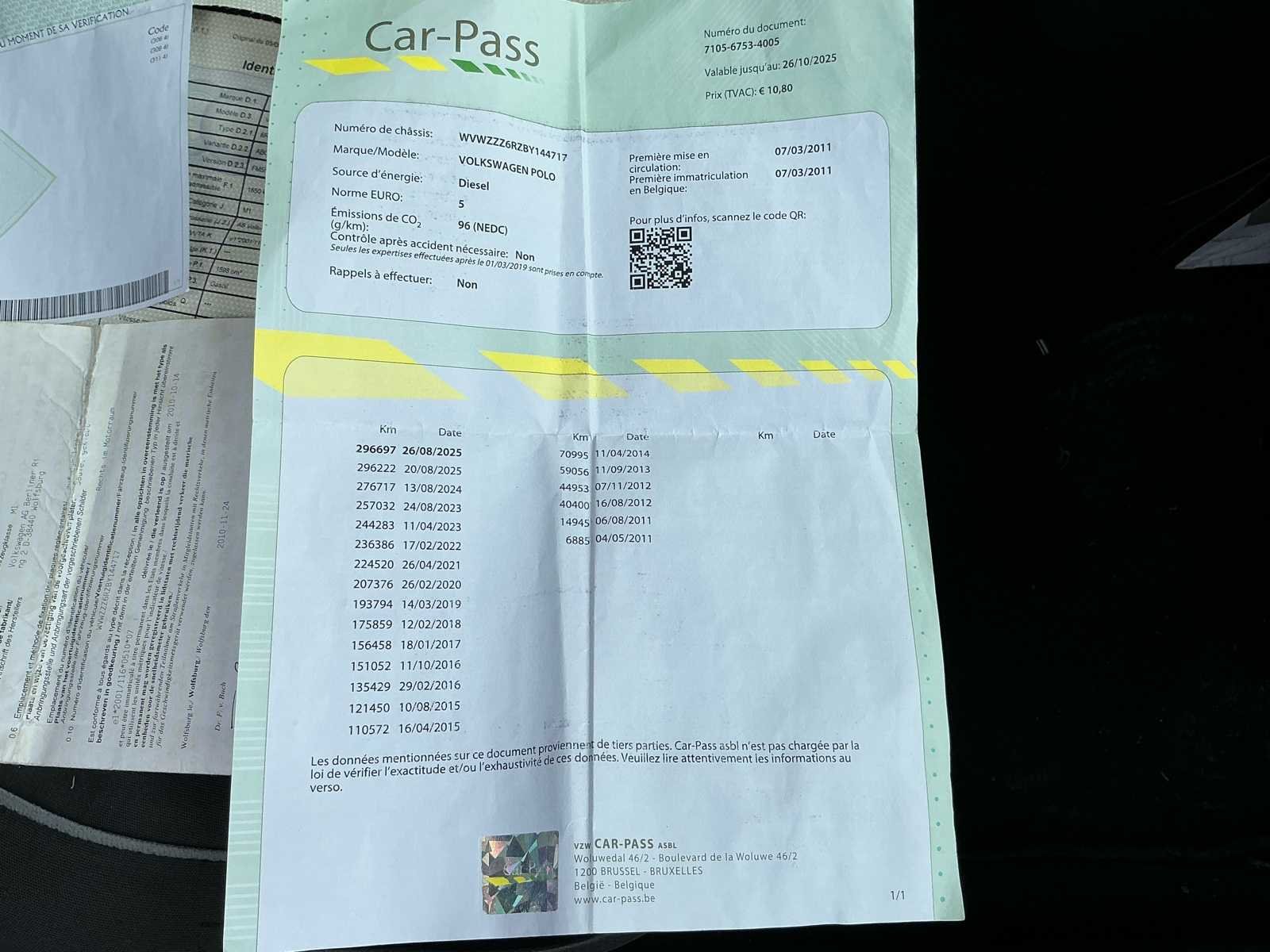 Hierbij heeft deze een nieuwe batterij nodig, start wel met startkabels. Amortisator maakt soms een licht lawaai. No Merk: Volkswagen Model: Polo Type: 1.6 TDi bleumotion Bouwjaar: 2011 Afgelezen kilometerstand: 306676km Cilinderinhoud: 1598cc Vermogen (kW): 66kW Brandstof: Diesel Chassisnummer: WVWZZZ6 RZBY144717 Laadvermogen: 550kg Datum eerste toelating: 07/03/2011 Vermogen (pk): 90hp Energielabel: A Aandrijving: Voorwielaandrijving Aantal zitplaatsen: 5 Maximaal trekgewicht ongeremd: 600kg Maximaal trekgewicht geremd: 1200kg Kleur: Zwart Transmissie: Handgeschakeld Drive type: Front wheel Stuurwiel: Links Emissieklasse: Euro 5 Aantal deuren: 5 Aantal sleutels: 2 Aantal cilinders: 3 Nationaliteit documenten: België Gelijkvormigheidsattest aanwezig: true Carpass: true Start en rijdt: Ok Keuringsrapport geldig tot: 20/08/2026 startinformatie : Ok met startkabels Vavato voert geen technische keuring uit.: true Navigatie: true Inschrijvingsbewijs - deel 1 : Aanwezig Inschrijvingsbewijs - deel 2: Aanwezig
