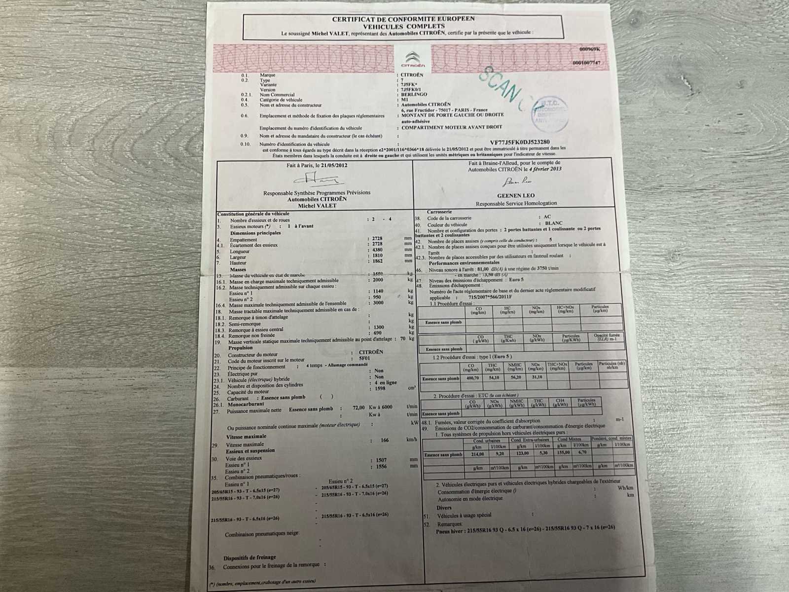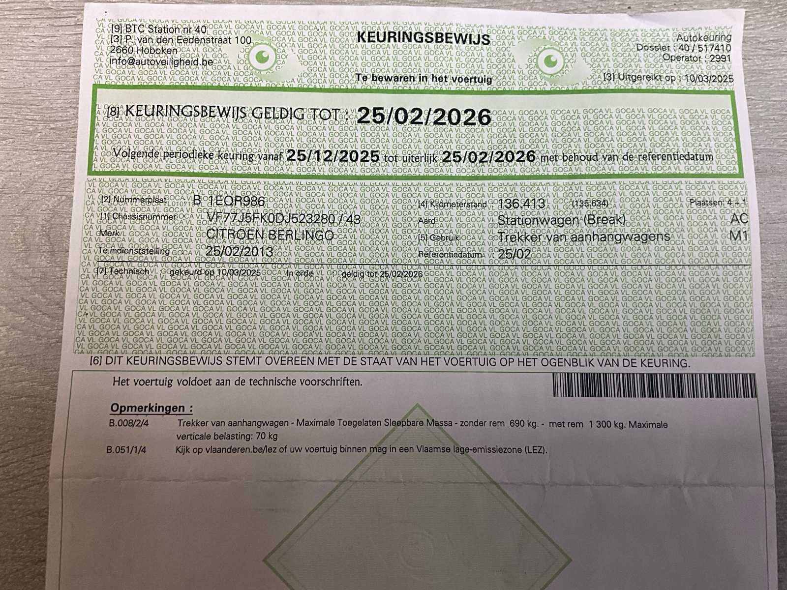 Zeer nette staat, buitenkant paar kleine krasjes (zie foto), binnenkant zeer proper - trekhaak No Merk: Citroën Model: Berlingo Type: stationwagen 137000km - benzine Bouwjaar: 2013 Afgelezen kilometerstand: 136776km Cilinderinhoud: 1598cc Vermogen (kW): 72kW Brandstof: benzine Chassisnummer: VF77J5FK0DJ523280 Laadvermogen: 450kg Datum eerste toelating: 25/2/2013 Aantal zitplaatsen: 5 Kleur: geel Transmissie: manueel, Emissieklasse: Euro 5 Aantal deuren: 6 Ledig gewicht: 1550kg Nationaliteit documenten: B Gelijkvormigheidsattest aanwezig: true Start en rijdt: ja Vavato voert geen technische keuring uit.: true Inschrijvingsbewijs - deel 1 : aanwezig Inschrijvingsbewijs - deel 2: aanwezig
