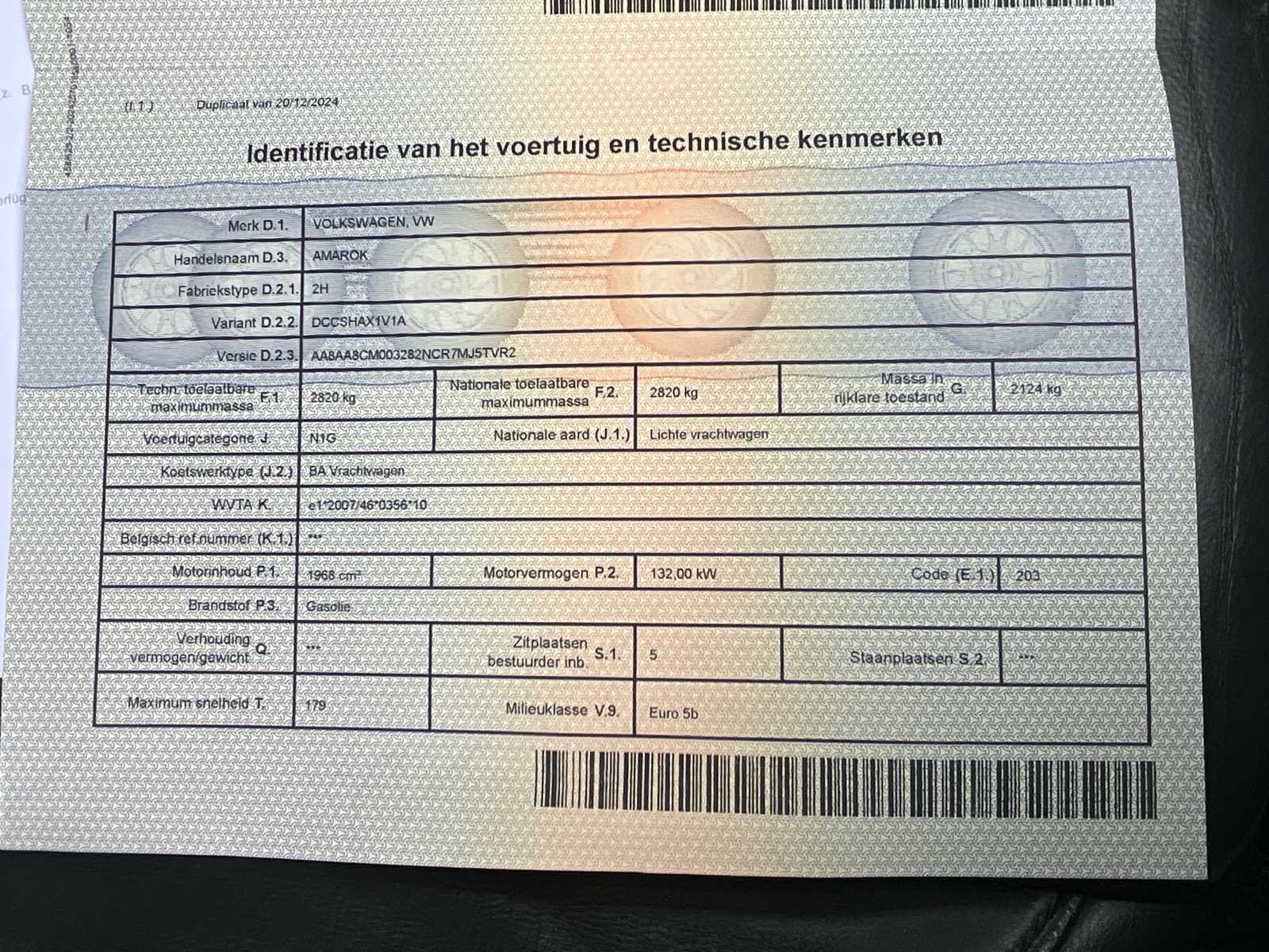 Start rijd en voert uit wat hij moet doen Nee Merk: Volkswagen Model: Amarok Type: 2H Bouwjaar: 2014 Afgelezen kilometerstand: 414300km Cilinderinhoud: 1968cc Vermogen (kW): 132kW Brandstof: diesel Chassisnummer: WV1ZZZ2HZEH015071 Datum eerste toelating: 18/04/2014 Aantal zitplaatsen: 5 Kleur: zwart Nationaliteit documenten: belg Gelijkvormigheidsattest aanwezig: true Start en rijdt: ja Keuringsrapport geldig tot: 18/10/2026 Vavato voert geen technische keuring uit.: true