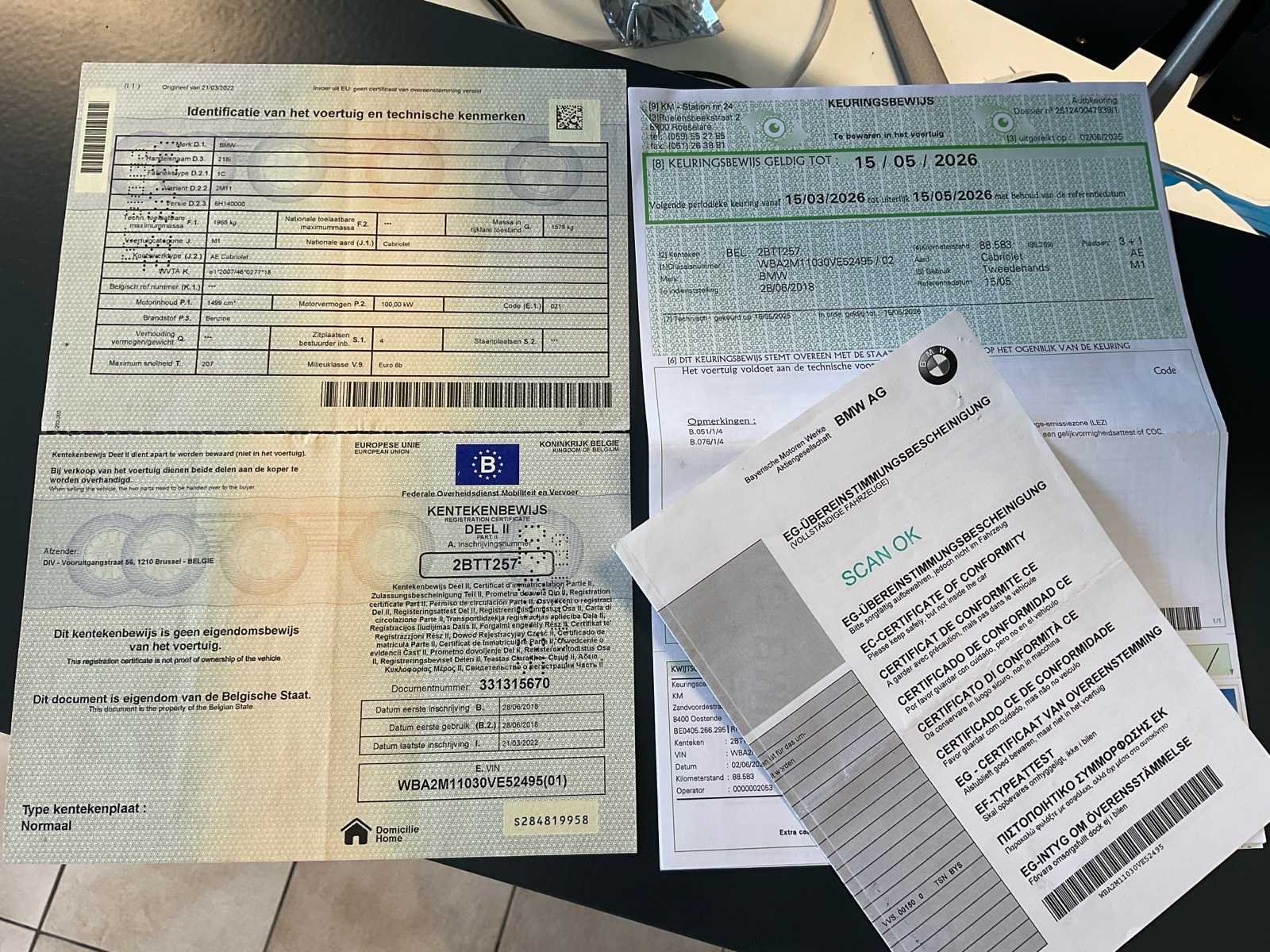 No Merk: BMW Model: 218i Cabrio Bouwjaar: 2018 Afgelezen kilometerstand: 93014km Cilinderinhoud: 1499cc Vermogen (kW): 100kW Brandstof: Benzine Chassisnummer: WBA2M11030VE52495 Datum eerste toelating: 28/06/2018 Aantal zitplaatsen: 4 Transmissie: Geschakeld Drive type: Achterwiel Emissieklasse: Euro 6b Aantal deuren: 3 Aantal sleutels: 1 Ledig gewicht: 1575kg Carrosserie: Cabrio Nationaliteit documenten: BE Gelijkvormigheidsattest aanwezig: true Carpass: true Start en rijdt: JA! Keuringsrapport geldig tot: 15/05/2026 Inschrijvingsbewijs - deel 1 : Aanwezig Inschrijvingsbewijs - deel 2: Aanwezig