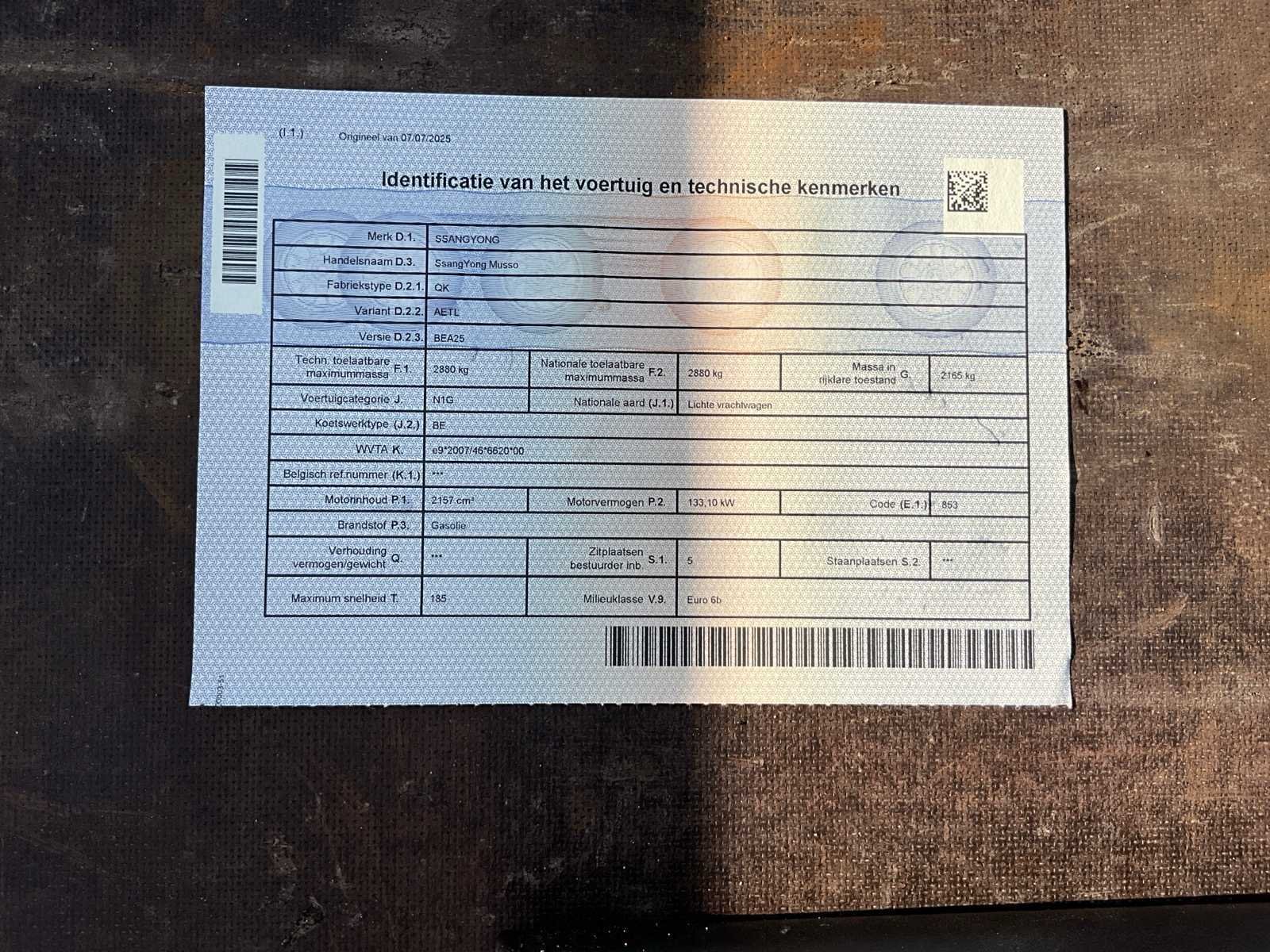 Nee Merk: SsangYong Model: Musso Bouwjaar: 2019 Afgelezen kilometerstand: 250000km Cilinderinhoud: 2157cc Vermogen (kW): 133kW Brandstof: Diesel Chassisnummer: KPAXA1EESJP006867 Datum eerste toelating: 29/08/2019 Aantal zitplaatsen: 5 Maximaal trekgewicht ongeremd: 750kg Maximaal trekgewicht geremd: 3000kg Transmissie: Automaat Emissieklasse: Euro 6b Aantal sleutels: 2 Ledig gewicht: 2200kg Carrosserie: SUV Nationaliteit documenten: BE Gelijkvormigheidsattest aanwezig: true Start en rijdt: Ja Keuringsrapport geldig tot: 27/06/2026 startinformatie : Start, rijdt, remt Vavato voert geen technische keuring uit.: true Inschrijvingsbewijs - deel 1 : Ok Inschrijvingsbewijs - deel 2: Ok