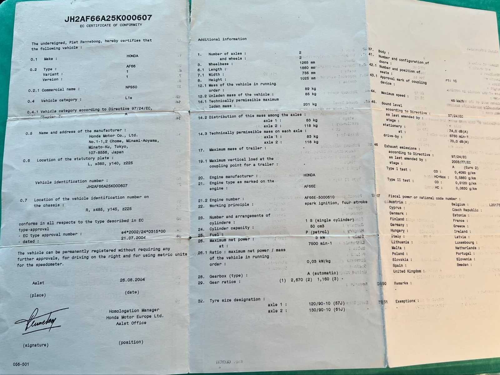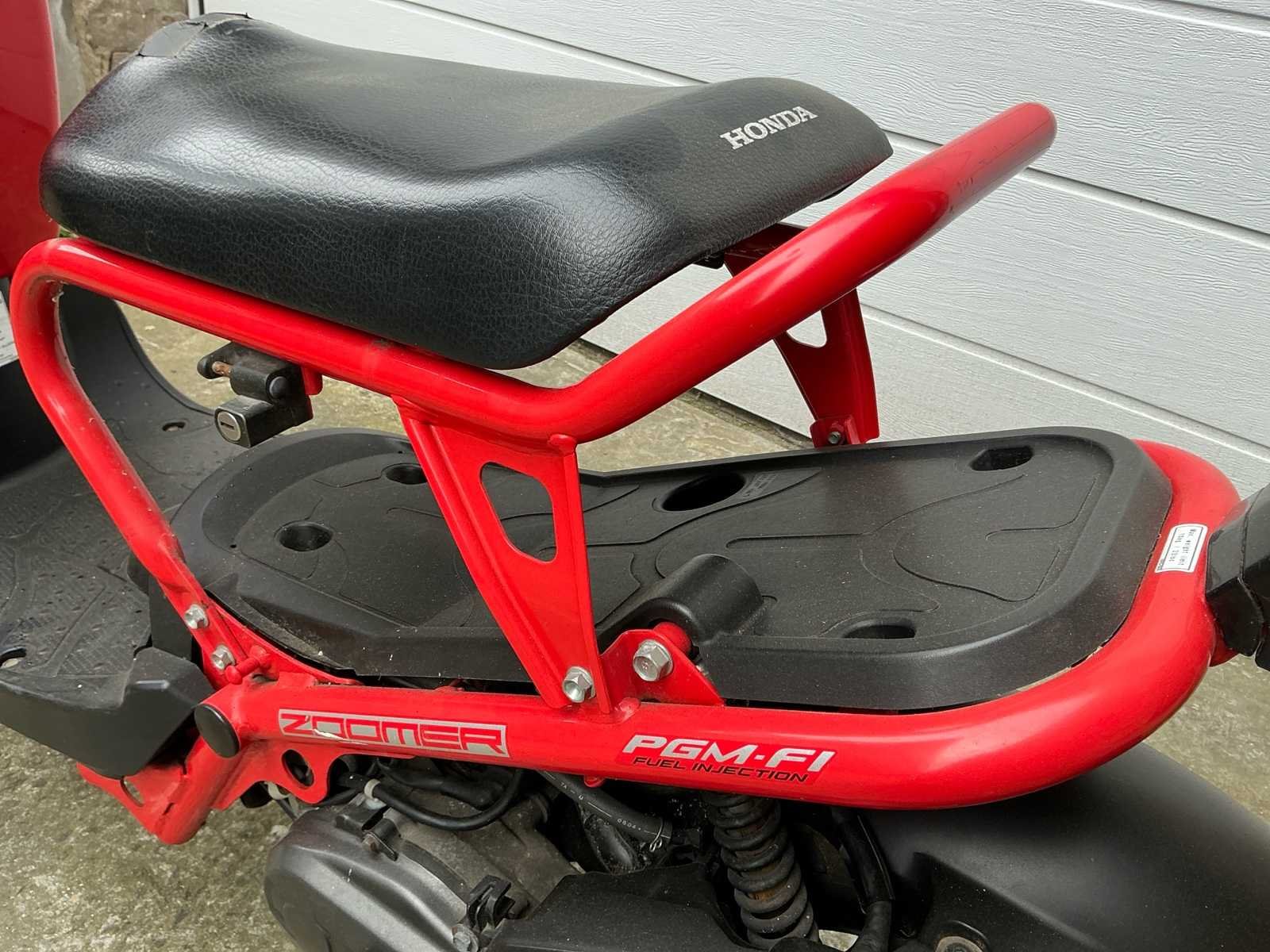 Honda Zoomer / Ruckus bromscooter in opvallende rood-zwarte uitvoering, herkenbaar aan het open buizenframe, de dubbele ronde koplampen en het robuuste, functionele ontwerp. Volgens het voorgelegde gelijkvormigheidsattest betreft het een Honda NPS50 met voertuigidentificatienummer JH2AF66A25K000607. Op de kilometerteller staat een afgelezen stand van 12.361 km. Dit exemplaar presenteert zich als een compacte en karaktervolle scooter met een zeer herkenbare uitstraling. De scooter is uitgerust met bagagedrager vooraan, open frameconstructie, zwarte kunststof delen, automatische transmissie en brede banden. De rode frame- en kuipdelen geven het voertuig een sportieve look. Het model is populair door zijn eigenzinnige vormgeving en praktische inzetbaarheid, zowel voor verzamelaars van iconische scooters als voor liefhebbers van compacte stadsvoertuigen. Op basis van de foto’s zijn gebruiks- en ouderdomssporen zichtbaar, waaronder krassen, slijtage en verwering op diverse onderdelen. De buddyseat vertoont duidelijke beschadiging aan de bekleding. Ook op kunststof delen, uitlaat, carterdeksel, standaard en overige afwerking zijn sporen van gebruik, oxidatie en slijtage waarneembaar. De banden tonen normaal gebruik; de staat en geschiktheid voor verder gebruik dienen door de koper zelf beoordeeld te worden. Er is documentatie aanwezig in de vorm van een EC Certificate of Conformity. Dit maakt het lot extra interessant voor kandidaat-kopers die op zoek zijn naar een markant Honda-model met documentatie. No Merk: Honda Model: Zoomer NPS50 Chassisnummer: JH2AF66A25K000607 Datum eerste toelating: 26/08/2004 Kleur: Rood Bouwjaar: 2004 Afgelezen kilometerstand: 12361km