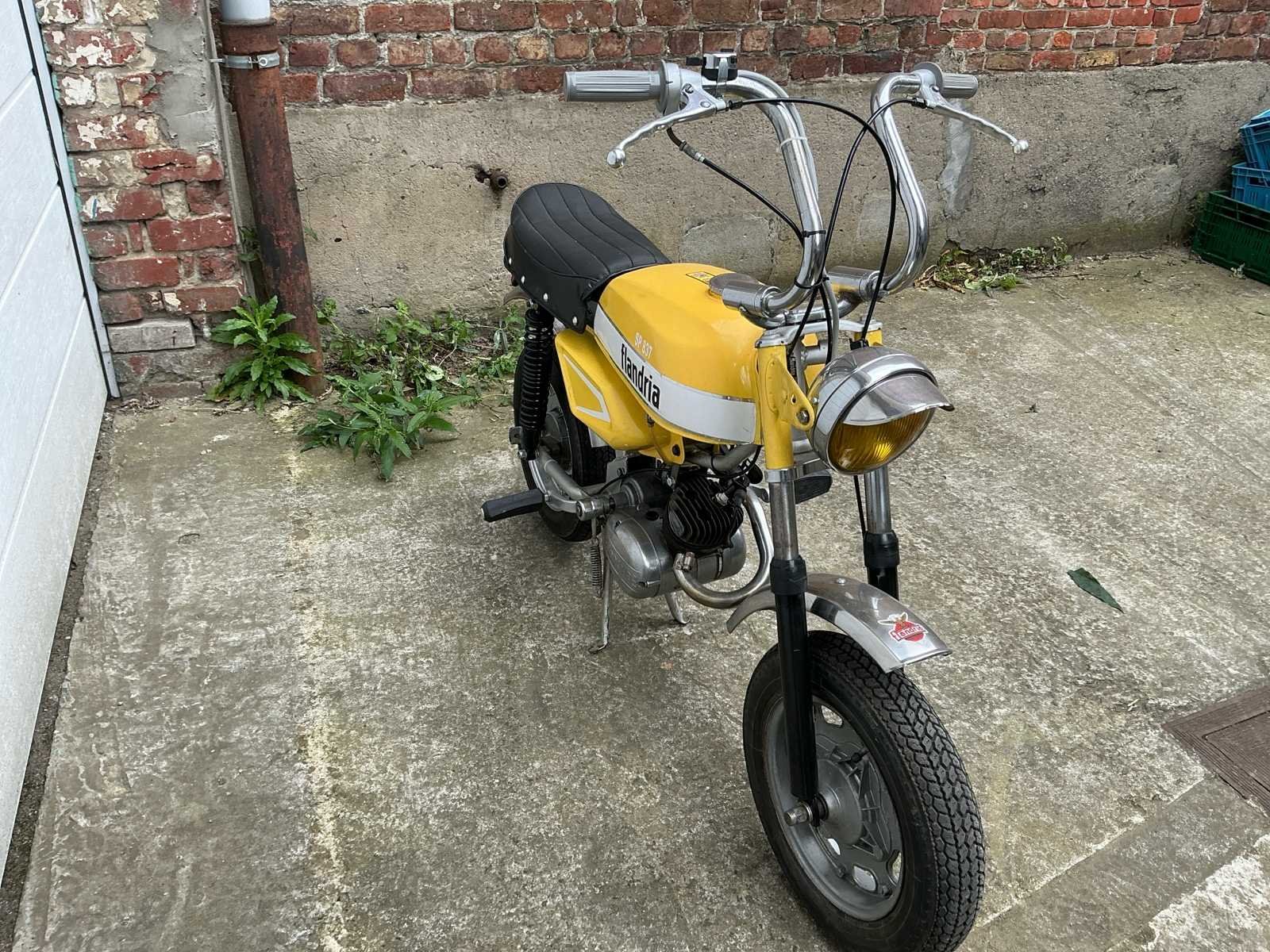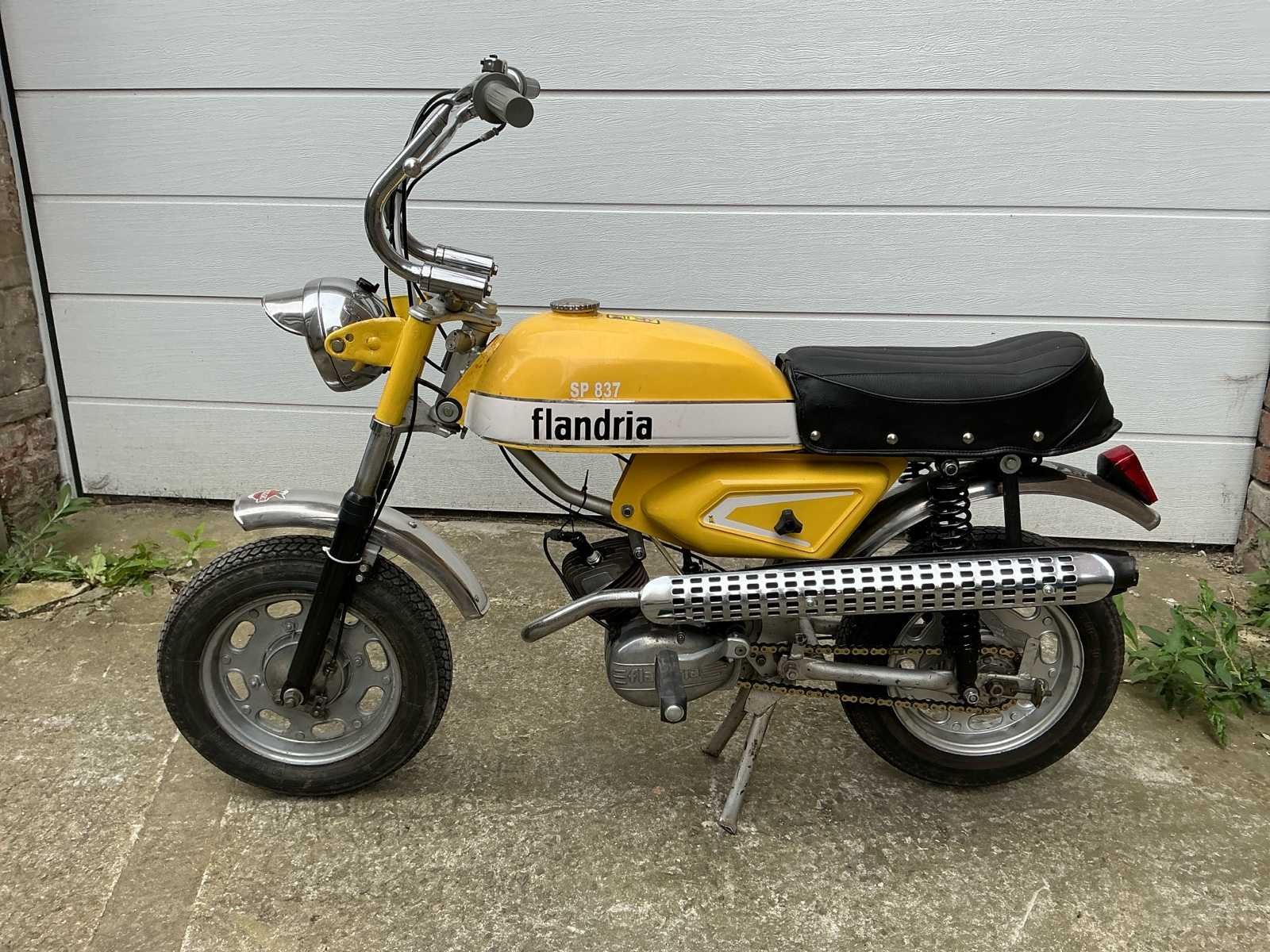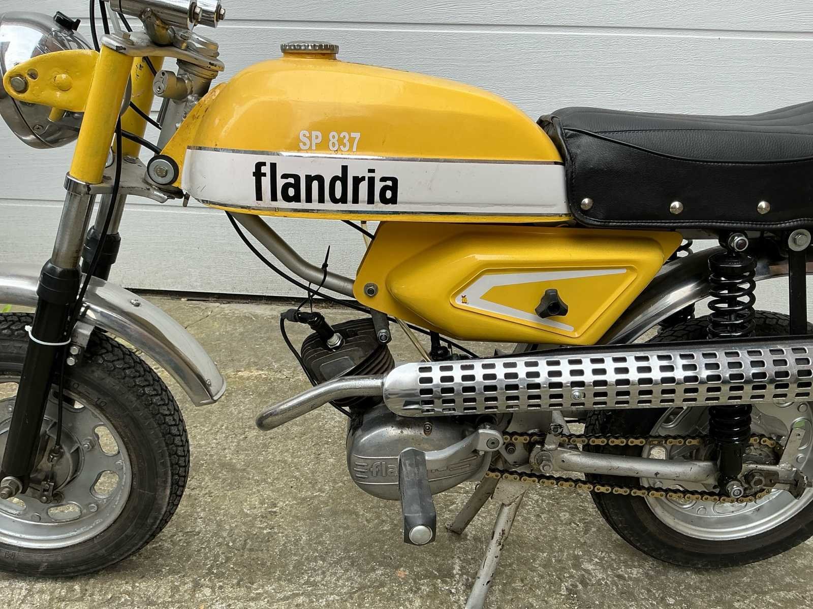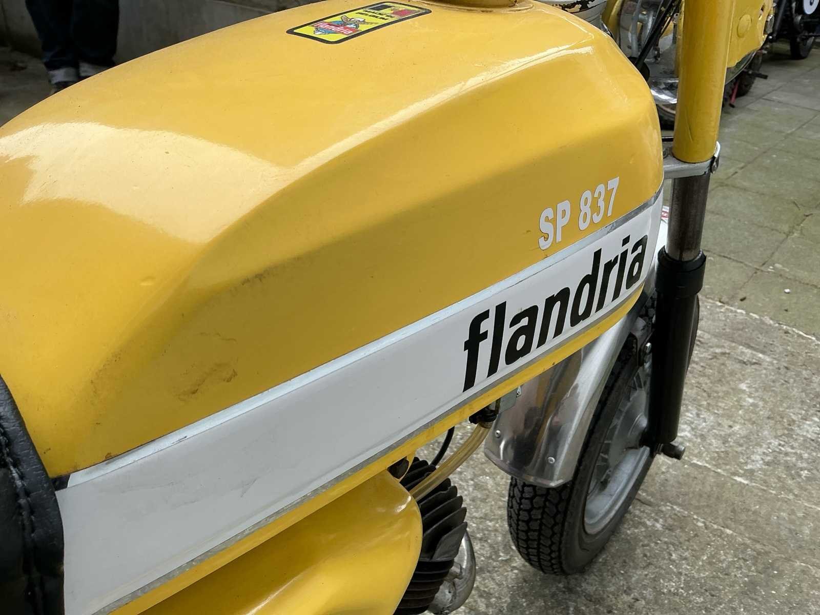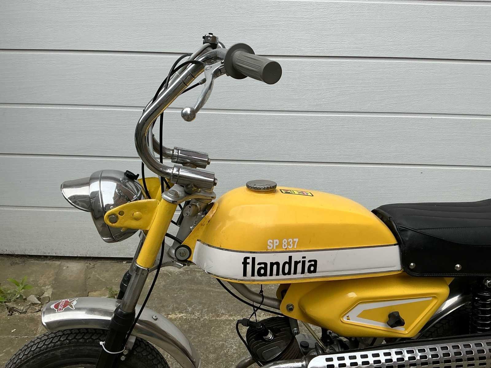 Flandria bromfiets in opvallende gele uitvoering met witte striping en zwarte buddyseat. Dit compacte en karaktervolle exemplaar presenteert zich met de typische vormgeving van de lichte Belgische bromfietsen uit de jaren zeventig. Volgens het voorgelegde attest van bouwjaar betreft het een Flandria, type SP847 AF-A, met chassisnummer 10231 en bouwjaar 1973. De bromfiets maakt een verzorgde en grotendeels complete indruk en is uitgerust met een eencilinder tweetaktmotor, hoog geplaatste uitlaat met geperforeerd hitteschild, kleine gegoten wielen, telescopische voorvork, dubbele achtervering en een karakteristieke koplamp met kap. De geel-witte kleurstelling geeft het geheel een frisse en herkenbare uitstraling. De lak, stickers en afwerking vertonen normale gebruiks- en ouderdomssporen. Ook zijn lichte sporen van slijtage, verwering en gebruik zichtbaar op onder meer frame, spatborden, ketting, uitlaat, velgen en diverse metalen delen. Dit lot is interessant voor liefhebbers van Belgische klassieke bromfietsen, verzamelaars of kandidaten voor conservering, opfrissing of verdere restauratie. Dankzij zijn opvallende verschijning, compacte afmetingen en aanwezige documentatie heeft dit exemplaar zeker verzamelpotentieel. Verkoop in de staat waarin het voertuig zich bevindt, zonder garanties inzake technische werking, volledigheid of rijklaarheid. Bouwjaar volgens voorgelegd attest: 1973. Datum eerste toelating wordt niet expliciet vermeld op het getoonde document. Kopers worden uitdrukkelijk verzocht het voertuig voorafgaandelijk zelf te inspecteren. No Merk: Flandria Model: SP 847 AF-A Chassisnummer: 10231 Kleur: Geel Bouwjaar: 1973