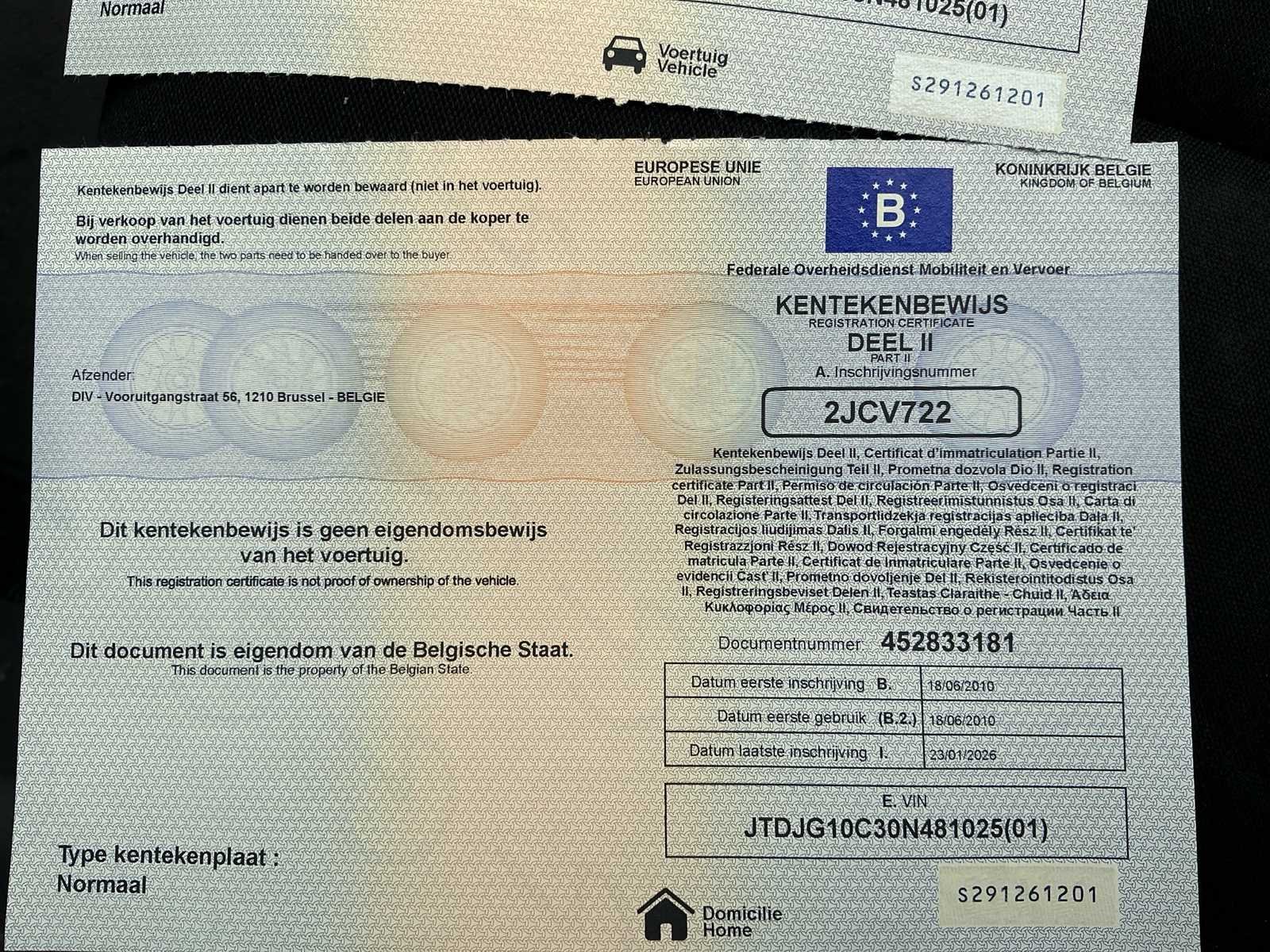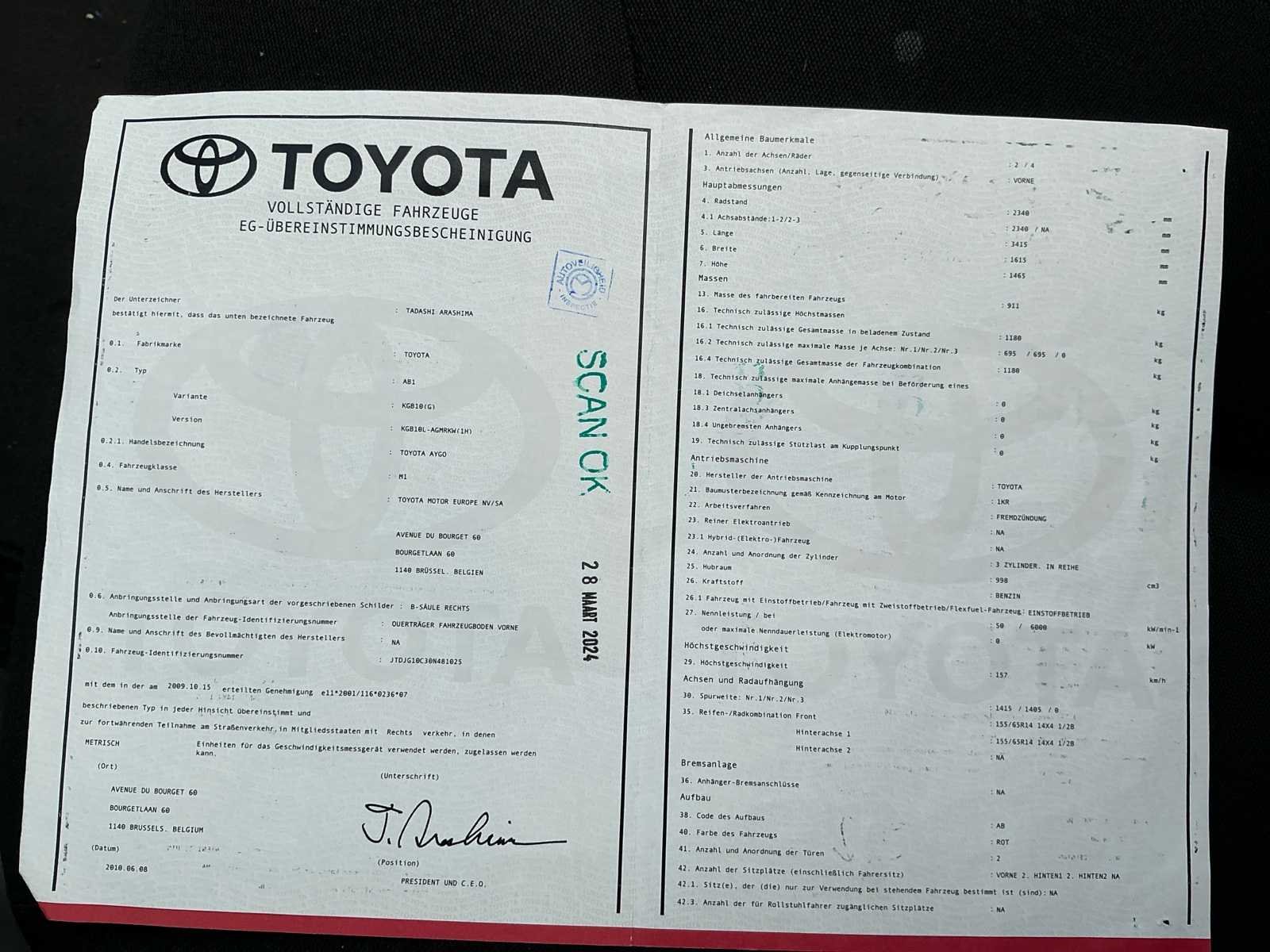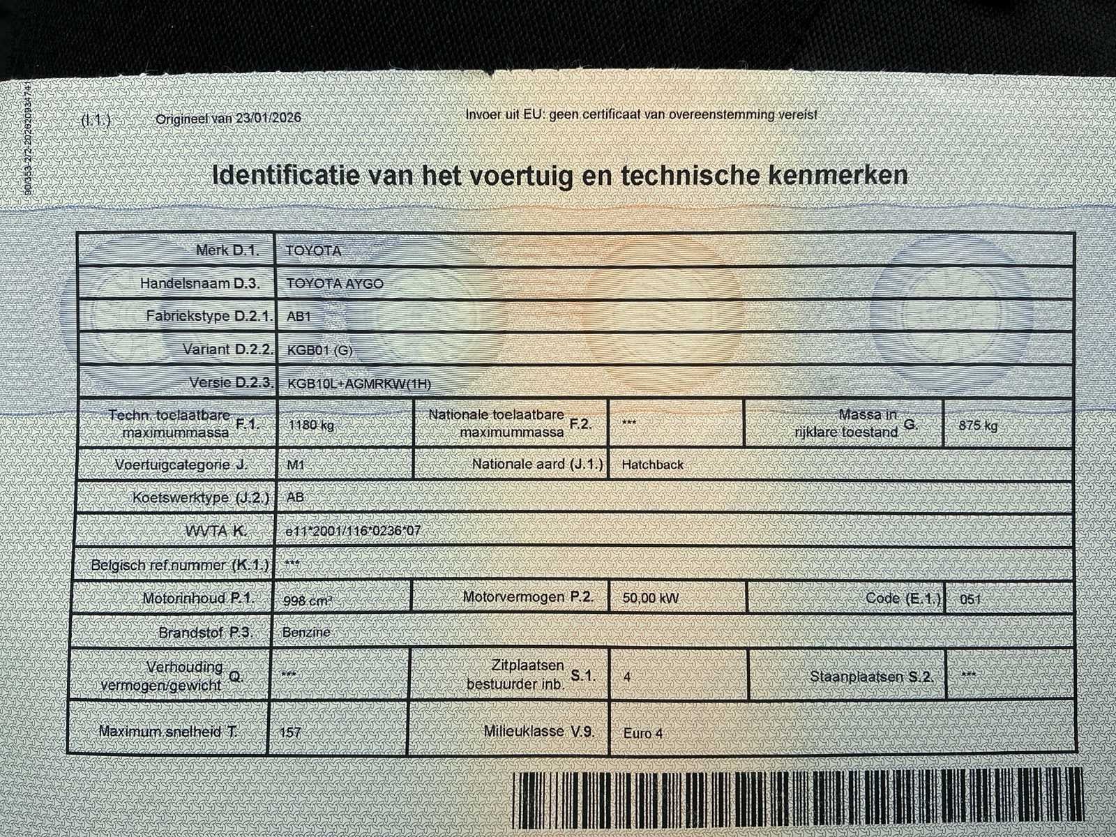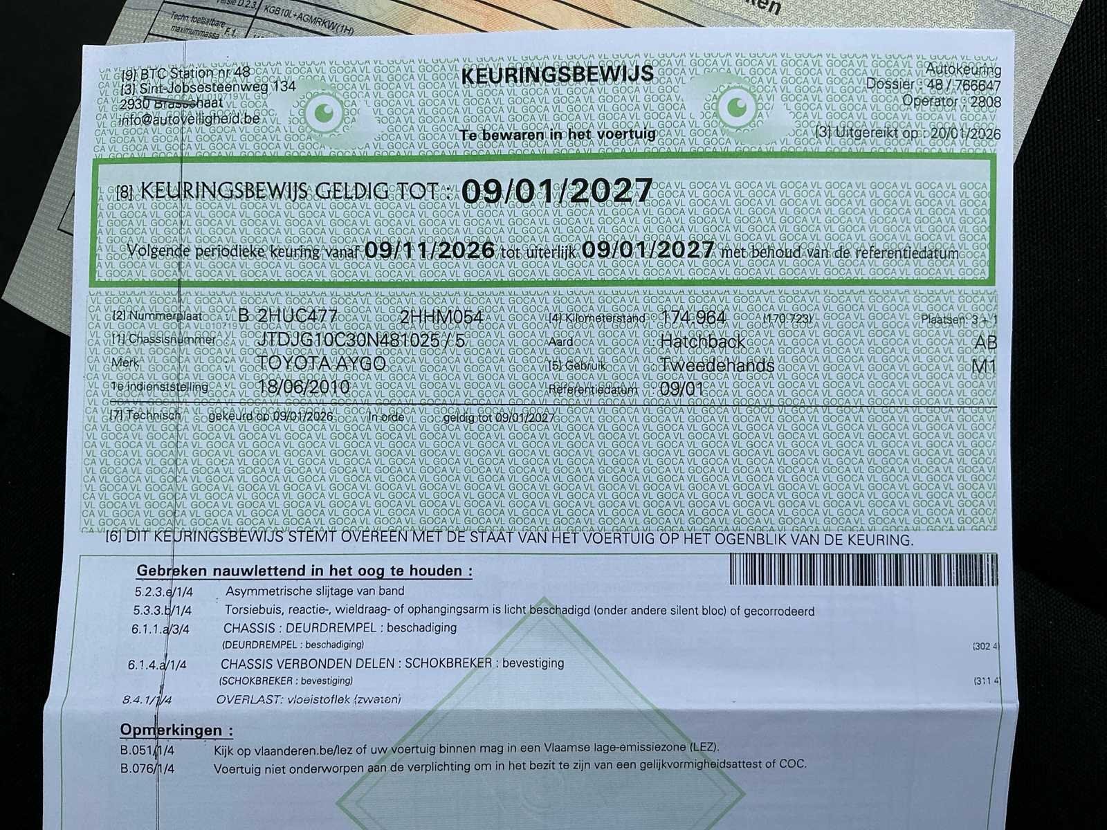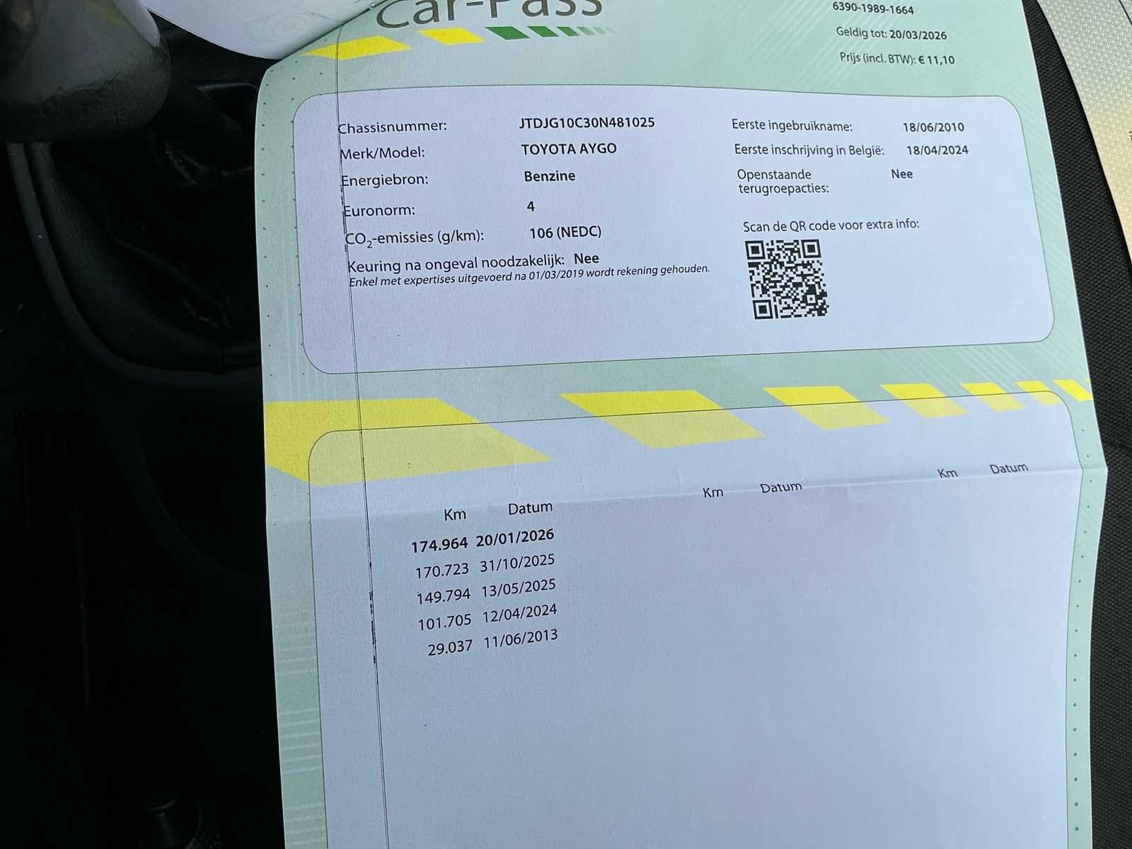 Toyota Aygo Toyota dealer onderhouden tot 100.000 kms No Merk: Toyota Model: Aygo Bouwjaar: 2010 Afgelezen kilometerstand: 178132km Cilinderinhoud: 998cc Vermogen (kW): 50kW Brandstof: Benzine Chassisnummer: JTDG10C30N481025 Datum eerste toelating: 18/06/2010 Aantal zitplaatsen: 4 Kleur: Rood Aantal deuren: 3 Aantal sleutels: 1 Nationaliteit documenten: Belgisch Onderhoudshistorie: Toyota onderhouden tot 100.000 Start en rijdt: Ja Keuringsrapport geldig tot: 09/01/2027 Self drive export possible : true Vavato voert geen technische keuring uit.: true Inschrijvingsbewijs - deel 1 : Ja Inschrijvingsbewijs - deel 2: Ja