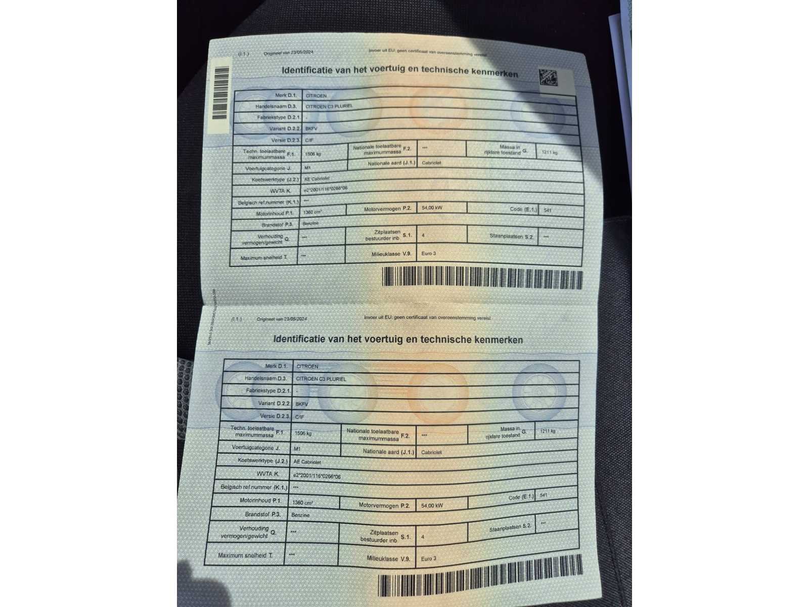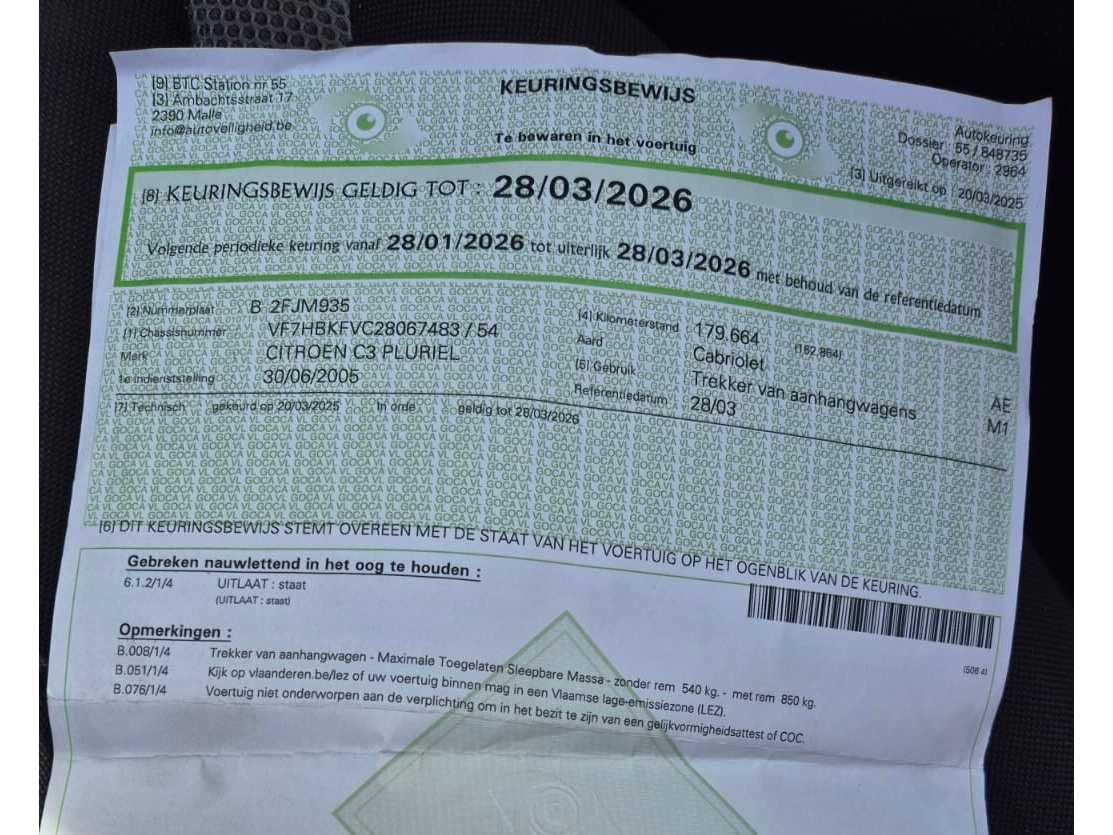 De aangeboden auto zal worden verkocht zonder tweedehandskeuring (van toepassing op particuliere kopers - België) en zonder enige vorm van garantie. De koper aanvaardt het voertuig in de staat waarin het zich bevindt op het moment van aankoop of van toewijzing. Nee Merk: Citroën Model: C3 Pluriel cabriolet Bouwjaar: 2005 Afgelezen kilometerstand: 184632km Cilinderinhoud: 1360cc Vermogen (kW): 54kW Brandstof: benzine Chassisnummer: VF7HBKFVC28067483 Datum eerste toelating: 2005 Aantal zitplaatsen: 4 Emissieklasse: Euro3 Nationaliteit documenten: Belgisch Start en rijdt: Ja Keuringsrapport geldig tot: 03/2026 Vavato voert geen technische keuring uit.: true Inschrijvingsbewijs - deel 1 : Aanwezig Inschrijvingsbewijs - deel 2: Aanwezig