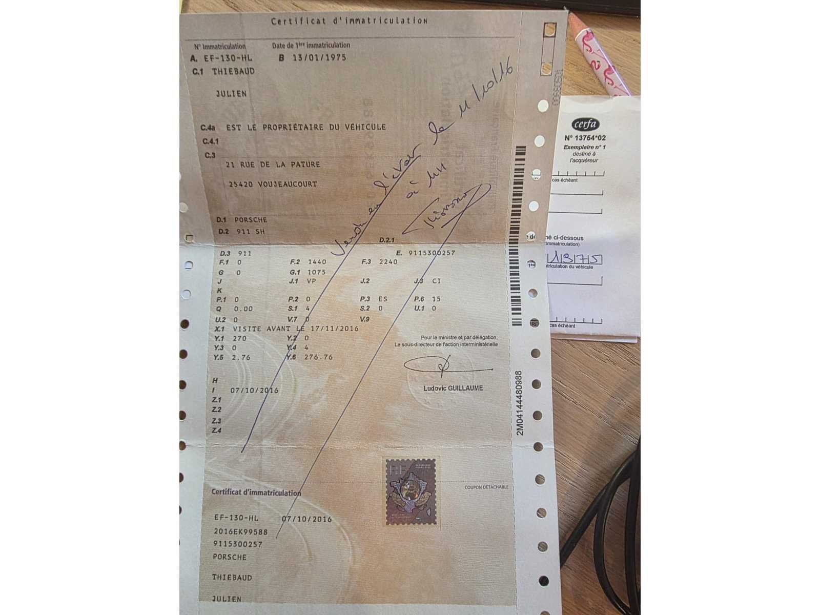 Porsche 911 2.7 S – 1975 – Restauratieproject / Look 964 RS – Motor vervangen – Start Porsche 911 2.7 S, voor het eerst op de weg gebracht op 13-01-1975, met Frans kentekenbewijs. Voertuig gebaseerd op een 911 type G-Serie (modeljaar 1975), die een esthetische transformatie heeft ondergaan tot het uiterlijk van de 964 RS. Dit voertuig is een ideale basis voor restauratie-, terugdaterings- of Singer/restomod-achtige voorbereidingsprojecten. Het voertuig is uitgerust met een vervangen motor. Het begint. De oorspronkelijke cilinderinhoud is 2,7L (2687 cc). Oorspronkelijk indicatief vermogen: 129 kW. Kilometerteller: 53,608 km Configuratie: * Lederen interieur met zitplaatsen en bankjes, type 911 Turbo * Gemodificeerde exterieurstijl 964 RS * 4-zits voertuig (originele configuratie) Algemene toestand: Voertuig wordt gerestaureerd. Aanwezigheid van corrosie op het chassis en de onderstel (zie foto's). Groot werk te plannen. Voertuig opgeslagen, onbeweeglijk. Mechanica: * Motor vervangen, start * Mechanische staat niet getest op de weg * Voertuig verkocht zonder technische inspectie Inbegrepen items: * Achterspoiler (uit elkaar gehaald) * Uitlaatleiding aanwezig Belangrijke informatie: * Chassisnummer: 9115300257 * Origineel voertuig uit 1975 (type G-Serie) * Cosmetische transformatie – niet in overeenstemming met een originele Porsche 964 Voertuig bedoeld voor ervaren amateurs of professionals Non Chassisnummer: 911530025 Merk: Porsche Model: 911 Type: 2.7 S Afgelezen kilometerstand: 53608km Brandstof: Benzine Datum eerste toelating: 1975 Nationaliteit documenten: Engels Aandrijving: Links Transmissie: Handboek Vermogen (pk): 175 Vermogen (kW): 129 Aantal deuren: 2 Aantal zitplaatsen: 4 Aantal sleutels: 1 Kleur: Geel Cilinderinhoud: 2687
