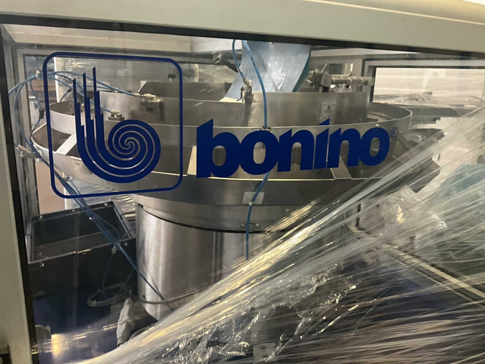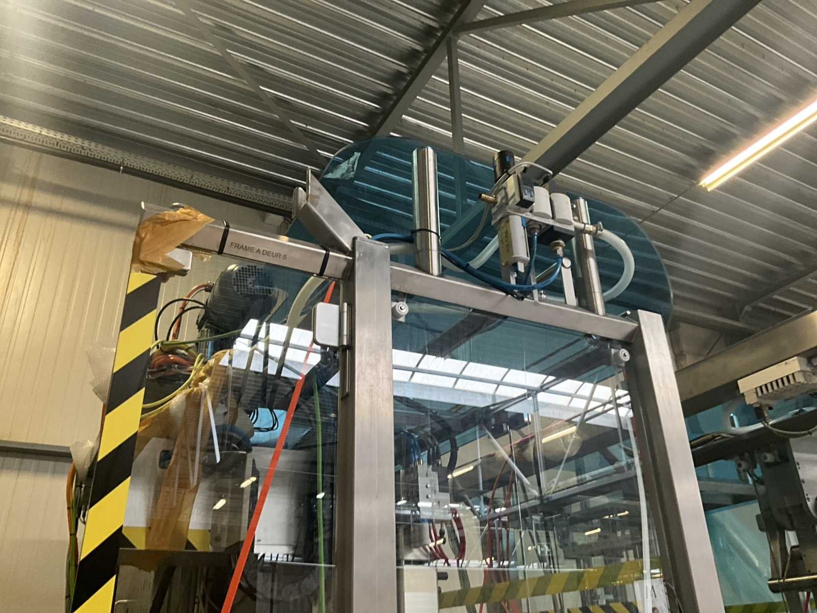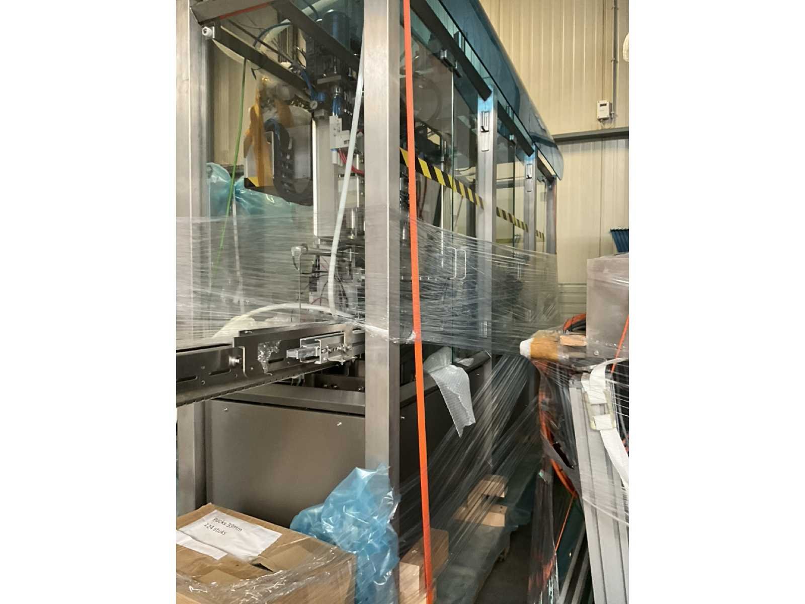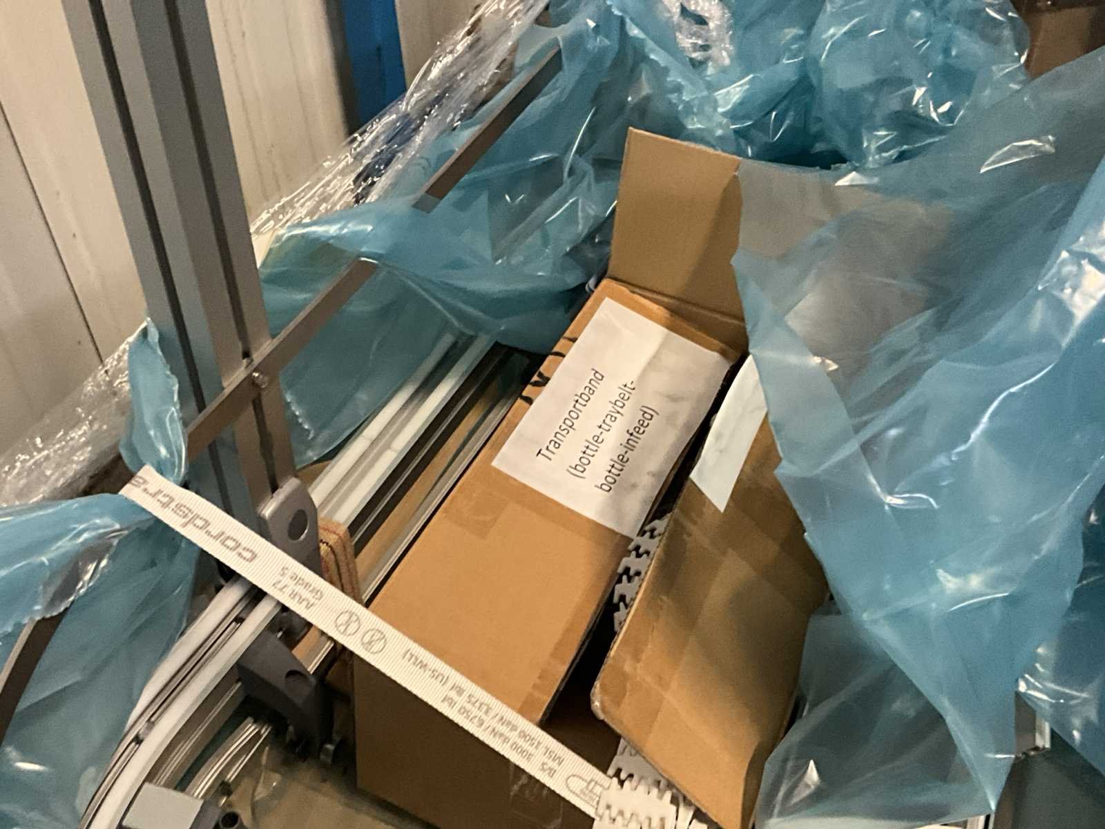 Bestaande uit 2 diverse transportband frames wo van ca. 5 lpm en 3 lpm x. 140 cm en 260 cm hoog wo vv diverse glazen deuren, compleet met feeder bowl BONINO aanzetstuk van ca. 120 x 120 x 160 cm, RvS pompen unit, de-pocker unit, en extra transportband en sturings/schakelkast RITTAL van ca. 110 x 50 x 195 cm hoog. Nee