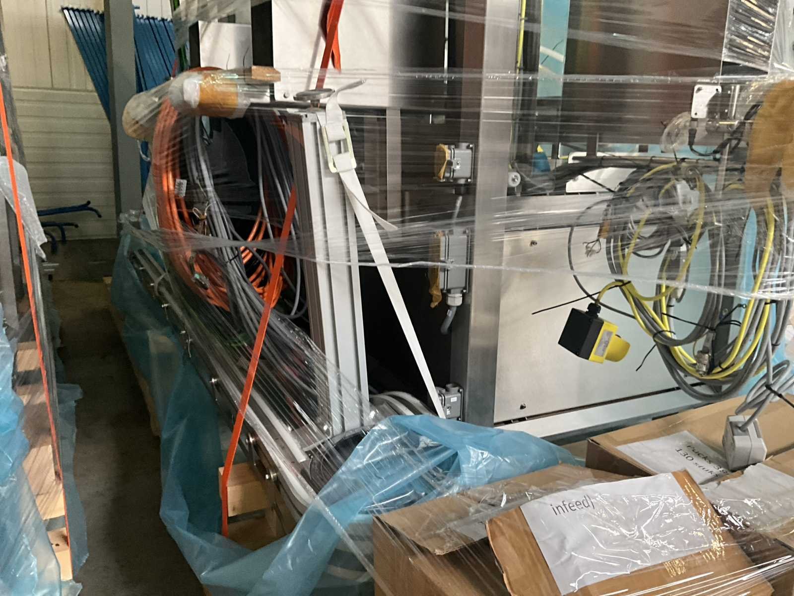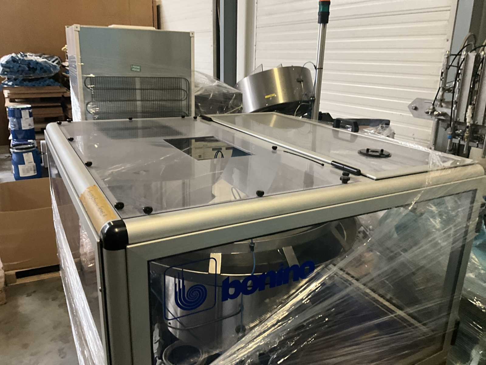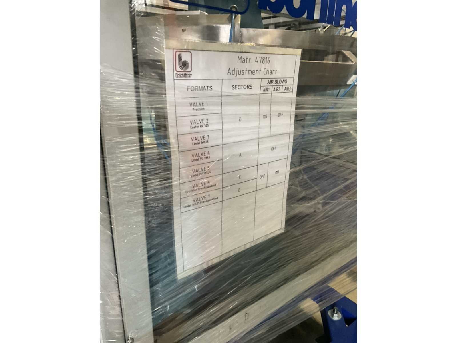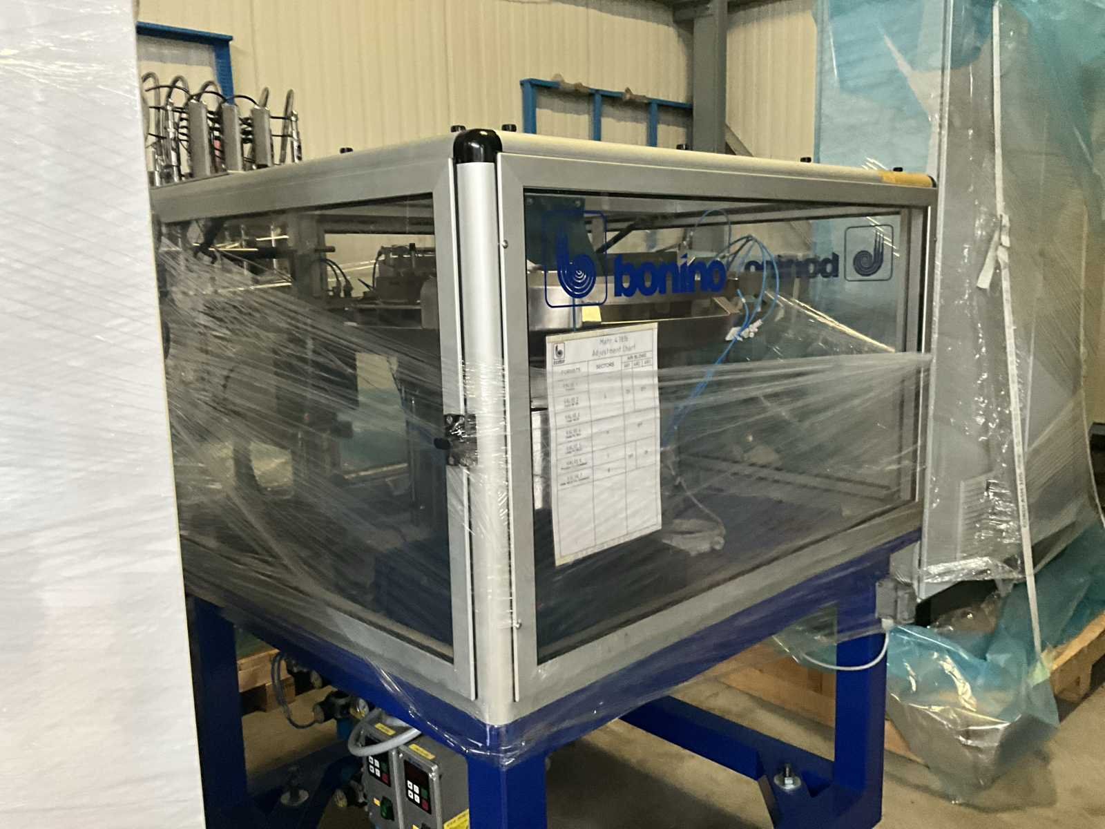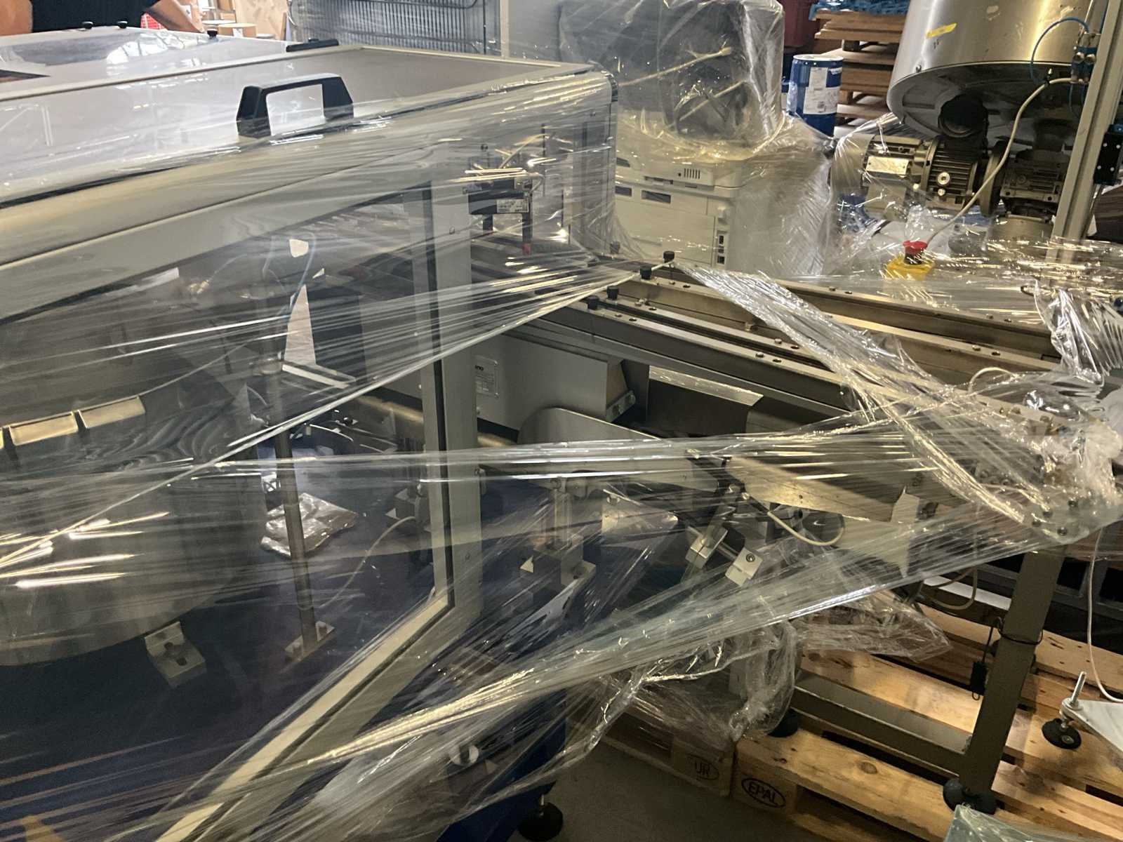 Bestaande uit 2 diverse transportband frames wo van ca. 5 lpm en 3 lpm x. 140 cm en 260 cm hoog wo vv diverse glazen deuren, compleet met feeder bowl BONINO aanzetstuk van ca. 120 x 120 x 160 cm, RvS pompen unit, de-pocker unit, en extra transportband en sturings/schakelkast RITTAL van ca. 110 x 50 x 195 cm hoog. Nee