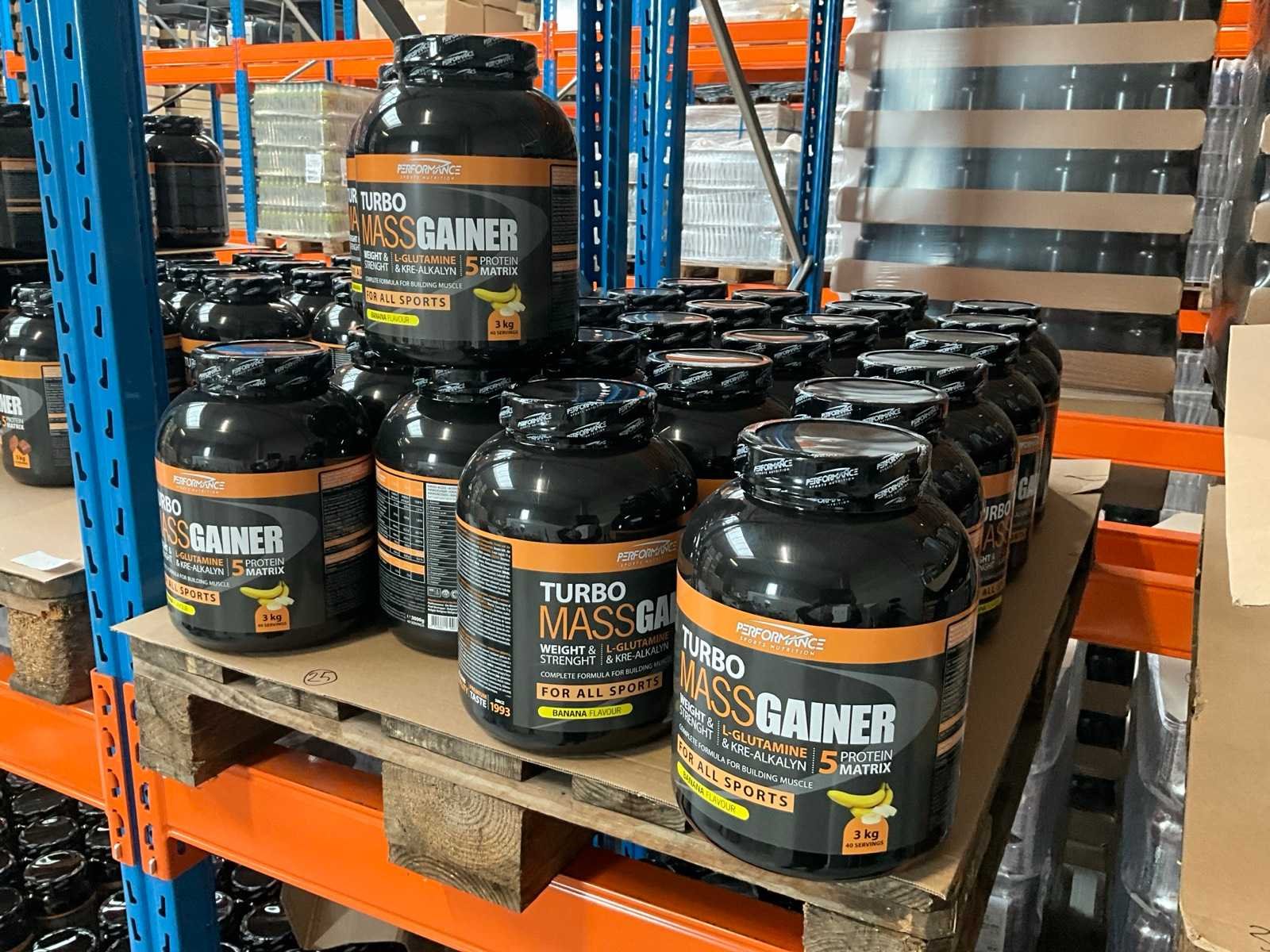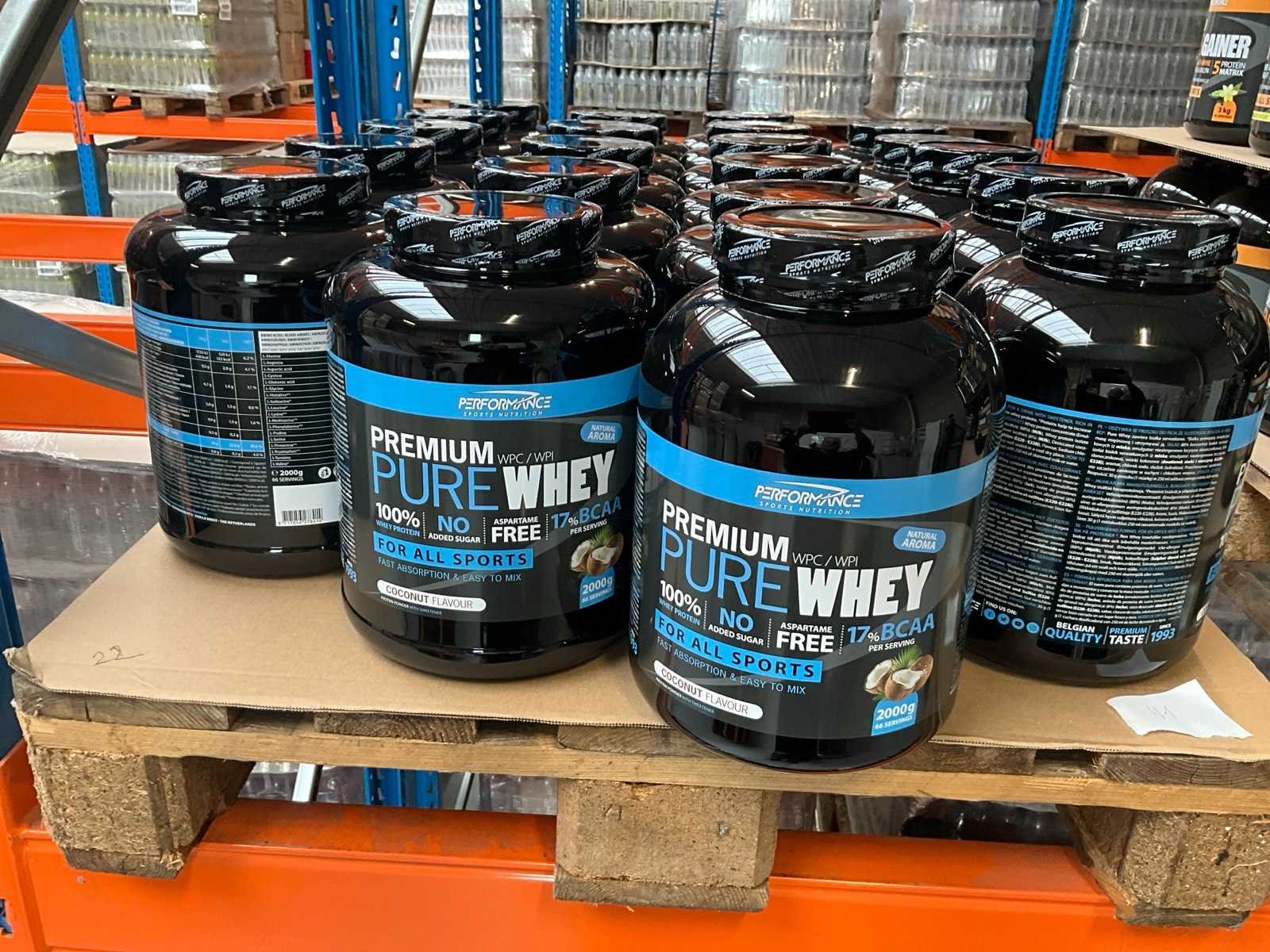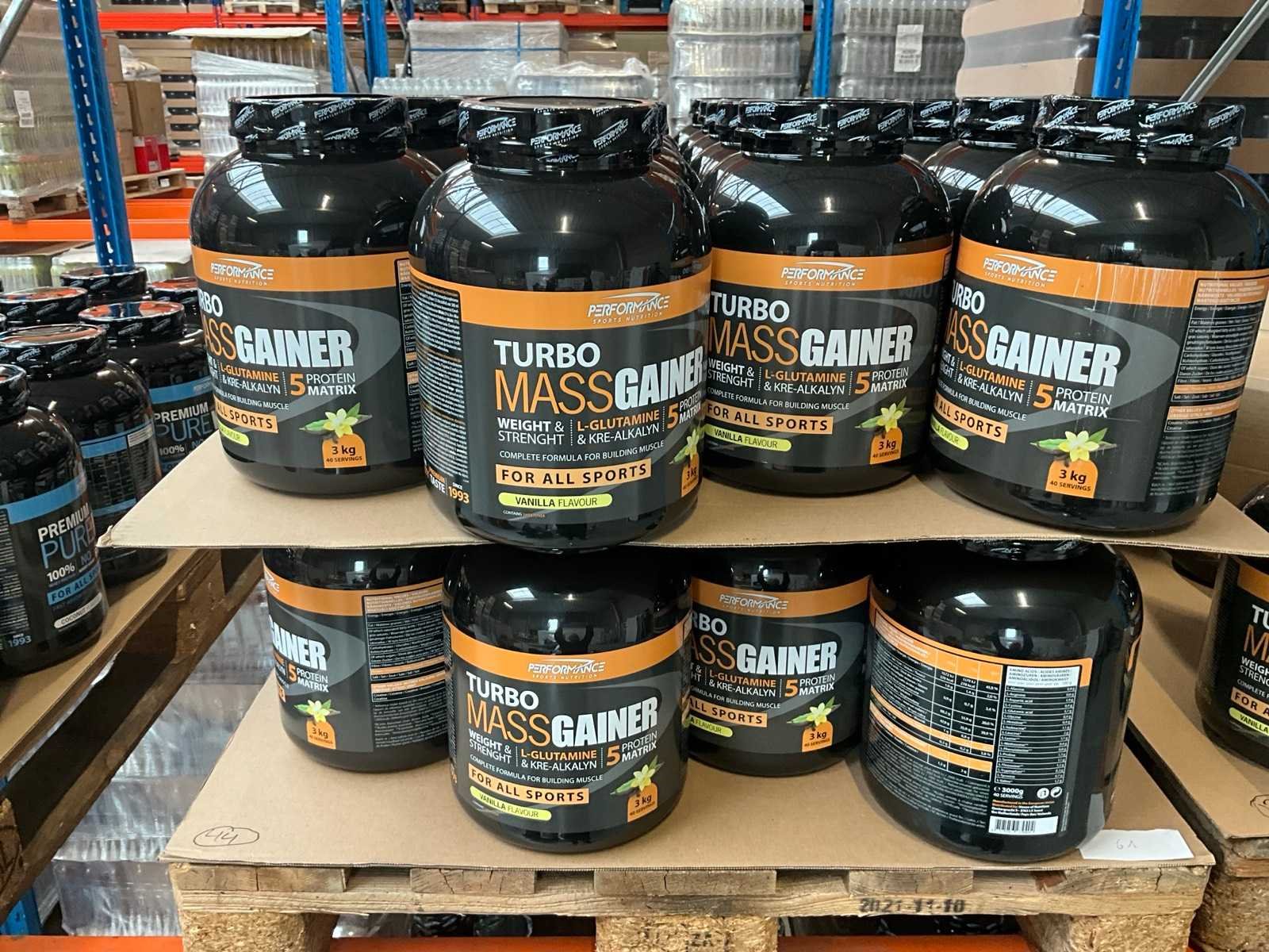 Circa 190 stuks, waaronder: 48x 2000g Premium Pure Whey cappuccinosmaak 22x 2000g Premium Pure Whey cocosnootsmaak 44x 3000g Turbo Mass Gainer vanillesmaak 13x 3000g Turbo Mass Gainer chocoladesmaak 25x 3000g Turbo Mass Gainer banaansmaak 38x 3000g Turbo Mass Gainer aardbeismaak Liggende op 6 pallets Nee Merk: Performance Sports nutrition Gewicht: 1000g