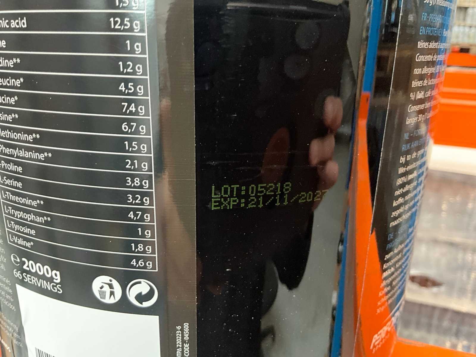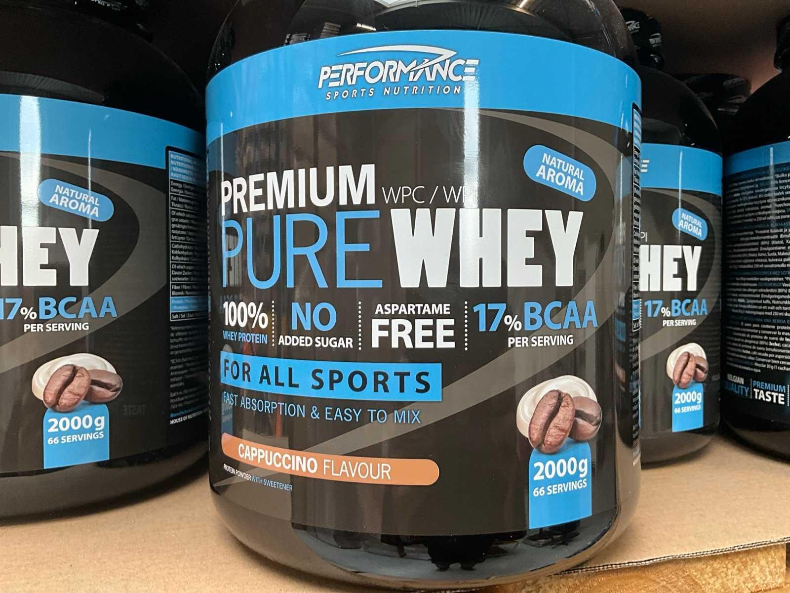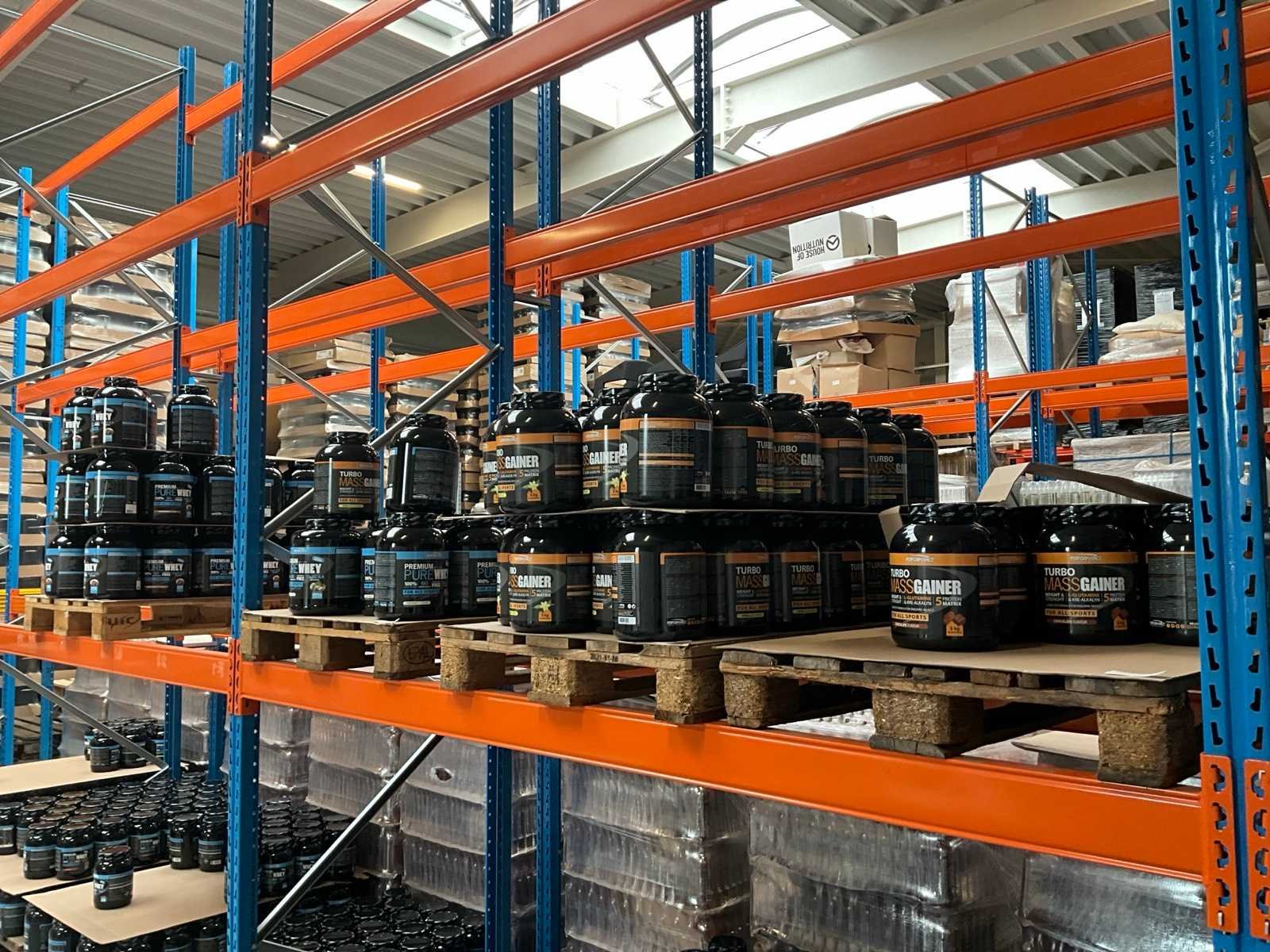 Circa 190 stuks, waaronder: 48x 2000g Premium Pure Whey cappuccinosmaak 22x 2000g Premium Pure Whey cocosnootsmaak 44x 3000g Turbo Mass Gainer vanillesmaak 13x 3000g Turbo Mass Gainer chocoladesmaak 25x 3000g Turbo Mass Gainer banaansmaak 38x 3000g Turbo Mass Gainer aardbeismaak Liggende op 6 pallets Nee Merk: Performance Sports nutrition Gewicht: 1000g