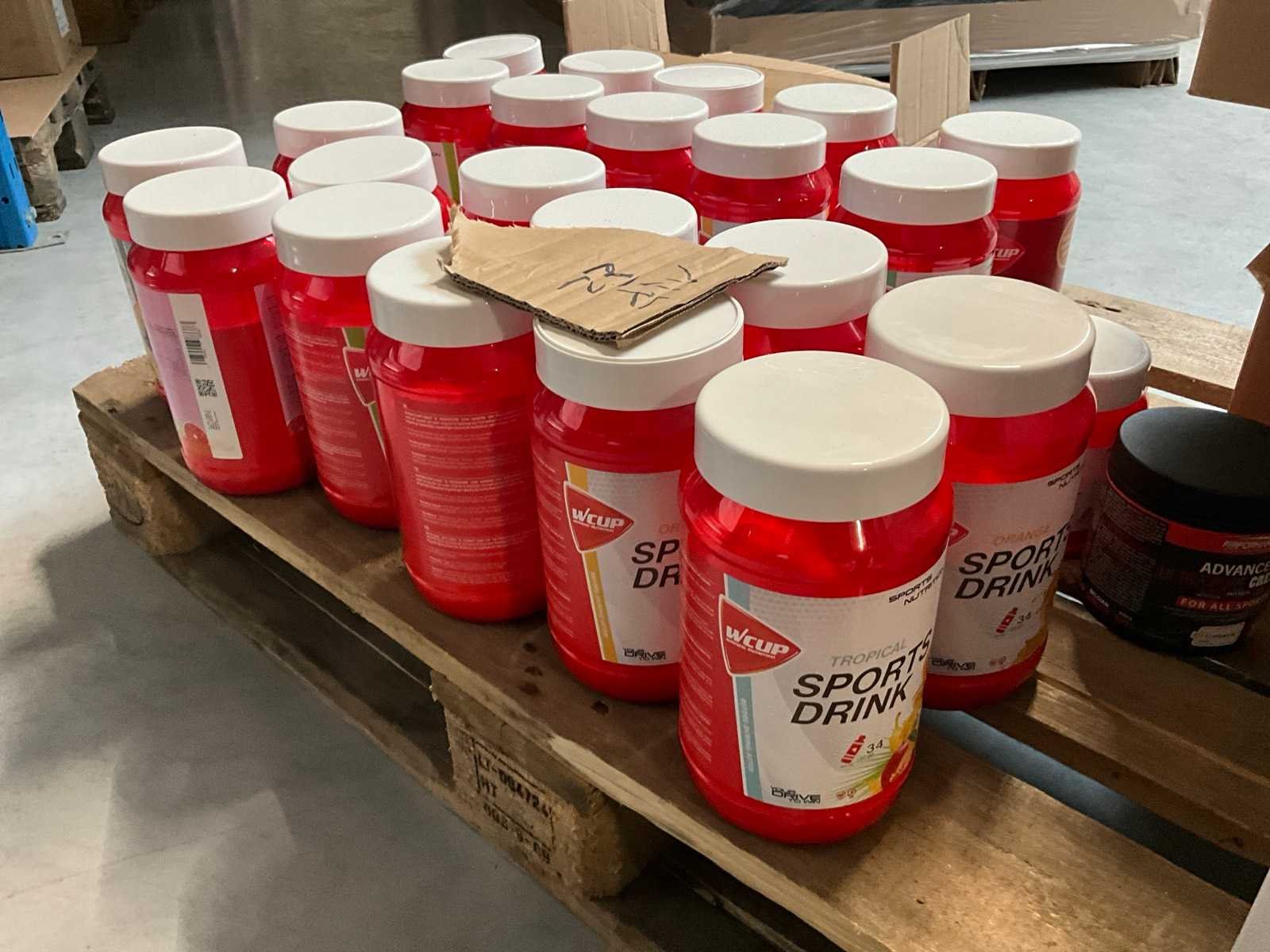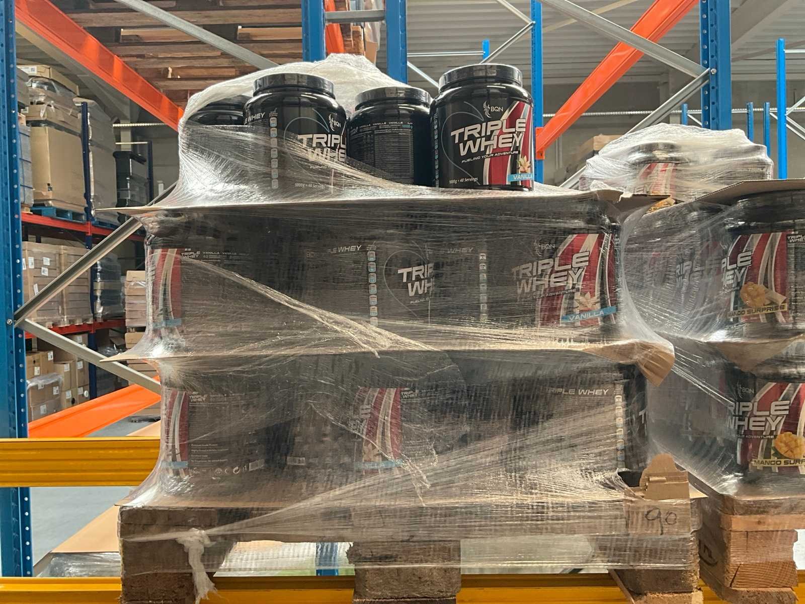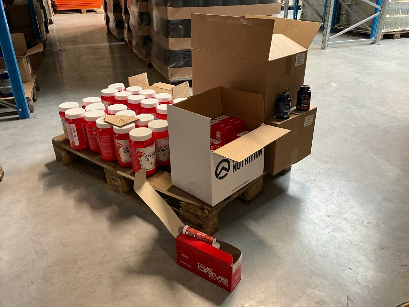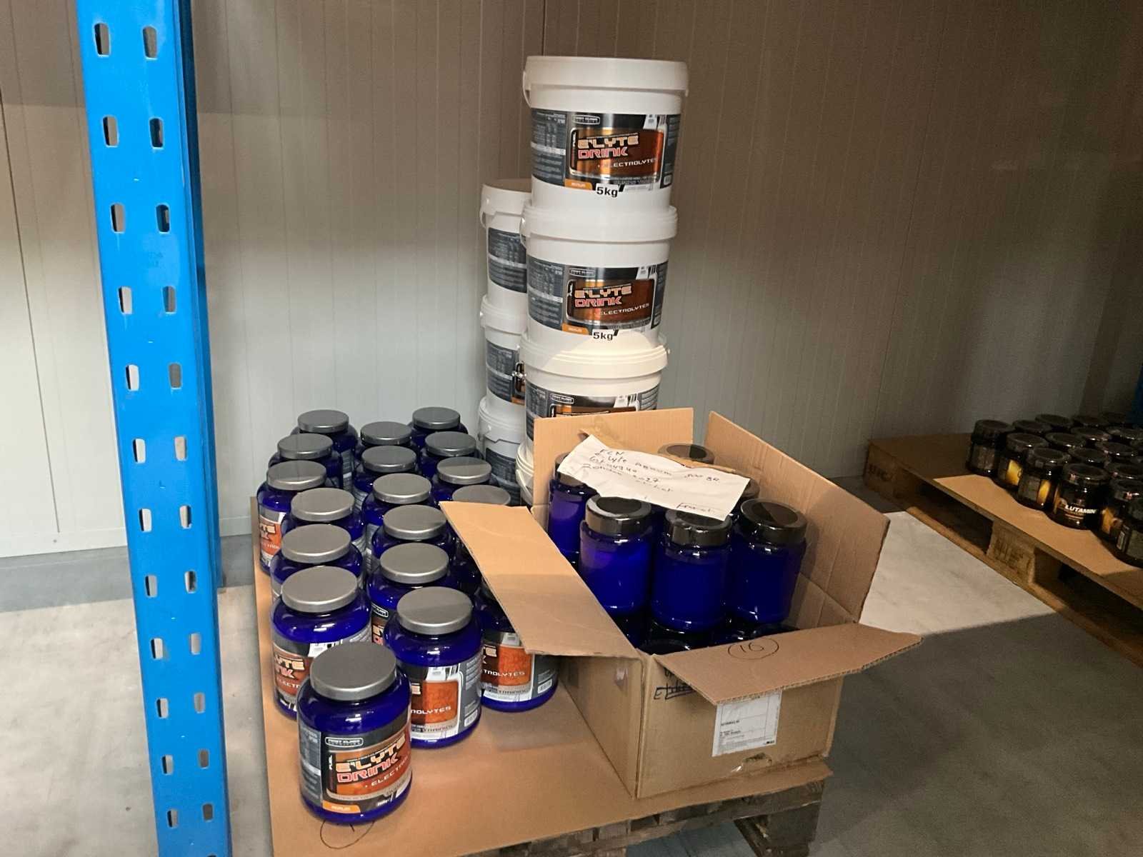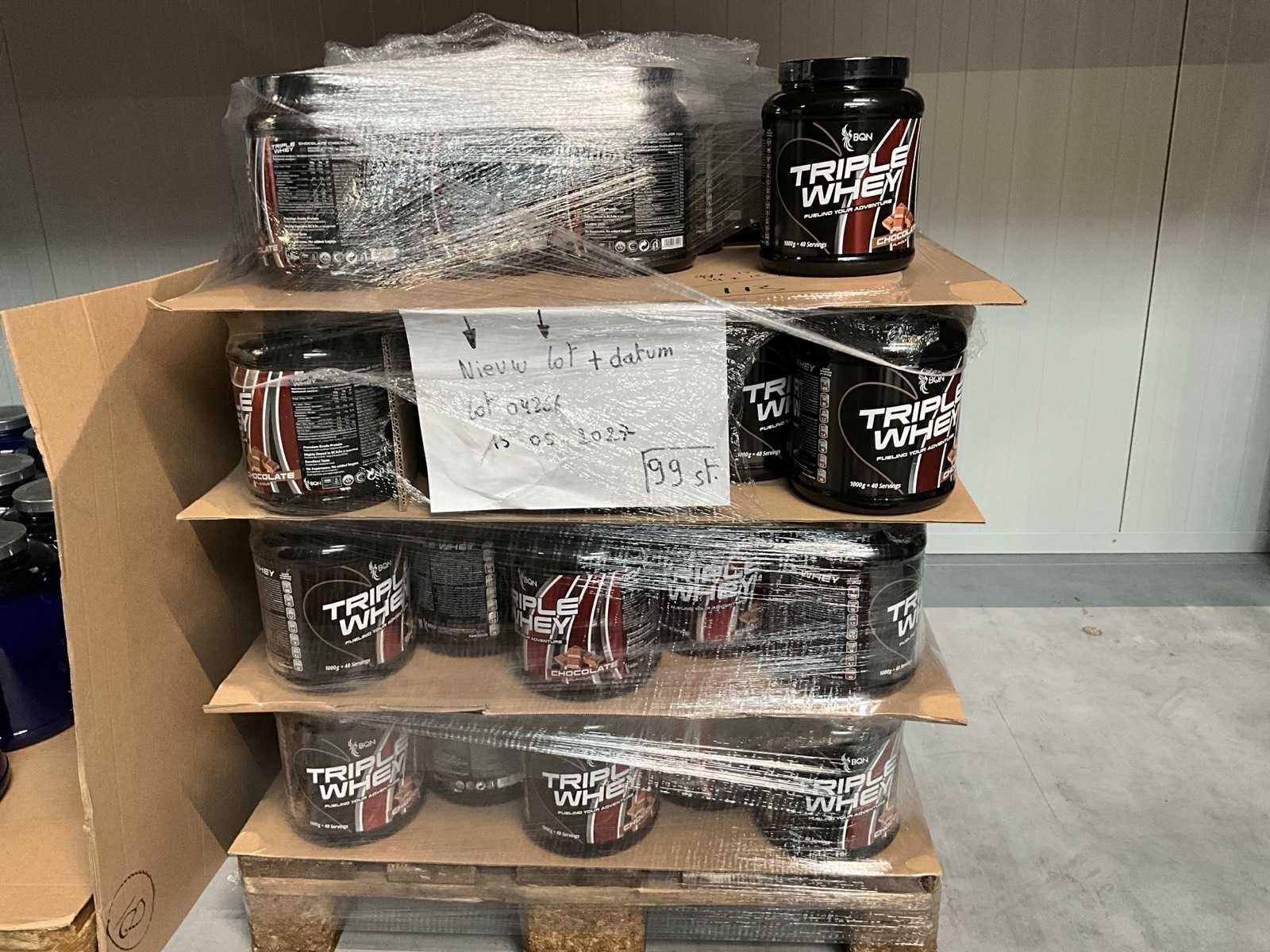 Circa 190 stuks, waaronder: 34x BQN Triple Whey 1000g cookies & cream 86x BQN Triple Whey 1000g strawberry 90x BQN Triple Whey 1000g vanilla 39x BQN Triple Whey 1000g mango surprise 50x First Class Nutrition 900g chocolate 18x First Class Nutrition 2000g chocolate 113x BQN Triple Whey 1000g chocolate 45x M Double You 360g Glutamine powder 23x diverse WCUP sports drinks 19x First Class Nutrition Elyte Drink 2000g 16x First Class Nutrition Elyte Drink 800g zonder etiket 37x First Class Nutrition Test-X 144 capsules 30x First Class Nutrition Premium Multivit 60 capsules 6x 12x 40ml diverse WCUP gels 3x 12 electrolyte tablets ( 12stuks ) waaronder 1 aangesproken 1x 20 x 30g WCUP sport nougat 7x First Class Nutrition Elyte Drink 5kg 207 x Bèta Alaline 120 caps 109x M Double You Whey Amino 400 tablets Liggende op 10 pallets Nee Gewicht: 1000g