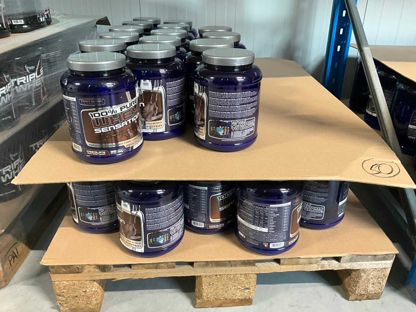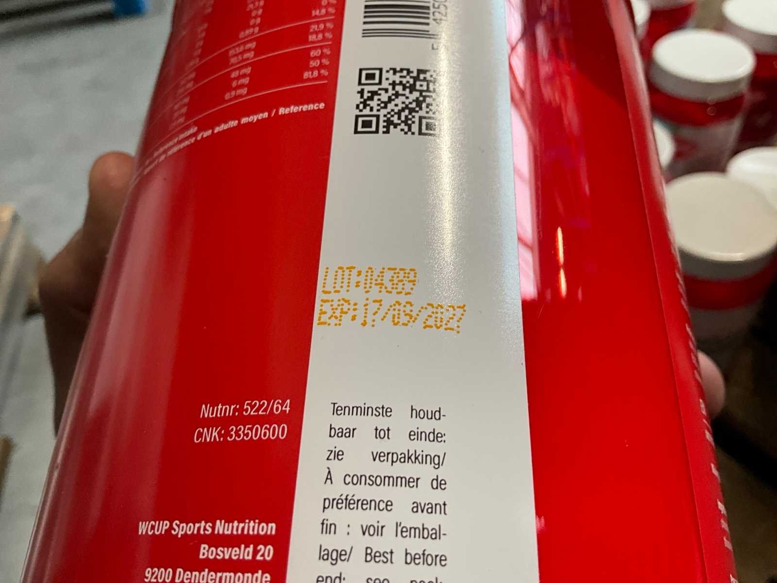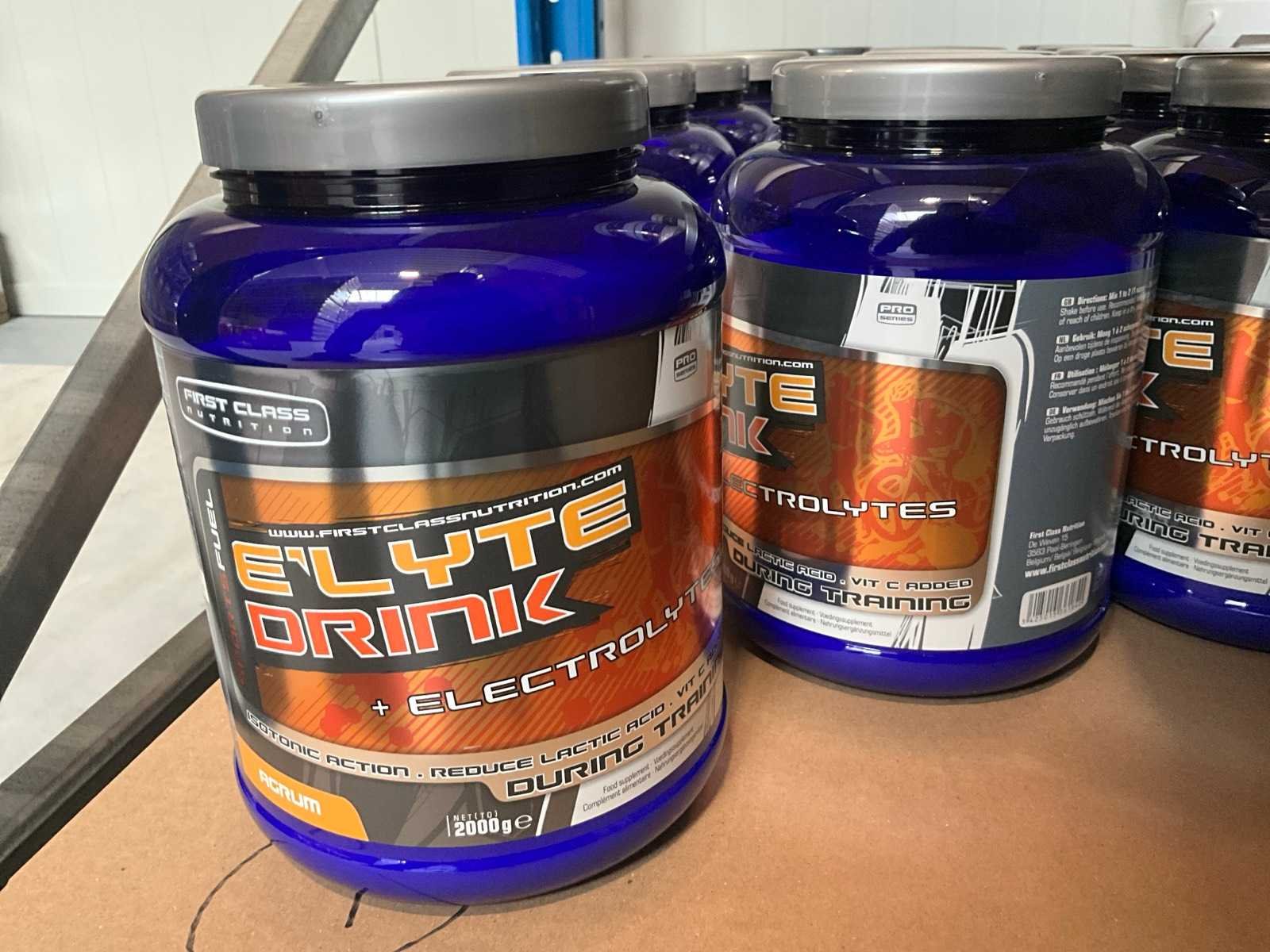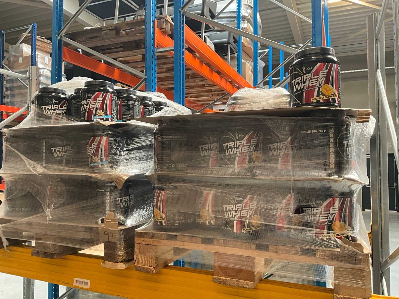 Circa 190 stuks, waaronder: 34x BQN Triple Whey 1000g cookies & cream 86x BQN Triple Whey 1000g strawberry 90x BQN Triple Whey 1000g vanilla 39x BQN Triple Whey 1000g mango surprise 50x First Class Nutrition 900g chocolate 18x First Class Nutrition 2000g chocolate 113x BQN Triple Whey 1000g chocolate 45x M Double You 360g Glutamine powder 23x diverse WCUP sports drinks 19x First Class Nutrition Elyte Drink 2000g 16x First Class Nutrition Elyte Drink 800g zonder etiket 37x First Class Nutrition Test-X 144 capsules 30x First Class Nutrition Premium Multivit 60 capsules 6x 12x 40ml diverse WCUP gels 3x 12 electrolyte tablets ( 12stuks ) waaronder 1 aangesproken 1x 20 x 30g WCUP sport nougat 7x First Class Nutrition Elyte Drink 5kg 207 x Bèta Alaline 120 caps 109x M Double You Whey Amino 400 tablets Liggende op 10 pallets Nee Gewicht: 1000g