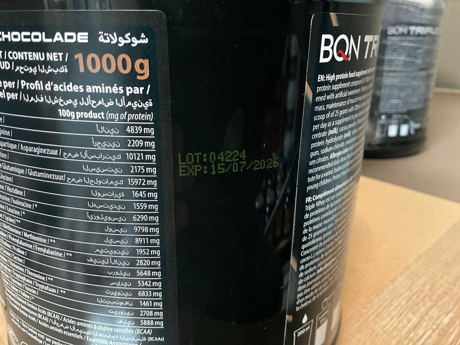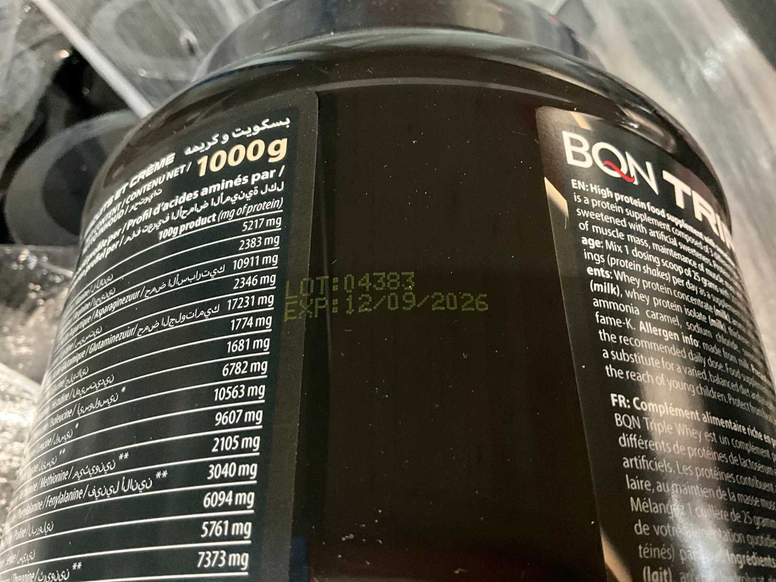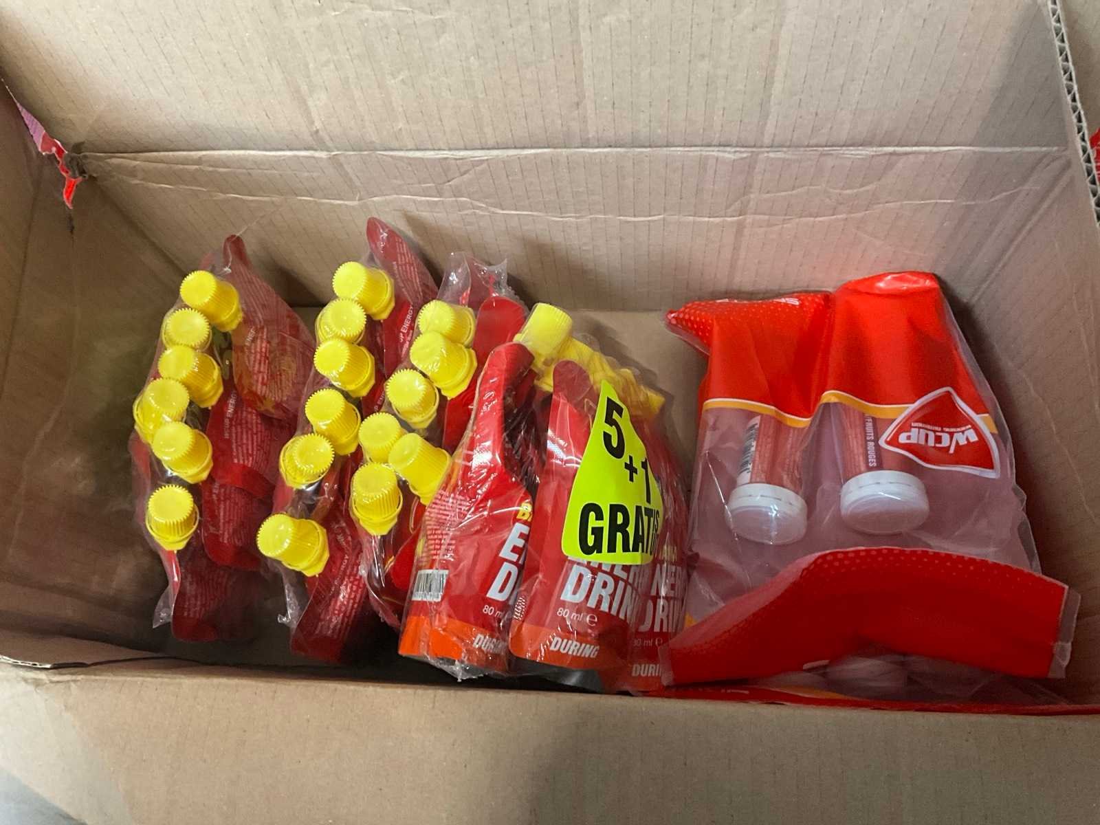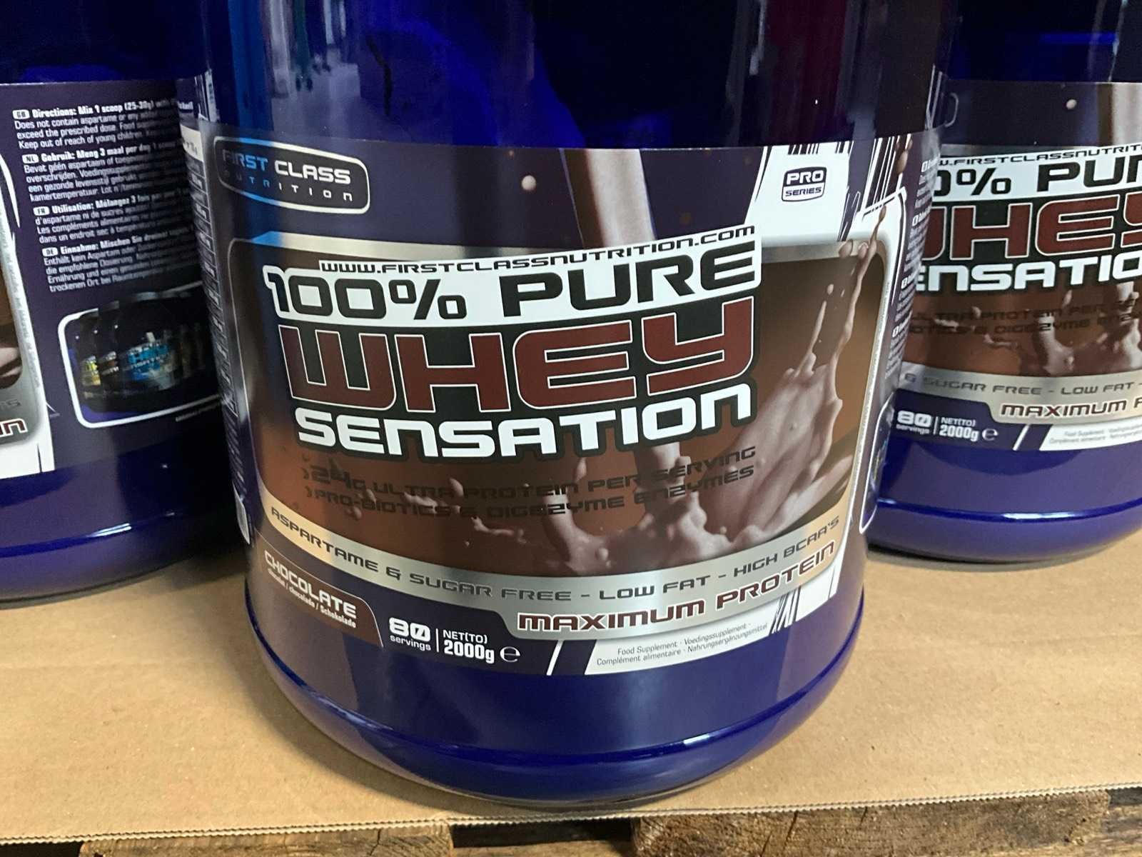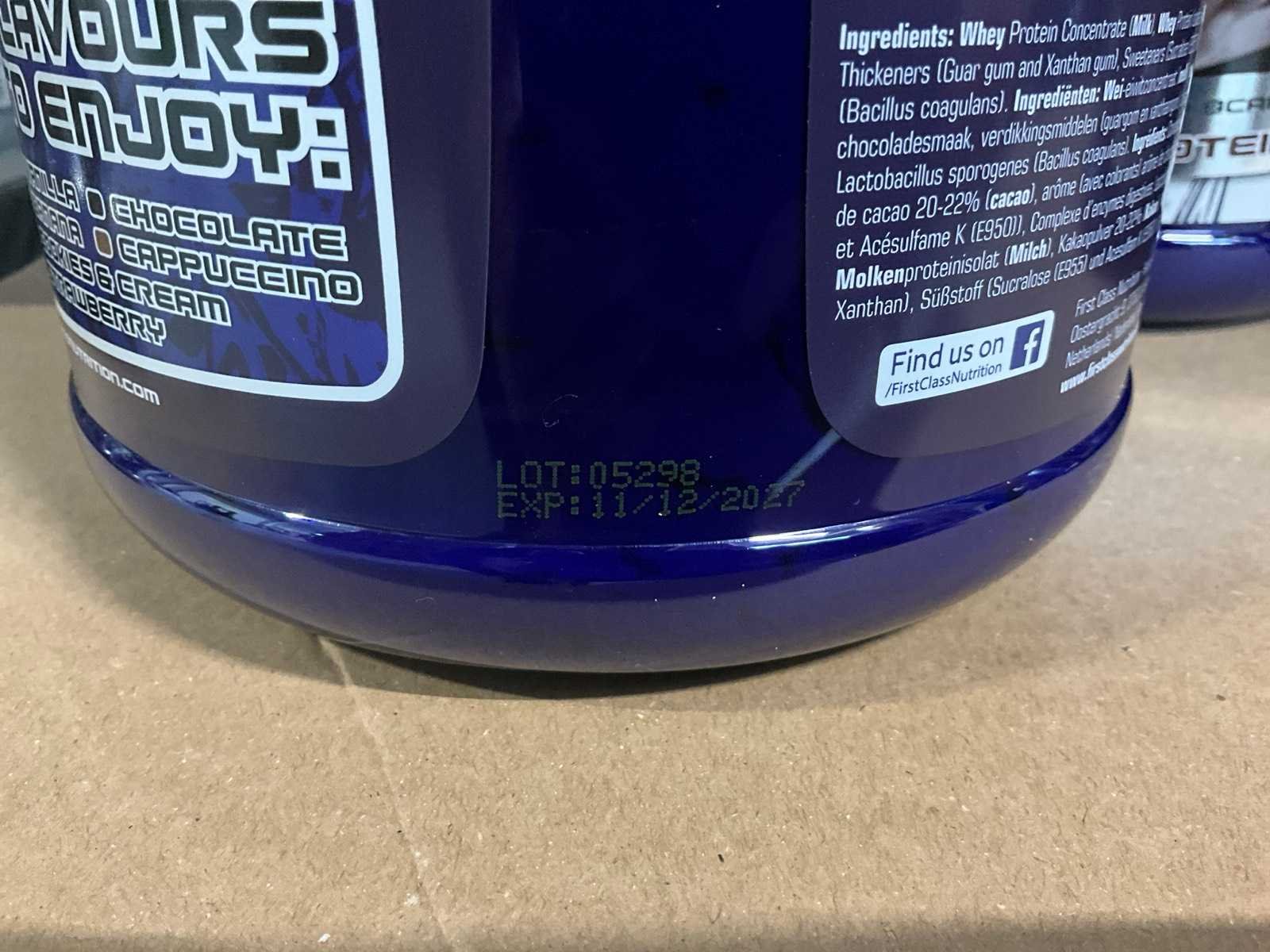 Circa 190 stuks, waaronder: 34x BQN Triple Whey 1000g cookies & cream 86x BQN Triple Whey 1000g strawberry 90x BQN Triple Whey 1000g vanilla 39x BQN Triple Whey 1000g mango surprise 50x First Class Nutrition 900g chocolate 18x First Class Nutrition 2000g chocolate 113x BQN Triple Whey 1000g chocolate 45x M Double You 360g Glutamine powder 23x diverse WCUP sports drinks 19x First Class Nutrition Elyte Drink 2000g 16x First Class Nutrition Elyte Drink 800g zonder etiket 37x First Class Nutrition Test-X 144 capsules 30x First Class Nutrition Premium Multivit 60 capsules 6x 12x 40ml diverse WCUP gels 3x 12 electrolyte tablets ( 12stuks ) waaronder 1 aangesproken 1x 20 x 30g WCUP sport nougat 7x First Class Nutrition Elyte Drink 5kg 207 x Bèta Alaline 120 caps 109x M Double You Whey Amino 400 tablets Liggende op 10 pallets Nee Gewicht: 1000g