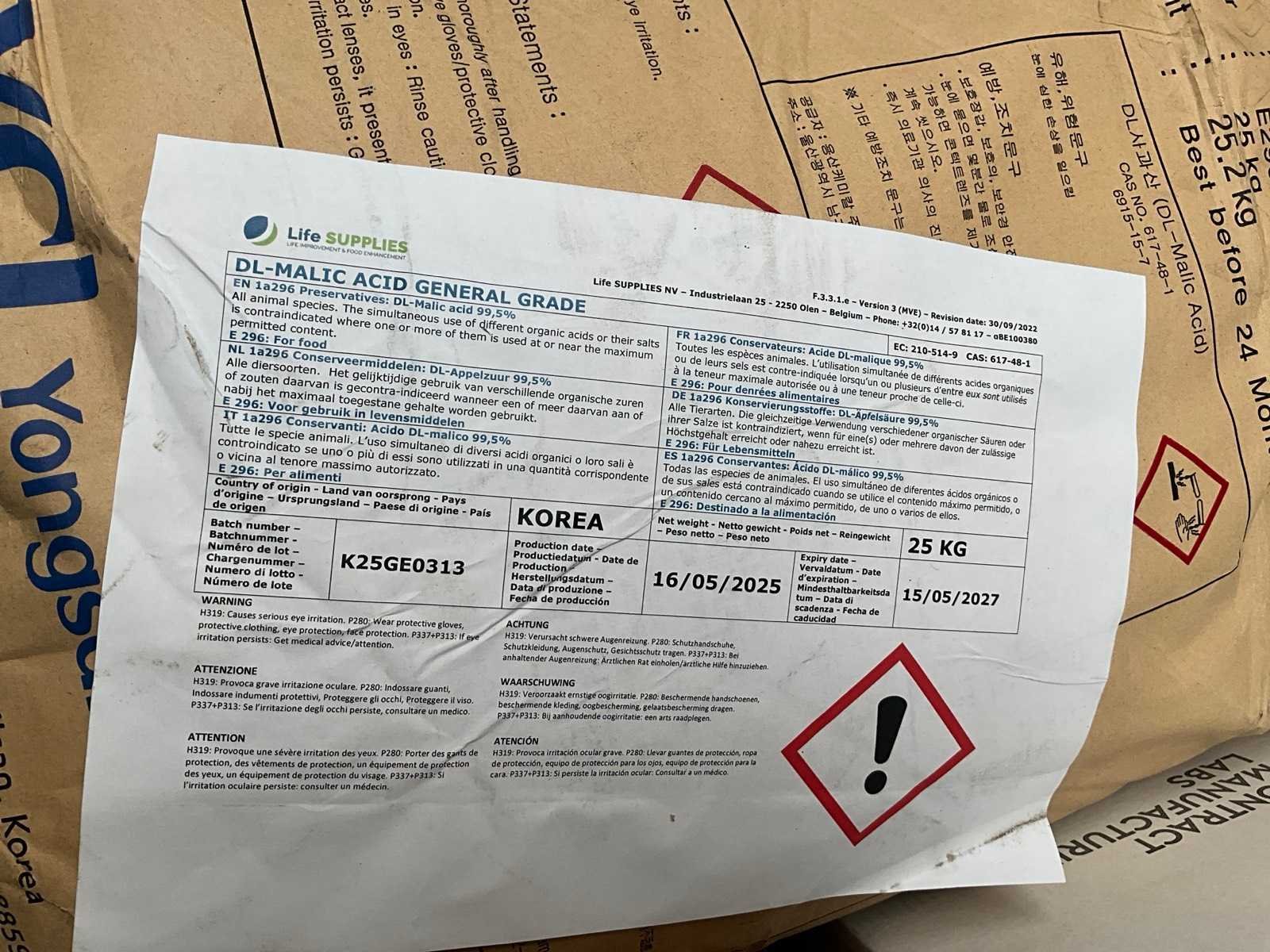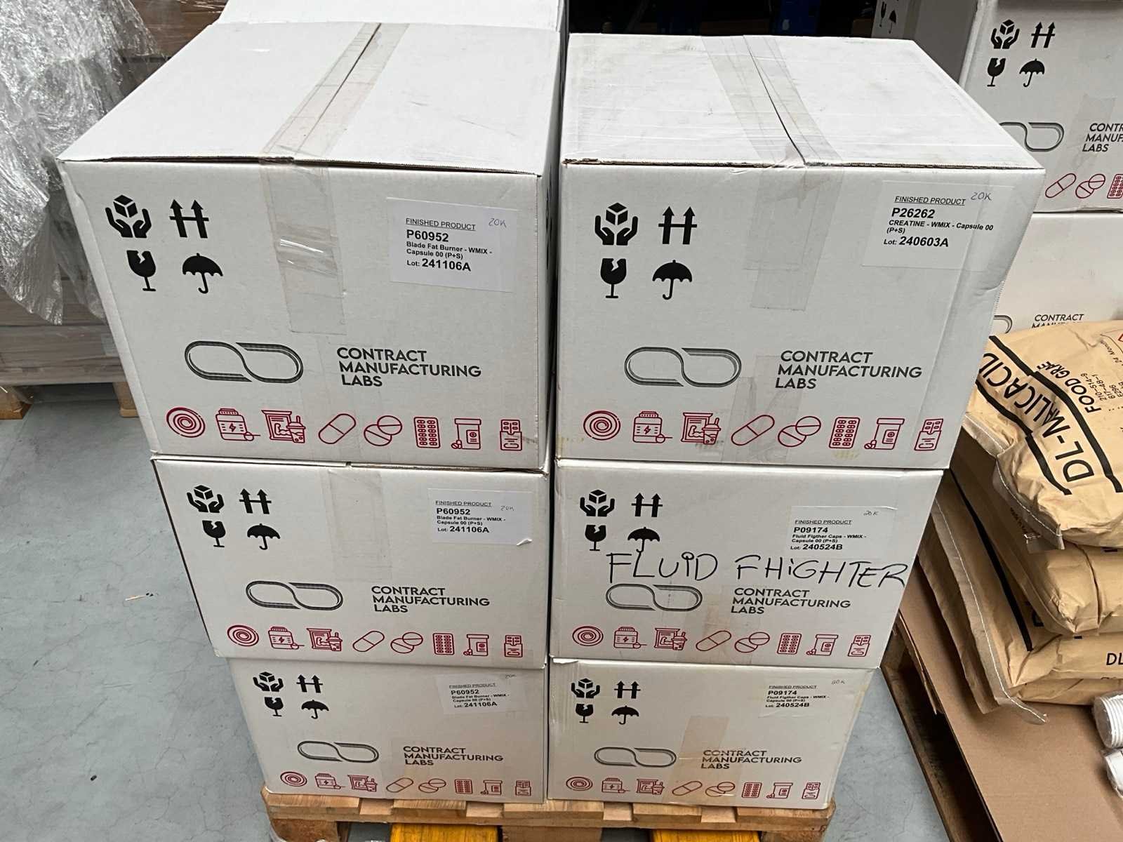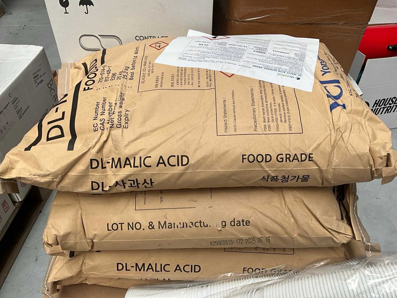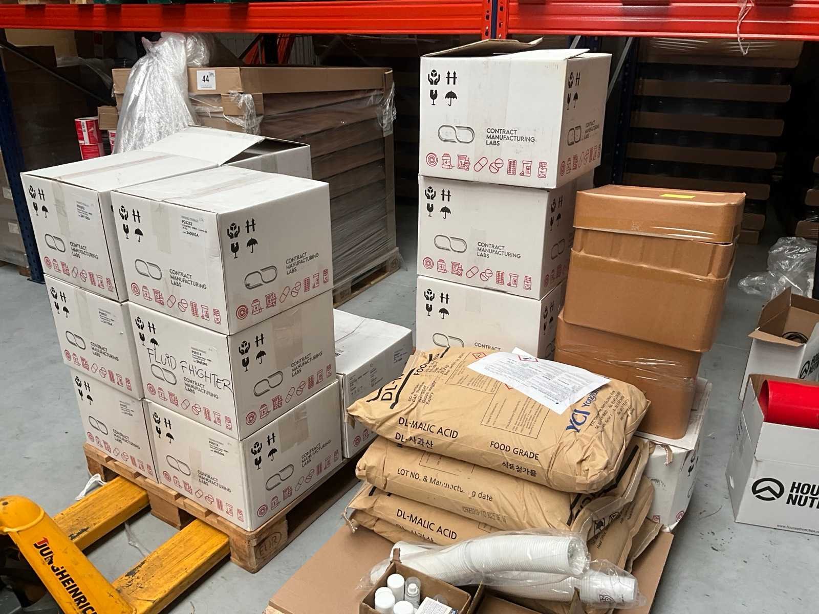 Waaronder 4x 25kg DL- Malic acid 14 dozen diverse capsules waaronder Fat Burner, Creatine, fluid fighter, yellow burner 2 dozen multivitamine Liggende op 2 pallets Nee