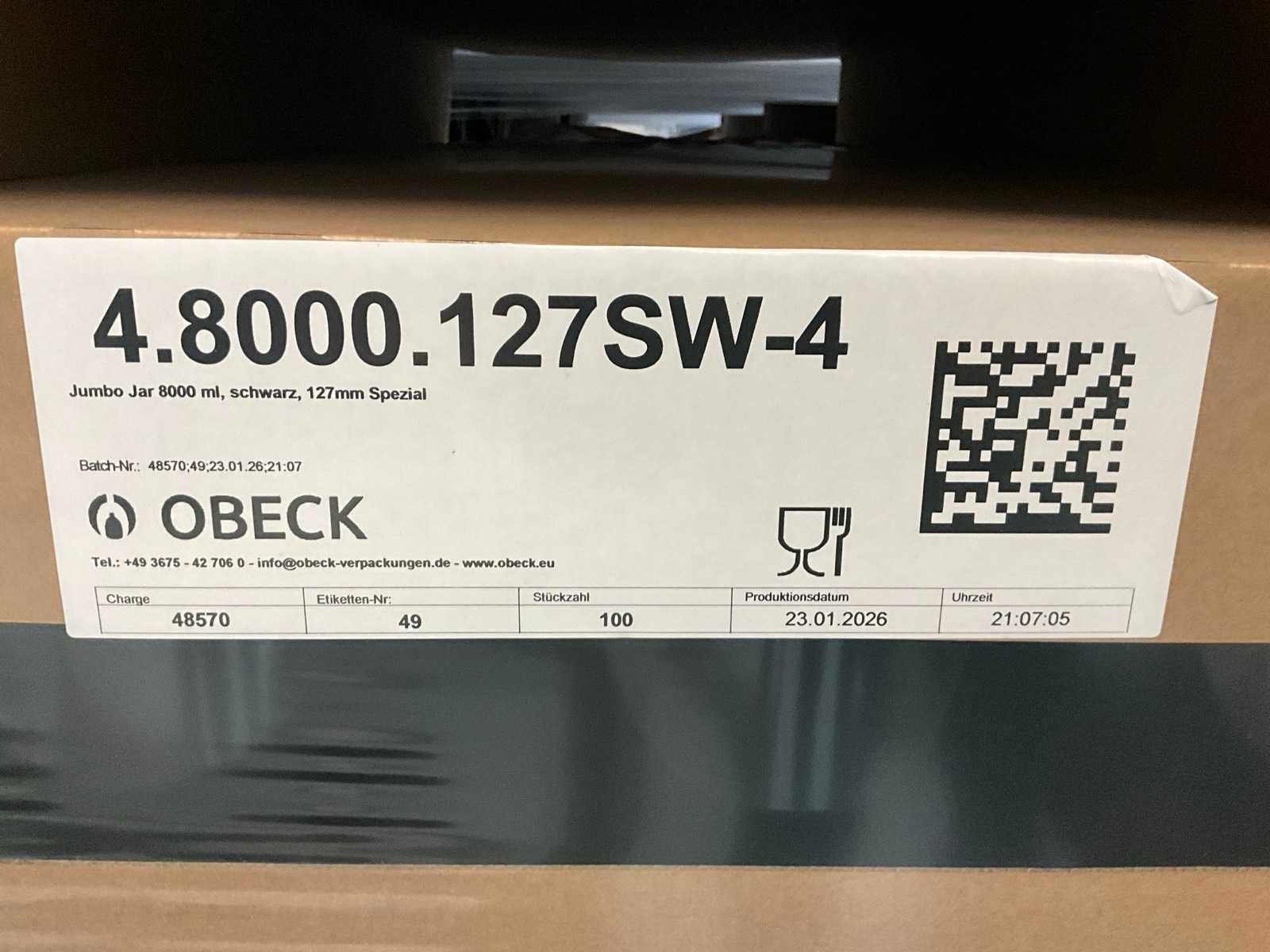 Liggende op 20 pallets Nee Merk: Obeck Model: Jumbo jar Product type: PET zwart 127mm Spezial 8000ml