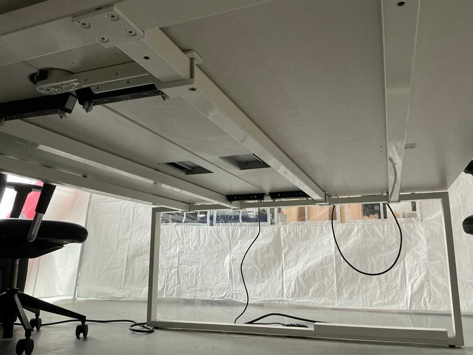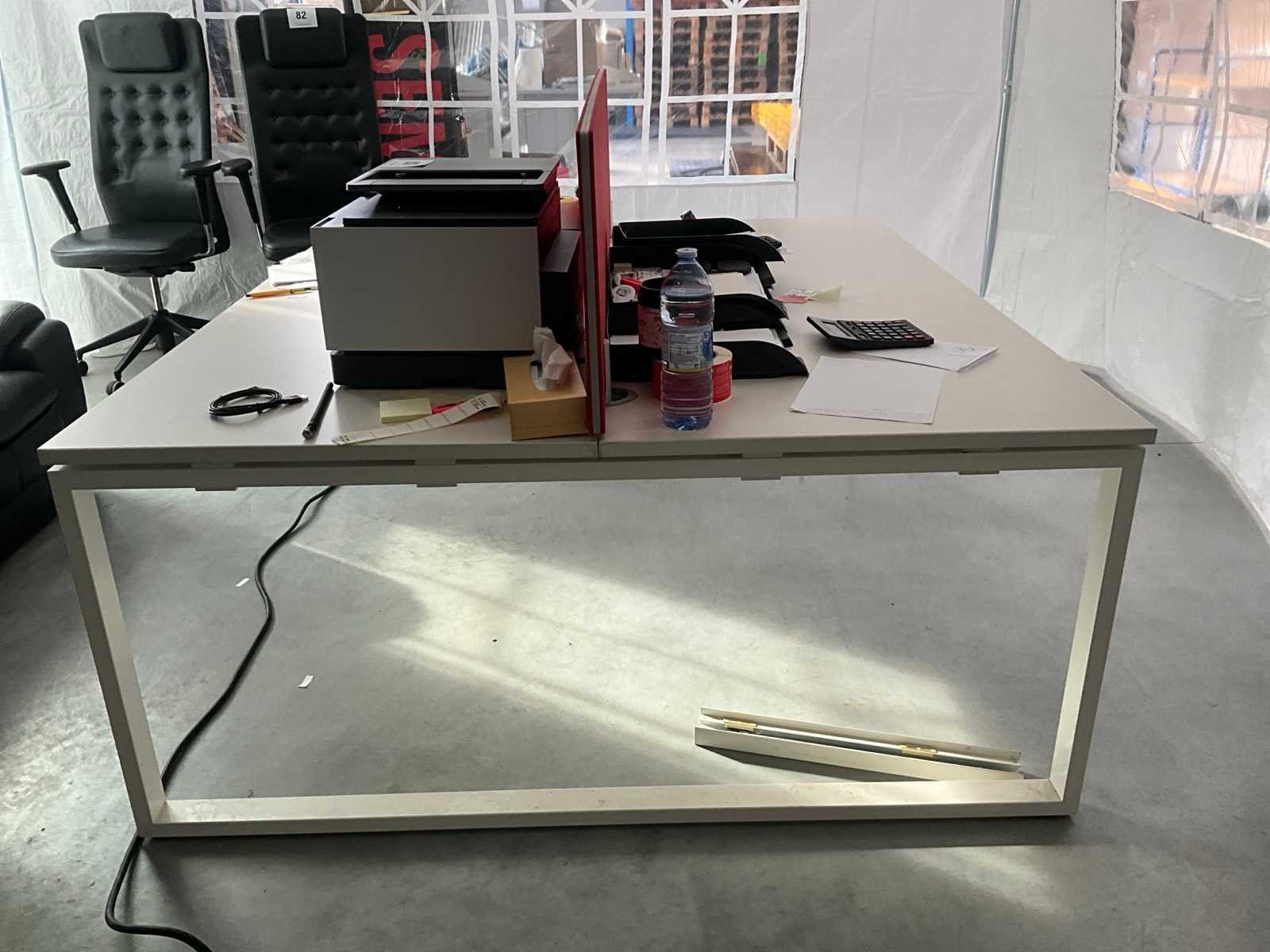 Voorzien van scheidingswand hoogte 42cm. Compleet met verrijdbaar ladeblok, bureaustoel, whiteboard Legamaster 120 x 90cm, metalen kapstok en parablubak0 en enig bureaumateriaal, HP printer NIET inbegrepen. Nee Merk: Haworth Type: 2-persoons Lengte: 180cm Breedte: 160cm Hoogte: 72cm