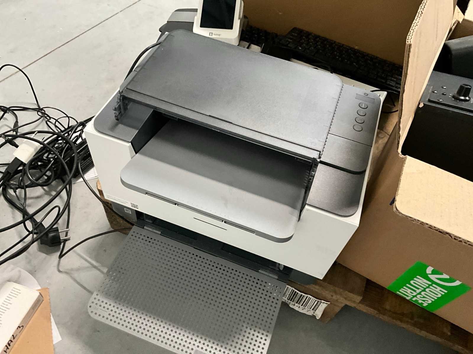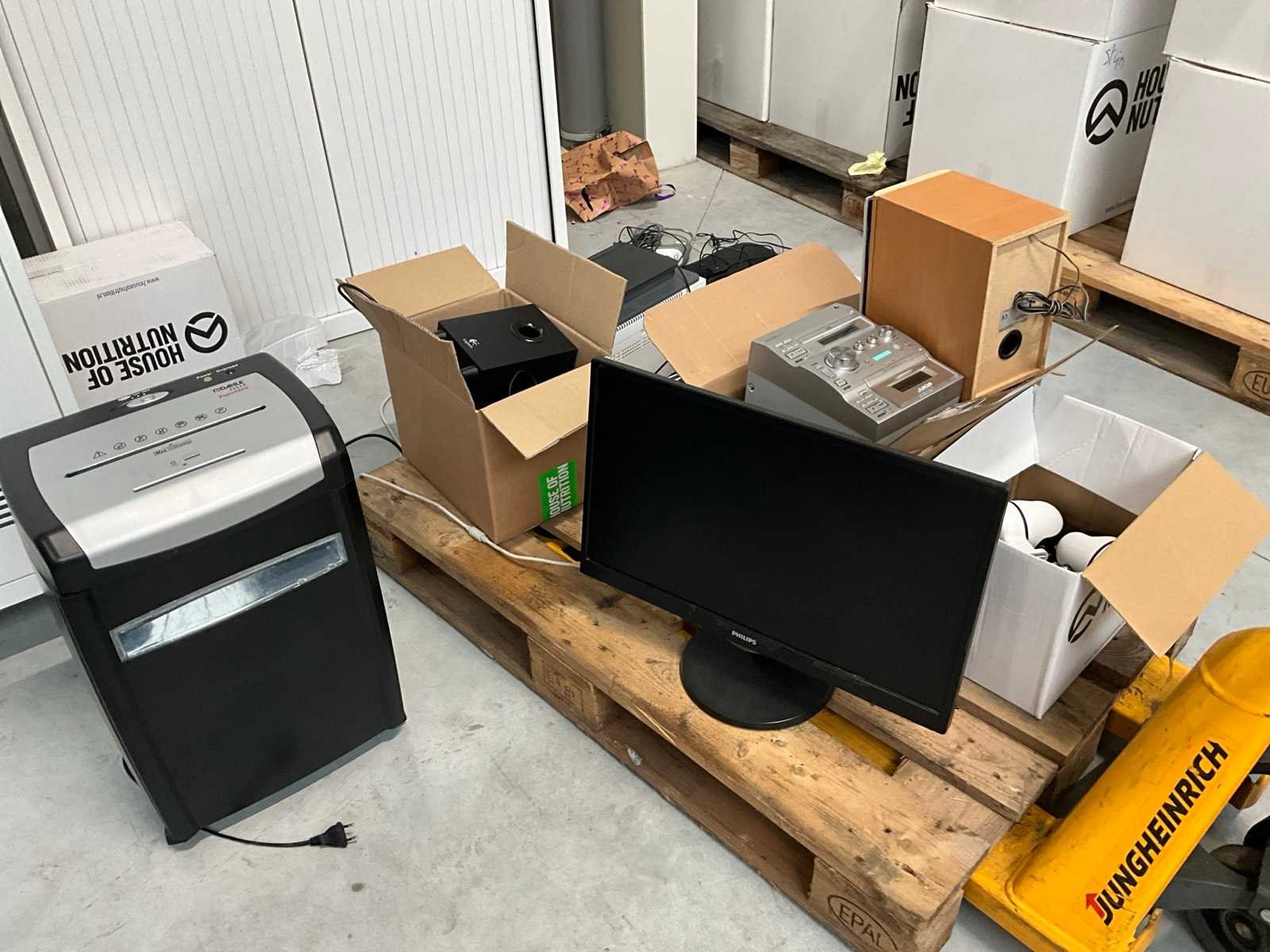 Waaronder bestaande uit: 2 luidsprekers compleet met Subwoofer Logitech, 3 bewakingscamera's TAPO, 1 inktjetprinter HP, MO,ITOR philips, papierversnipperaar Rodahle, microketen Sony, 3x handscanner datalogic voorzien van 1 lader en houder, enige diverse toetsenborden, etc, Liggende op 1 pallet Nee Type: Partij