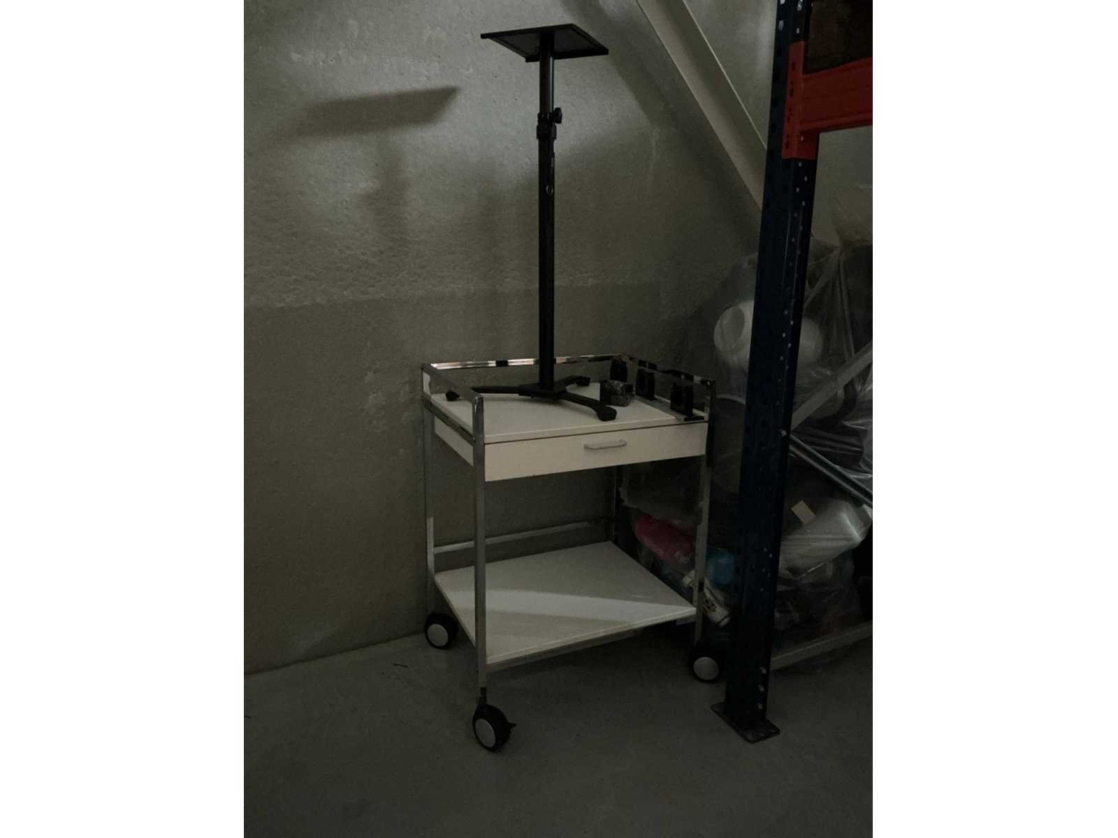 Voorzien van 1 legger en 1 lade, compleet met telescopische staander Omnitronic Nee Type: Verrijdbare Lengte: 64cm Breedte: 48cm Hoogte: 85cm Materiaal: Chromé/Fineerhout