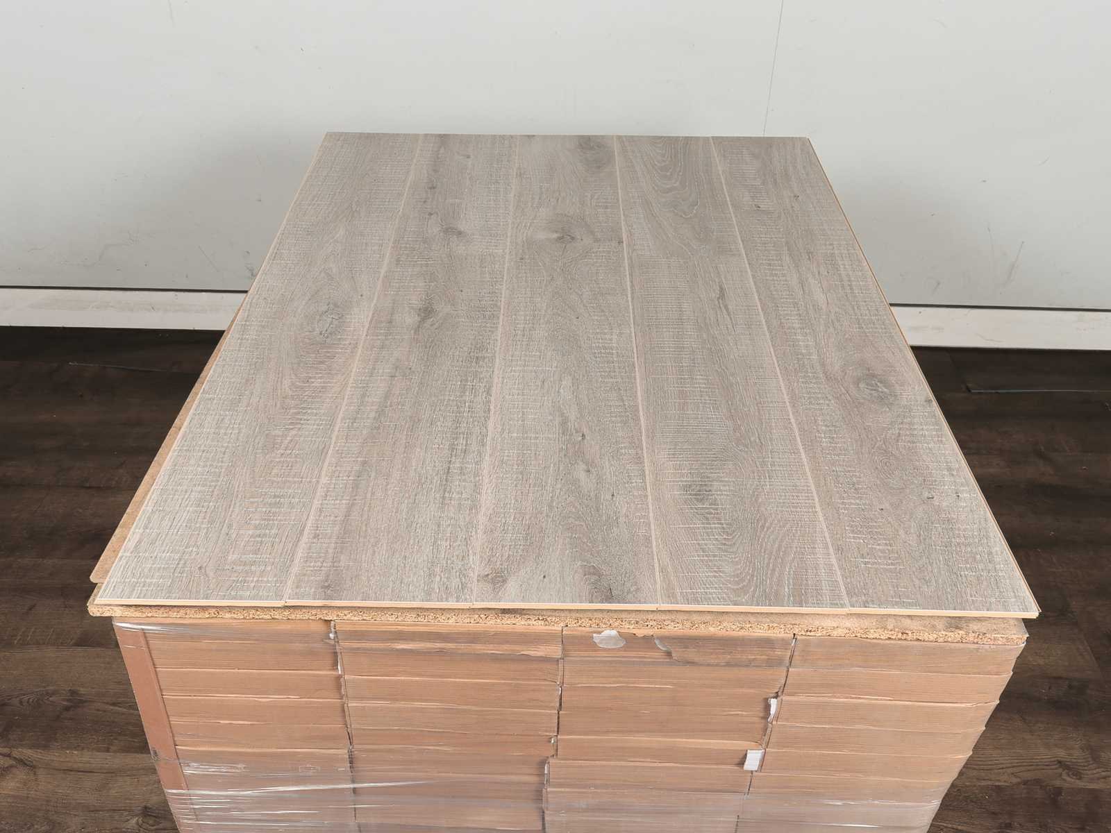 Kwaliteits laminaat vloer, dikte 7 mm, voorzien van clicksysteem, goed te combineren met vloerverwarming, kras en slijtvast, anti slip, gemakkelijk schoon te maken, warm en comfortabel, 51 pakken a 2,42 m2 No Merk: Quick floors Product type: Laminaat Oppervlakte: 123m² Geschikt voor vloerverwarming: Ja V-groef: Ja Afwerking: Voelbaar structuur, anti slip, met v-groef Aantal m² per verpakking: 2.42m² Kleur: Zacht grijs eiken 916 Gewicht: 865kg Lengte: 1261mm Breedte: 192mm Materiaal: HDF/MDF