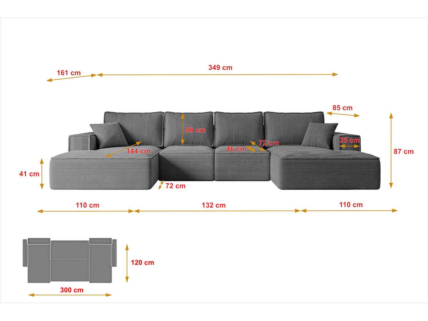 Touwrelatie Kleur Donkergrijs - Poso 115 U-vormige positioneringsoptie De beschrijving van de POSO-stof is een zacht aanvoelende, geribbelde pol (35.000 Martindale-cycli), een gemakkelijk schoonmaakbare, lichtbestendige (5) en pilbestendige (5) bekledingsstof met een gewicht van 380 g/m² ±5%. Materiaalsamenstelling 90% polyester, 10% nylon Pillingweerstand 5 Schuurbestendigheid 5 slijtbestand 30.000 Martindale-cycli Uitrustingskussen Woonkamer diepte 161 cm Breedte 349 cm Hoogte 87 cm Slaapfunctie Met slaapfunctie Aantal zetels: 8 zitvulling Wave veer + HR35 en T30 schuim Aantal rugkussens 4 Rugkussentype rugkussen Aantal zitkussens 4 Aantal decoratieve kussens 2 Armleuningsdiepte 85 cm armleuningbreedte 25 cm Armleuninghoogte 57 cm Breedte van de pouf 110 cm Ottomaanse Rijksdiepte 144 cm Zitdiepte 46 cm Zithoogte 41 cm Opslagruimtetype: gesloten binnencompartiment Lengte van het slaapgebied 300 cm Breedte van het slaapgebied 120 cm Lighoogte 41 cm Non