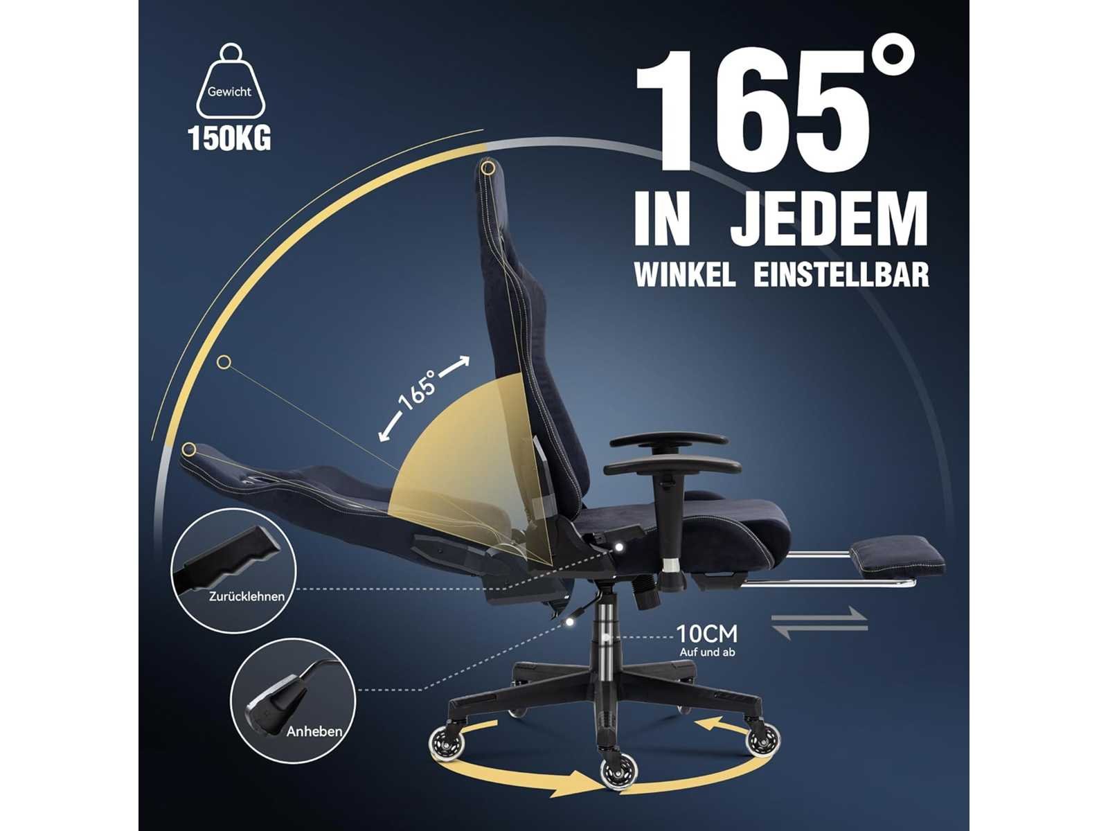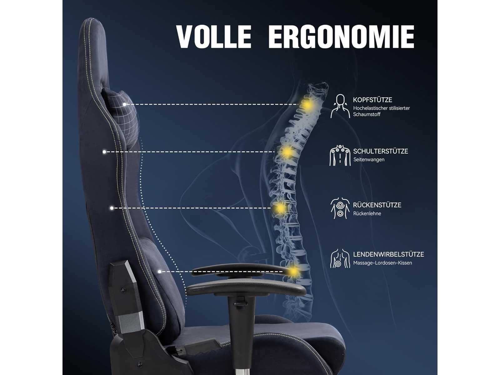 LUXE AUTOSTOELERVARING Om je de beste game-ervaring te bieden, hebben we zorgvuldig een stof gekozen die er extreem uitziet als luxe autointerieurs. De kleuren variëren afhankelijk van het omgevingslicht. Zacht en resistent, het biedt een uitzonderlijke touch. In tegenstelling tot leren stoelen is deze stof ademend en koelend, en minimaliseert het zweten in de zomer. Het 8H zitkussen is gemaakt van 10 cm dik zacht schuim met hoogdichte vulling, ideaal voor lange gamen of werksessies. De geïntegreerde massagefunctie van het lendenkussen ontspant effectief de spieren en zorgt voor een gevoel van welzijn. Dit maakt de Dowinx gamingstoel de ideale keuze voor een moderne speelruimte of kantoor. ZIJDEN SWIVEL: Vijf grote 64mm wielen draaien 360 graden voor soepelere beweging. Hoogwaardige wielen voor een betere laadcapaciteit. Veelzijdige verstelmogelijkheid: De rugleuning kan achterover leunen van 90° voor geconcentreerd zitten tot 165° voor ontspannen zitten. De 2D-armleuningen zijn verstelbaar in hoogte en kanteling voor optimale armondersteuning. Uitschuifbare voetsteun voor verschillende ontspanningsposities. Hoogwaardige accessoires: aluminium frame bekleed met hoogwaardige suède en een zitting gemaakt van 10 cm dik hoogdicht schuim. De verbeterde LANT-cilinders en mechanismen verlengen de levensduur van de gamingstoel aanzienlijk. Non