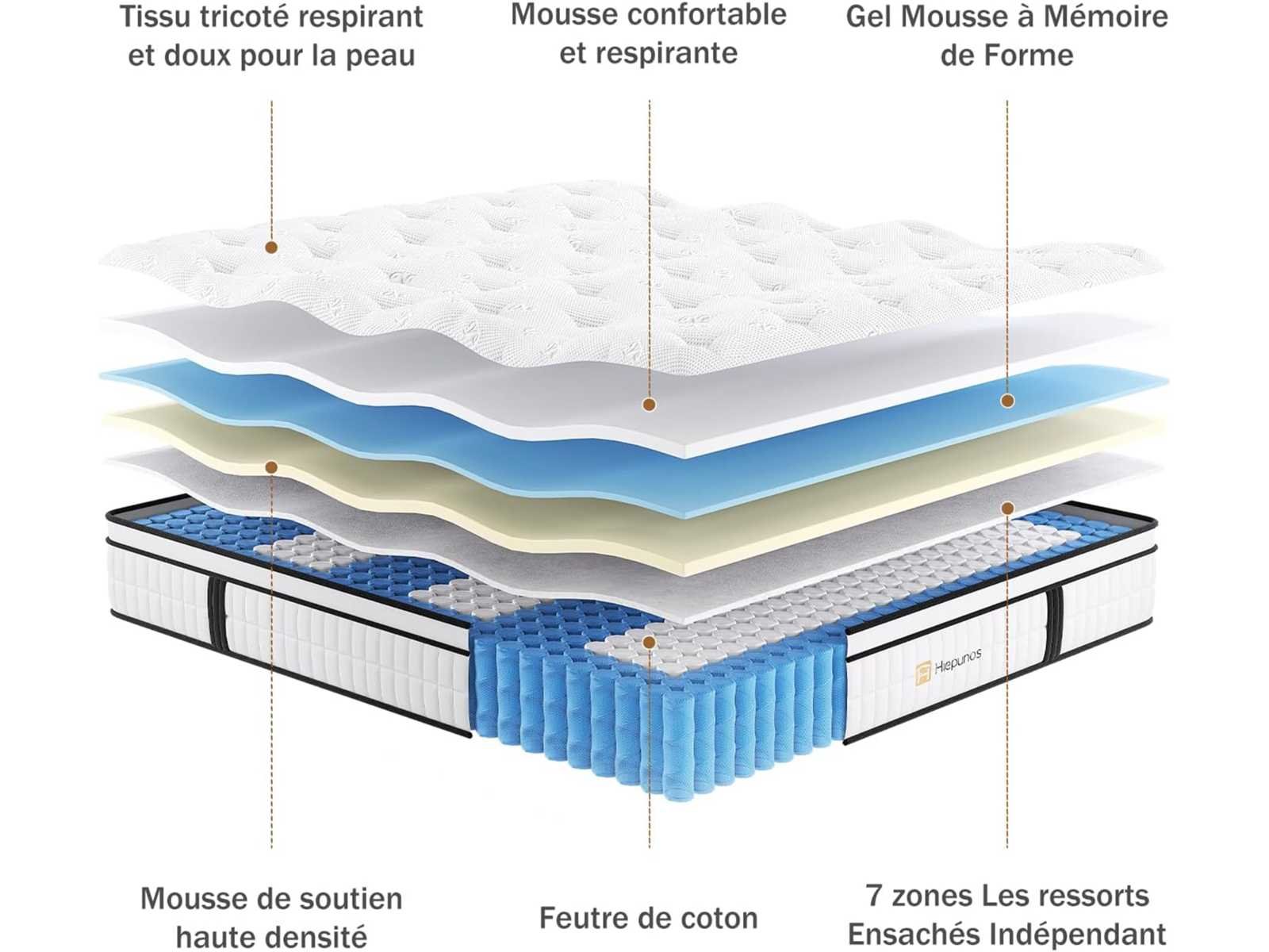 Traagschuimmatras met onafhankelijke pocketveren, 7 comfortzones, H3 H4 medium stevig, duurzaam, perfecte ondersteuning Slaap zonder verstoring: Het Hiepunos-matras heeft een 7-zone pocketveerontwerp dat zich aanpast aan verschillende delen van het lichaam om drukpunten te regelen en slaaponafhankelijkheid te bieden, waardoor bewegingsinterferentie tussen partners effectief wordt voorkomen wanneer je partner zich omdraait of uit bed ontwaakt, zodat je elke nacht comfortabel kunt slapen. Stabiele en comfortabele ondersteuning: Het materiaal en de structuur van het Hiepunos hybride matras bieden uitzonderlijk comfort. Het zorgvuldig doordachte ontwerp biedt de juiste ondersteuning voor elk deel van het lichaam en past zich perfect aan alle lichaamstypes, gewichten en slaaphoudingen aan. Het keert snel terug naar zijn oorspronkelijke vorm, geschikt voor maag-, rug- of zijslapers. De versterkte rand voorkomt dat het matras doorzakt tijdens het zitten. Ademend en veilig materiaal: De bovenste laag van ons matras is gemaakt van een zachte, ademende en huidvriendelijke gebreide stof. Het zorgt ervoor dat het matras kan "ademen", warmte kan afvoeren en vocht kan absorberen. Het helpt om de hele nacht een comfortabele temperatuur te behouden en zorgt voor een koele en comfortabele slaapomgeving voor jou en je gezin. Veiligheidscertificering: Hiepunos matrassen. De materialen die in de matrassen worden gebruikt zijn strikt gecertificeerd, met Oeko-Tex Standard 100 Oeko-Tex gecertificeerde stoffen, en ons schuim is gecertificeerd door CertiPUR-American Memory Foam. De kwaliteit en veiligheid zijn goed gewaarborgd, en je kunt het met vertrouwen gebruiken. Non