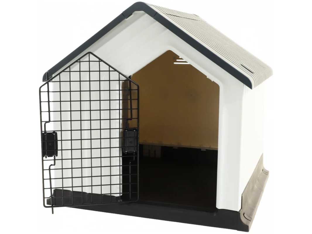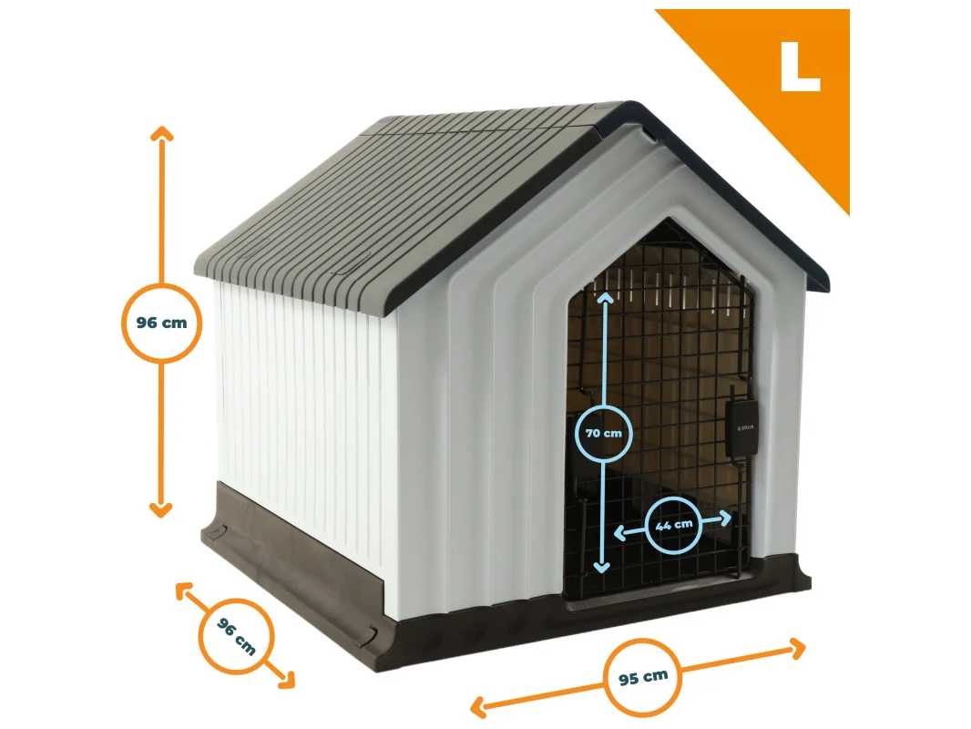 Hondenhok van polypropyleen - 3 Dakkleuren: Donkergrijs / Blauw / Rood - Binnen- of buitengebruik - met een ijzeren deur die je naar wens kunt installeren - Maat L - Externe afmetingen (inclusief dak): 96 x 96 x 95 cm - Interne afmetingen: 80 x 80 x 89 (maximale hoogte) - 63 cm (minimum hoogte) - Openingsafmetingen: 44 x 70 cm - hoogte versus vloer: 5 cm - Metalen deurgaas (uitneembaar): 3x3 cm Non